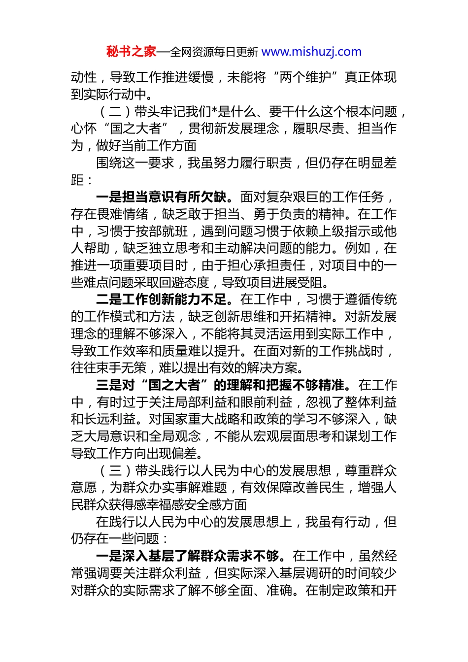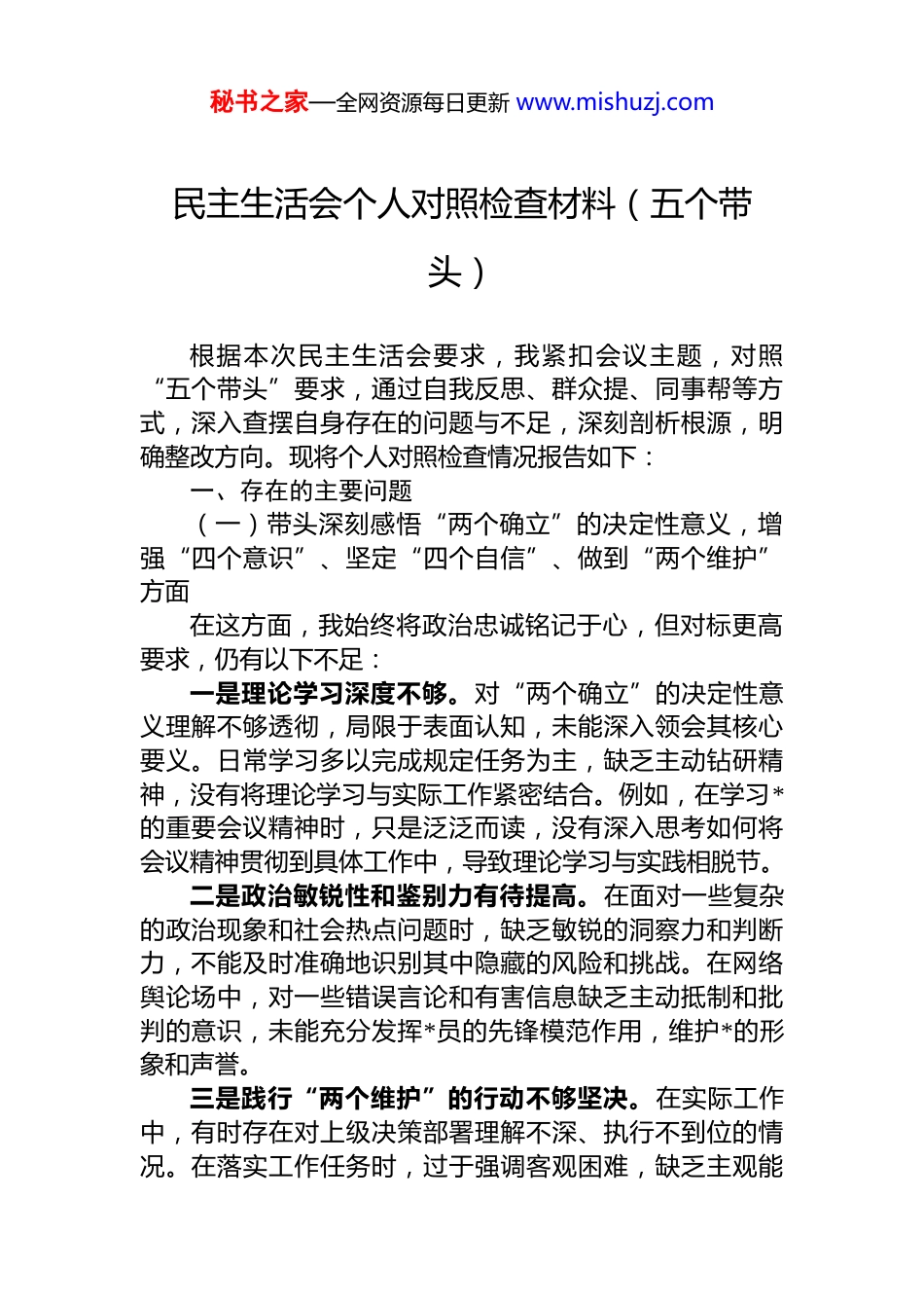 秘书之家—全网资源每日更新 www.mishuzj.com民主生活会个人对照检查材料(五个带头)根据本次民主生活会要求,我紧扣会议主题,对照“五个带头”要求,通过自我反思、群众提、同事帮等方式,深入查摆自身存在的问题与不足,深刻剖析根源,明确整改方向。现将个人对照检查情况报告如下:一、存在的主要问题(一)带头深刻感悟“两个确立”的决定性意义,增强“四个意识”、坚定“四个自信”、做到“两个维护”方面在这方面,我始终将政治忠诚铭记于心,但对标更高要求,仍有以下不足:一是理论学习深度不够。对“两个确立”的决定性意义理解不够透彻,局限于表面认知,未能深入领会其核心要义。日常学习多以完成规定任务为主,缺乏主动钻研精神,没有将理论学习与实际工作紧密结合。例如,在学习*的重要会议精神时,只是泛泛而读,没有深入思考如何将会议精神贯彻到具体工作中,导致理论学习与实践相脱节。二是政治敏锐性和鉴别力有待提高。在面对一些复杂的政治现象和社会热点问题时,缺乏敏锐的洞察力和判断力,不能及时准确地识别其中隐藏的风险和挑战。在网络舆论场中,对一些错误言论和有害信息缺乏主动抵制和批判的意识,未能充分发挥*员的先锋模范作用,维护*的形象和声誉。三是践行“两个维护”的行动不够坚决。在实际工作中,有时存在对上级决策部署理解不深、执行不到位的情况。在落实工作任务时,过于强调客观困难,缺乏主观能秘书之家—全网资源每日更新 www.mishuzj.com动性,导致工作推进缓慢,未能将“两个维护”真正体现到实际行动中。(二)带头牢记我们*是什么、要干什么这个根本问题,心怀“国之大者”,贯彻新发展理念,履职尽责、担当作为,做好当前工作方面围绕这一要求,我虽努力履行职责,但仍存在明显差距:一是担当意识有所欠缺。面对复杂艰巨的工作任务,存在畏难情绪,缺乏敢于担当、勇于负责的精神。在工作中,习惯于按部就班,遇到问题习惯于依赖上级指示或他人帮助,缺乏独立思考和主动解决问题的能力。例如,在推进一项重要项目时,由于担心承担责任,对项目中的一些难点问题采取回避态度,导致项目进展受阻。二是工作创新能力不足。在工作中,习惯于遵循传统的工作模式和方法,缺乏创新思维和开拓精神。对新发展理念的理解不够深入,不能将其灵活运用到实际工作中,导致工作效率和质量难以提升。在面对新的工作挑战时,往往束手无策,难以提出有效的解决方案。三是对“国之大者”的理解和把握不够精准。在工作中,有时过于关注局部利益和眼前利益,忽视了整体利益和长远利益。对国家重大战略和政策的学习不够深入,缺乏大局意识和全局观念,不能从宏观层面思考和谋划工作导致工作方向出现偏差。(三)带头践行以人民为中心的发展思想,尊重群众意愿,为群众办实事解难题,有效保障改善民生,增强人民群众获得感幸福感安全感方面在践行以人民为中心的发展思想上,我虽有行动,但仍存在一些问题:一是深入基层了解群众需求不够。在工作中,虽然经常强调要关注群众利益,但实际深入基层调研的时间较少对群众的实际需求了解不够全面、准确。在制定政策和开秘书之家—全网资源每日更新 www.mishuzj.com展工作时,往往缺乏对群众意见的充分征求和考虑,导致一些工作未能真正满足群众的需求。二是为群众办实事的成效不够显著。在解决群众实际问题时,有时存在形式主义倾向,注重表面功夫,忽视实际效果。在处理群众反映的问题时,虽然采取了一些措施但问题解决不够彻底,导致群众满意度不高。例如,在处理群众反映的某一民生问题时,只是进行了简单的答复和解释,没有从根本上解决问题,导致群众多次反映。三是群众工作方法不够灵活。在与群众沟通交流时,有时缺乏耐心和亲和力,不能很好地倾听群众的意见和诉求。在处理群众矛盾纠纷时,方法简单粗暴,缺乏有效的沟通技巧和调解能力,导致矛盾激化,影响社会和谐稳定。(四)带头学习运用*在不同历史时期成功应对风险挑战的丰富经验,增强忧患意识,保持战略定力,提高能力本领,敢于斗争、善于斗争,不断取得新的胜利和荣光方面在学习运用*的历史经验应对风险挑战方面,我存在以下不足:一是对*的历...