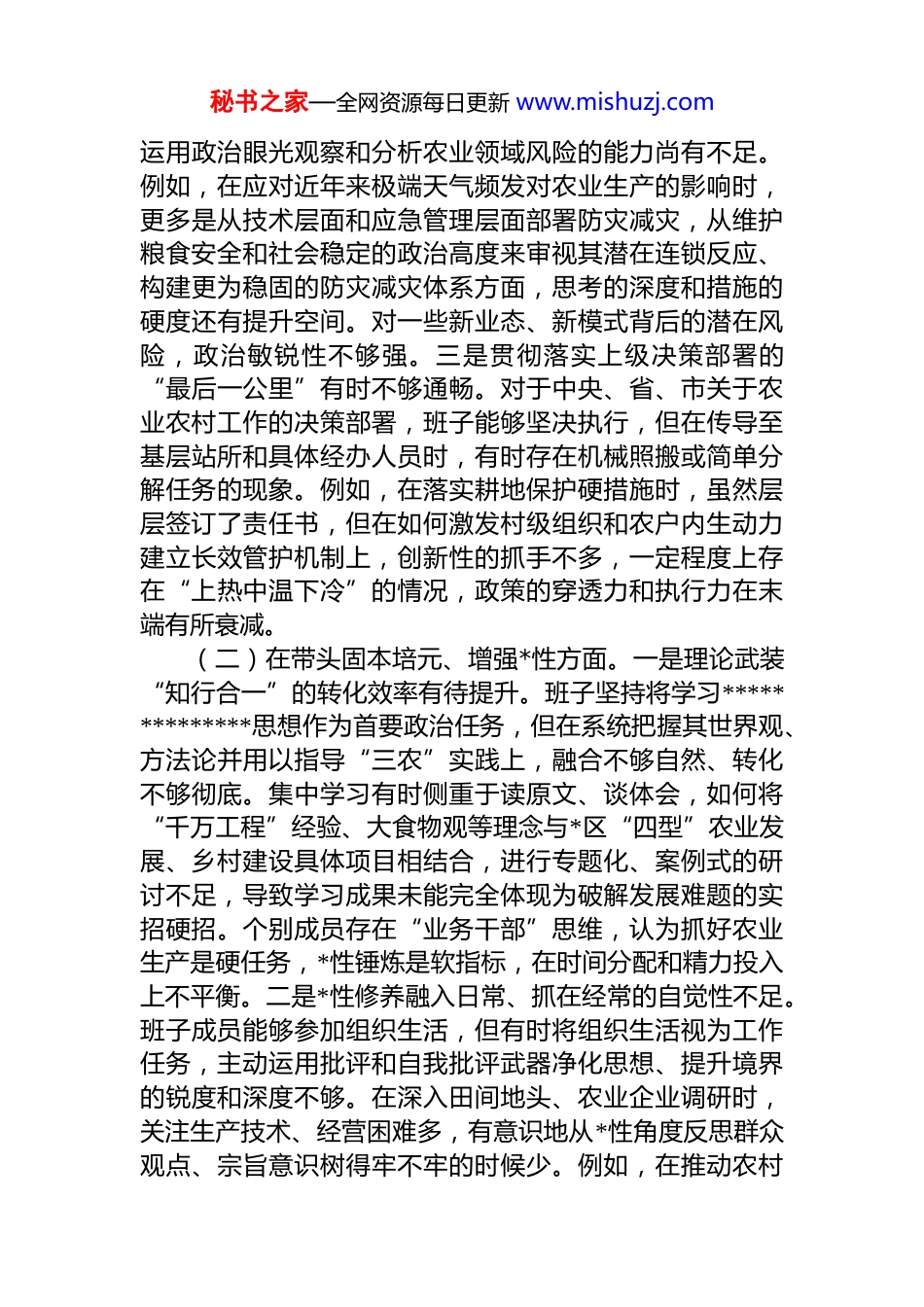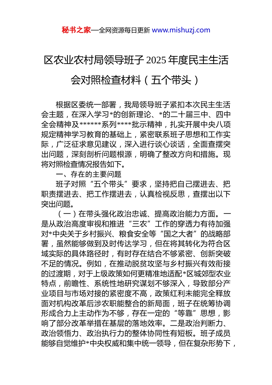 秘书之家—全网资源每日更新 www.mishuzj.com区农业农村局领导班子 2025 年度民主生活会对照检查材料(五个带头)根据区委统一部署,我局领导班子紧扣本次民主生活会主题,在深入学习*的创新理论、*的二十届三中、四中全会精神及******系列****批示精神,扎实开展中央八项规定精神学习教育的基础上,紧密联系班子思想和工作实际,广泛征求意见建议,深入进行谈心谈话,全面查摆突出问题,深刻剖析问题根源,明确了整改方向和措施。现将对照检查情况报告如下。一、存在的主要问题班子对照“五个带头”要求,坚持把自己摆进去、把职责摆进去、把工作摆进去,认真检视反思,查摆出以下突出问题。(一)在带头强化政治忠诚、提高政治能力方面。一是从政治高度审视和推进“三农”工作的穿透力有待加强对*中央关于乡村振兴、粮食安全等“国之大者”的战略部署,虽然能够做到及时传达学习,但在将其转化为符合区域实际的具体路径时,有时存在结合不够紧密、创新突破不足的情况。例如,在推动脱贫攻坚与乡村振兴有效衔接的过渡期,对于上级政策如何更精准地适配*区城郊型农业特点,前瞻性、系统性地研究谋划不够深入,导致部分产业项目与市场对接的紧密度不高,政策红利未能完全释放面对机构改革后涉农职能整合的新局面,班子在统筹协调形成合力上主动作为不够,存在一定的“等靠”思想,影响了部分改革举措在基层的落地效率。二是政治判断力、政治领悟力、政治执行力的整体协同性有短板。班子成员能够自觉维护*中央权威和集中统一领导,但在复杂形势下,秘书之家—全网资源每日更新 www.mishuzj.com运用政治眼光观察和分析农业领域风险的能力尚有不足。例如,在应对近年来极端天气频发对农业生产的影响时,更多是从技术层面和应急管理层面部署防灾减灾,从维护粮食安全和社会稳定的政治高度来审视其潜在连锁反应、构建更为稳固的防灾减灾体系方面,思考的深度和措施的硬度还有提升空间。对一些新业态、新模式背后的潜在风险,政治敏锐性不够强。三是贯彻落实上级决策部署的“最后一公里”有时不够通畅。对于中央、省、市关于农业农村工作的决策部署,班子能够坚决执行,但在传导至基层站所和具体经办人员时,有时存在机械照搬或简单分解任务的现象。例如,在落实耕地保护硬措施时,虽然层层签订了责任书,但在如何激发村级组织和农户内生动力建立长效管护机制上,创新性的抓手不多,一定程度上存在“上热中温下冷”的情况,政策的穿透力和执行力在末端有所衰减。(二)在带头固本培元、增强*性方面。一是理论武装“知行合一”的转化效率有待提升。班子坚持将学习**************思想作为首要政治任务,但在系统把握其世界观、方法论并用以指导“三农”实践上,融合不够自然、转化不够彻底。集中学习有时侧重于读原文、谈体会,如何将“千万工程”经验、大食物观等理念与*区“四型”农业发展、乡村建设具体项目相结合,进行专题化、案例式的研讨不足,导致学习成果未能完全体现为破解发展难题的实招硬招。个别成员存在“业务干部”思维,认为抓好农业生产是硬任务,*性锤炼是软指标,在时间分配和精力投入上不平衡。二是*性修养融入日常、抓在经常的自觉性不足。班子成员能够参加组织生活,但有时将组织生活视为工作任务,主动运用批评和自我批评武器净化思想、提升境界的锐度和深度不够。在深入田间地头、农业企业调研时,关注生产技术、经营困难多,有意识地从*性角度反思群众观点、宗旨意识树得牢不牢的时候少。例如,在推动农村秘书之家—全网资源每日更新 www.mishuzj.com人居环境整治工作中,有时更看重检查评比的数据和排名对整治过程给群众生产生活带来的不便以及如何建立群众广泛参与的长效机制,从*性立场出发进行换位思考、倾注真情实感不够。三是理想信念的实践砥砺作用发挥不充分班子成员总体理想信念坚定,但将其转化为攻坚克难的持久动力和昂扬斗志方面,存在波动。面对农业产业发展中的土地、环保、资金等瓶颈制约,有时会产生畏难情绪,习惯于向上级要政策、要资源,立足自身、开拓创新、敢闯敢试的劲头有所减弱。在引导全局*员干部将个人理想融入乡村振兴伟大事业,...