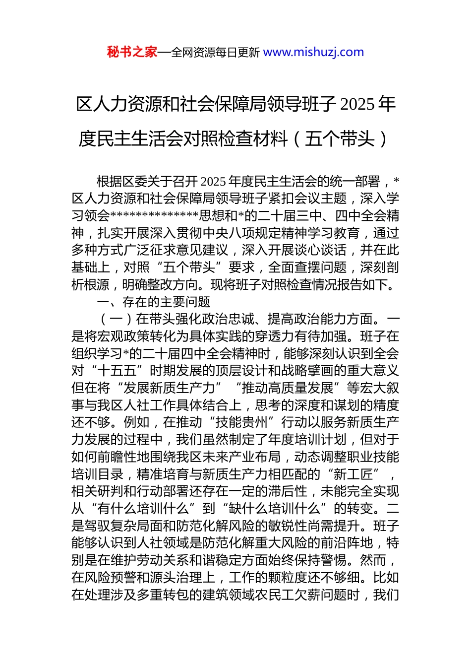 秘书之家—全网资源每日更新 www.mishuzj.com区人力资源和社会保障局领导班子 2025 年度民主生活会对照检查材料(五个带头)根据区委关于召开 2025 年度民主生活会的统一部署,*区人力资源和社会保障局领导班子紧扣会议主题,深入学习领会**************思想和*的二十届三中、四中全会精神,扎实开展深入贯彻中央八项规定精神学习教育,通过多种方式广泛征求意见建议,深入开展谈心谈话,并在此基础上,对照“五个带头”要求,全面查摆问题,深刻剖析根源,明确整改方向。现将班子对照检查情况报告如下。一、存在的主要问题(一)在带头强化政治忠诚、提高政治能力方面。一是将宏观政策转化为具体实践的穿透力有待加强。班子在组织学习*的二十届四中全会精神时,能够深刻认识到全会对“十五五”时期发展的顶层设计和战略擘画的重大意义但在将“发展新质生产力”“推动高质量发展”等宏大叙事与我区人社工作具体结合上,思考的深度和谋划的精度还不够。例如,在推动“技能贵州”行动以服务新质生产力发展的过程中,我们虽然制定了年度培训计划,但对于如何前瞻性地围绕我区未来产业布局,动态调整职业技能培训目录,精准培育与新质生产力相匹配的“新工匠”,相关研判和行动部署还存在一定的滞后性,未能完全实现从“有什么培训什么”到“缺什么培训什么”的转变。二是驾驭复杂局面和防范化解风险的敏锐性尚需提升。班子能够认识到人社领域是防范化解重大风险的前沿阵地,特别是在维护劳动关系和谐稳定方面始终保持警惕。然而,在风险预警和源头治理上,工作的颗粒度还不够细。比如在处理涉及多重转包的建筑领域农民工欠薪问题时,我们秘书之家—全网资源每日更新 www.mishuzj.com的工作重心更多放在事后的追讨和调处上,通过联席会议等方式化解矛盾。但在事前预防方面,如何利用信息化手段动态监控重点项目工资支付情况、如何强化与住建等部门的数据共享和协同监管,建立更有效的欠薪预警机制,从而将风险化解在萌芽状态,这方面的制度性安排和技术性探索还不够深入,有时显得较为被动。三是运用政治眼光观察分析问题的能力仍有差距。班子成员在理论学习中心组学习中,能够做到原原本本学、及时跟进学,但将学习成果内化为政治判断力、政治领悟力、政治执行力的过程还不够顺畅。在一些*组会议的讨论中,对于如何从讲政治的高度审视社保基金的可持续发展、就业结构的系统性矛盾等深层次问题,有时讨论分析还停留在业务层面,未能充分从巩固*的执政基础、维护社会大局稳定的政治高度来谋划长远之策,导致一些工作的战略性、前瞻性不足。(二)在带头固本培元、增强*性方面。一是运用*的创新理论解决现实难题的自觉性不够强。班子始终坚持用**************思想凝心铸魂,但在将思想伟力转化为攻坚克难的实际成效上还存在差距。面对我区高校毕业生“慢就业”“缓就业”现象与企业“招工难”并存的结构性就业矛盾我们虽然推出了一系列就业帮扶措施,如举办招聘会、提供见习岗位等,但对于如何运用新发展理念,从供需两端同时发力,引导高校调整专业设置、深化校企合作以及如何更有效地激发毕业生到基层、到实体经济建功立业的内生动力,所采取的措施创新性不足,破解深层次矛盾的“金钥匙”找得还不够准。二是在直面矛盾和挑战时缺乏“啃硬骨头”的韧劲。班子成员在工作中能够保持昂扬的士气,但在一些长期存在、推进难度大的“老大难”问题面前,有时会滋生畏难情绪和“缓一缓”的想法。例如,在推进社会保险制度改革,特别是针对新业态从业人员、灵活就业人员的参保扩面工作时,尽管我们清楚认识到这是社会保障体系的短板,也开展了“社保服务进万秘书之家—全网资源每日更新 www.mishuzj.com家”等宣传活动,但面对该群体流动性大、参保意愿不强缴费能力不一等现实困难,缺乏一抓到底的恒心和更有创造性的工作方法,导致这项工作的进展未达到预期,与“应保尽保”的目标仍有距离。三是*性锤炼融入日常、抓在经常的力度有所减弱。班子注重通过集体学习、专题研讨等方式加强*性修养,但有时存在“一阵风”现象,未能完全做到常态长效。在 dj 与业务工作的深度融合上,还存在一...