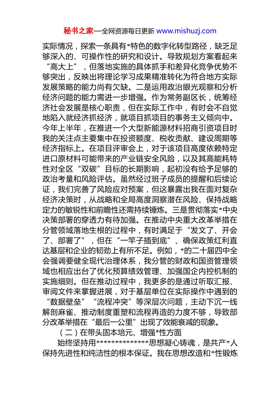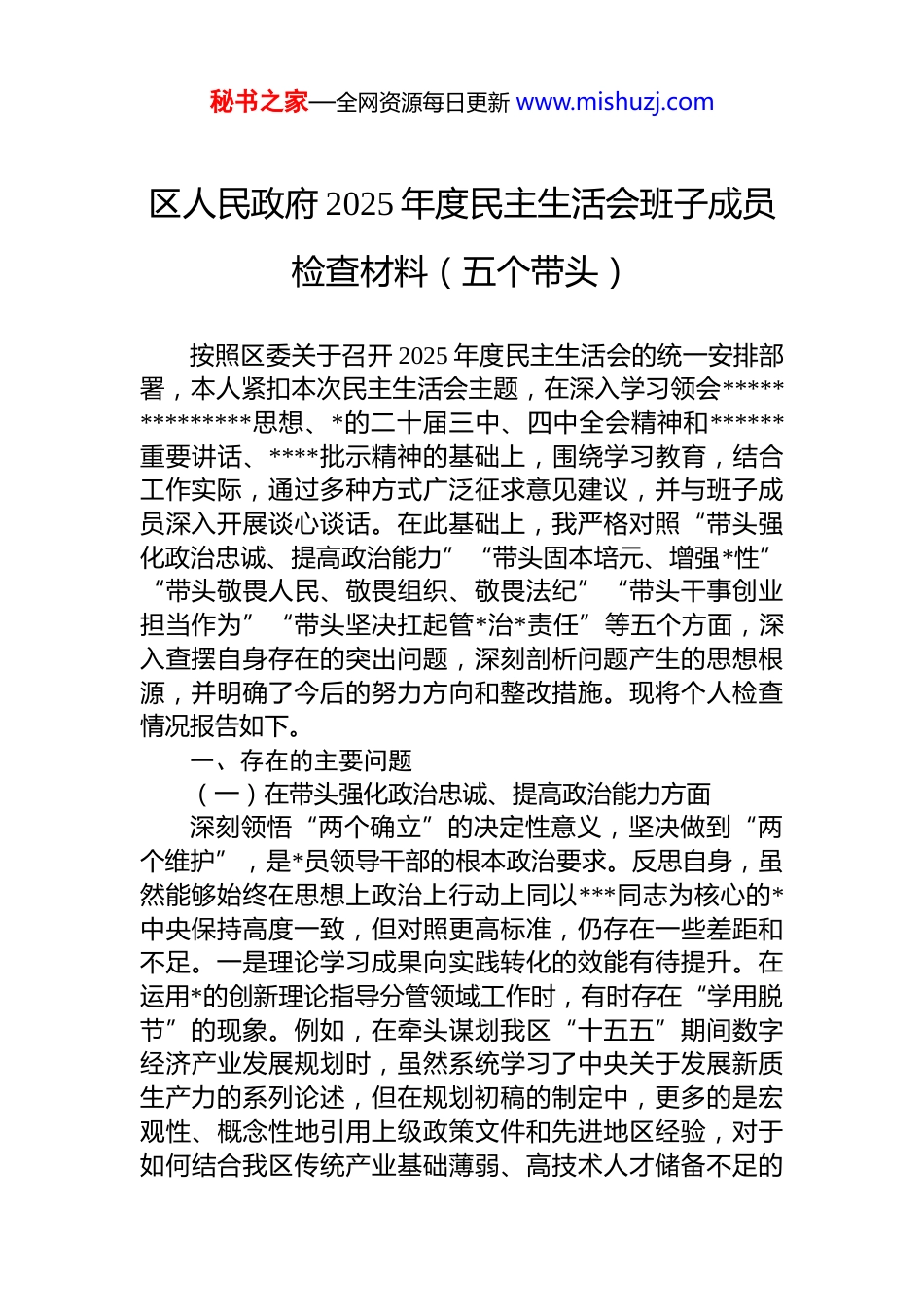秘书之家—全网资源每日更新 www.mishuzj.com区人民政府 2025 年度民主生活会班子成员检查材料(五个带头)按照区委关于召开 2025 年度民主生活会的统一安排部署,本人紧扣本次民主生活会主题,在深入学习领会**************思想、*的二十届三中、四中全会精神和******重要讲话、****批示精神的基础上,围绕学习教育,结合工作实际,通过多种方式广泛征求意见建议,并与班子成员深入开展谈心谈话。在此基础上,我严格对照“带头强化政治忠诚、提高政治能力”“带头固本培元、增强*性”“带头敬畏人民、敬畏组织、敬畏法纪”“带头干事创业担当作为”“带头坚决扛起管*治*责任”等五个方面,深入查摆自身存在的突出问题,深刻剖析问题产生的思想根源,并明确了今后的努力方向和整改措施。现将个人检查情况报告如下。一、存在的主要问题(一)在带头强化政治忠诚、提高政治能力方面深刻领悟“两个确立”的决定性意义,坚决做到“两个维护”,是*员领导干部的根本政治要求。反思自身,虽然能够始终在思想上政治上行动上同以***同志为核心的*中央保持高度一致,但对照更高标准,仍存在一些差距和不足。一是理论学习成果向实践转化的效能有待提升。在运用*的创新理论指导分管领域工作时,有时存在“学用脱节”的现象。例如,在牵头谋划我区“十五五”期间数字经济产业发展规划时,虽然系统学习了中央关于发展新质生产力的系列论述,但在规划初稿的制定中,更多的是宏观性、概念性地引用上级政策文件和先进地区经验,对于如何结合我区传统产业基础薄弱、高技术人才储备不足的秘书之家—全网资源每日更新 www.mishuzj.com实际情况,探索一条具有*特色的数字化转型路径,缺乏足够深入的、可操作性的研究和设计。导致规划方案看起来“高大上”,但落地实施的具体抓手和差异化竞争优势不够突出,反映出将理论学习成果精准转化为符合地方实际发展策略的能力尚有欠缺。二是运用政治眼光观察和分析经济问题的能力需进一步增强。作为常务副区长,统筹经济社会发展是核心职责,但在实际工作中,有时会不自觉地陷入就经济抓经济,就项目抓项目的事务主义倾向中。今年上半年,在推进一个大型新能源材料招商引资项目时我的关注点主要集中在投资额度、税收贡献、建设周期等经济指标上。在项目评审会上,对于该项目高度依赖特定进口原材料可能带来的产业链安全风险,以及其高能耗特性对全区“双碳”目标的长期影响,起初没有给予足够的政治考量和风险评估。虽然经过班子成员的提醒和后续论证,我们完善了风险应对预案,但这暴露出我在面对复杂经济决策时,从战略和全局高度洞察潜在风险、保持战略定力的敏锐性和前瞻性还需持续锤炼。三是贯彻落实*中央决策部署的穿透力有待加强。在推动中央重大改革举措在分管领域落地生根的过程中,有时满足于“发文了、开会了、部署了”,但在“一竿子插到底”、确保政策红利直达基层和企业的韧劲上有所不足。例如,*的二十届四中全会强调要健全现代治理体系,我分管的财政和国资管理领域也相应出台了优化预算绩效管理、加强国企内控机制的实施细则。但在推动过程中,我更多的是通过听取汇报、审阅文件来掌握进展,对于基层单位在实际操作中遇到的“数据壁垒”“流程冲突”等深层次问题,主动下沉一线解剖麻雀、推动制度重塑和流程再造的力度不够,导致部分改革举措在“最后一公里”出现了效能衰减的现象。(二)在带头固本培元、增强*性方面始终坚持用**************思想凝心铸魂,是共产*人保持先进性和纯洁性的根本保证。我在思想改造和*性锻炼秘书之家—全网资源每日更新 www.mishuzj.com上从未放松,但静心反思,仍感到在“内化于心、外化于行”上做得不够到位。一是在持之以恒的*性淬炼上存在标准不高的问题。作为区政府常务副职,日常工作千头万绪特别是项目建设、经济运行分析等任务压头时,容易产生“以干代学”的心理,不自觉地放松了对*性修养的持续锤炼。有时参加*组理论学习中心组学习或所在支部的组织生活,虽然能够做到全程参与,但在思想深处,偶尔会将其视为一项必须完成的“规定动作”,主动思考、深入研讨的劲头不足,满足于“学过了、记下...