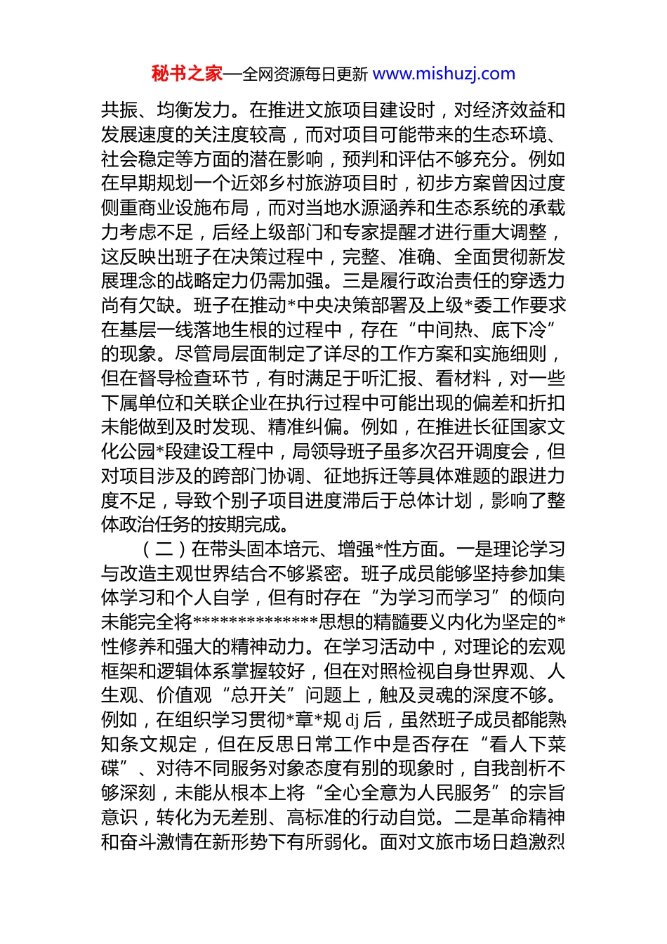 秘书之家—全网资源每日更新 www.mishuzj.com区文化和旅游局领导班子 2025 年度民主生活会对照检查材料(五个带头)根据区委关于召开 2025 年度民主生活会的统一部署,*区文化和旅游局领导班子紧扣会议主题,深入学习领会**************思想和*的二十届三中、四中全会精神。班子成员通过集体学习、个人自学和专题研讨,深化了对锲而不舍落实中央八项规定精神、推进作风建设常态化长效化的认识。在此基础上,班子通过座谈访谈、书面征求意见等多种方式广泛听取了*内外干部群众的意见建议,并深入开展谈心谈话。现紧密围绕“五个带头”方面,深入查摆存在的突出问题,深刻剖析问题根源,并明确今后的努力方向和整改措施。对照检查情况报告如下。一、存在的主要问题(一)在带头强化政治忠诚、提高政治能力方面。一是政治理论转化为发展动能的速率有待提升。班子在学习贯彻*中央关于文化旅游高质量发展的大政方针时,能够做到迅速响应、坚决拥护,但在将宏观政策转化为具体项目和行动方案的过程中,前瞻性和创造性略显不足。例如,在响应“旅游+”融合发展战略时,班子虽多次组织学习研讨,但在推动“红色旅游+数字科技”等新业态的具体实践上,相较于一些先进地区,项目孵化和落地速度偏慢,满足于现有红色旅游的传统展陈和讲解模式,对于运用虚拟现实(vr)、增强现实(ar)等技术丰富游客体验的探索不够大胆深入,导致政治学习成果与产业升级实践之间存在一定的“时差”。二是统筹全局、系统谋划的思维格局需进一步拓宽。在贯彻落实“稳定、发展、生态、强边”四件大事的过程中,班子有时未能完全做到各项工作的同频秘书之家—全网资源每日更新 www.mishuzj.com共振、均衡发力。在推进文旅项目建设时,对经济效益和发展速度的关注度较高,而对项目可能带来的生态环境、社会稳定等方面的潜在影响,预判和评估不够充分。例如在早期规划一个近郊乡村旅游项目时,初步方案曾因过度侧重商业设施布局,而对当地水源涵养和生态系统的承载力考虑不足,后经上级部门和专家提醒才进行重大调整,这反映出班子在决策过程中,完整、准确、全面贯彻新发展理念的战略定力仍需加强。三是履行政治责任的穿透力尚有欠缺。班子在推动*中央决策部署及上级*委工作要求在基层一线落地生根的过程中,存在“中间热、底下冷”的现象。尽管局层面制定了详尽的工作方案和实施细则,但在督导检查环节,有时满足于听汇报、看材料,对一些下属单位和关联企业在执行过程中可能出现的偏差和折扣未能做到及时发现、精准纠偏。例如,在推进长征国家文化公园*段建设工程中,局领导班子虽多次召开调度会,但对项目涉及的跨部门协调、征地拆迁等具体难题的跟进力度不足,导致个别子项目进度滞后于总体计划,影响了整体政治任务的按期完成。(二)在带头固本培元、增强*性方面。一是理论学习与改造主观世界结合不够紧密。班子成员能够坚持参加集体学习和个人自学,但有时存在“为学习而学习”的倾向未能完全将**************思想的精髓要义内化为坚定的*性修养和强大的精神动力。在学习活动中,对理论的宏观框架和逻辑体系掌握较好,但在对照检视自身世界观、人生观、价值观“总开关”问题上,触及灵魂的深度不够。例如,在组织学习贯彻*章*规 dj 后,虽然班子成员都能熟知条文规定,但在反思日常工作中是否存在“看人下菜碟”、对待不同服务对象态度有别的现象时,自我剖析不够深刻,未能从根本上将“全心全意为人民服务”的宗旨意识,转化为无差别、高标准的行动自觉。二是革命精神和奋斗激情在新形势下有所弱化。面对文旅市场日趋激烈秘书之家—全网资源每日更新 www.mishuzj.com的竞争态势和转型升级的紧迫压力,班子有时滋生了“求稳怕乱”的心态,习惯于沿用过去的成功经验和工作模式缺乏了革命战争年代那种敢闯敢试、敢为人先的锐气和斗志。在谋划工作时,对于风险可控、见效快的项目投入精力较多,而对于一些关乎长远发展但前期投入大、协调难度高的基础性、开创性工作,则存在畏难情绪。比如,对于建立全区统一的智慧文旅平台这一构想,虽已论证多年但因涉及部门多、数据壁垒高、资金需求大等难题,班子...
