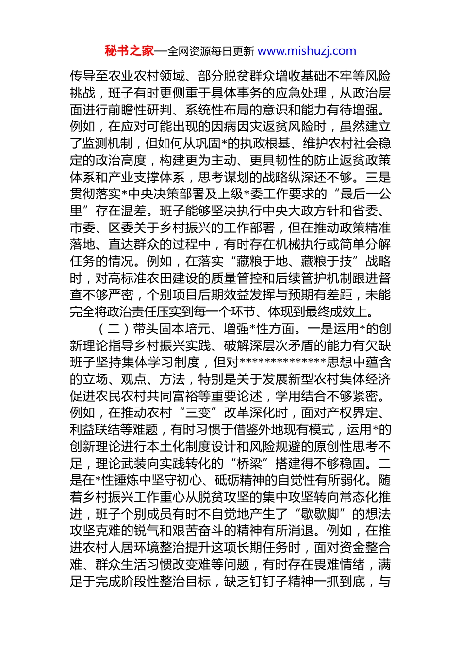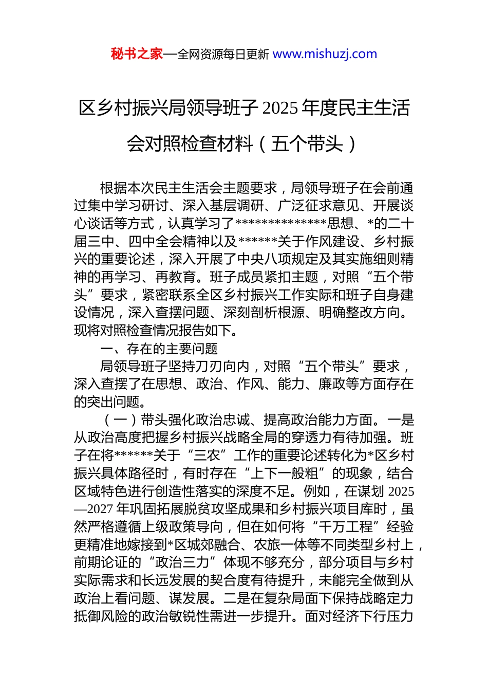 秘书之家—全网资源每日更新 www.mishuzj.com区乡村振兴局领导班子 2025 年度民主生活会对照检查材料(五个带头)根据本次民主生活会主题要求,局领导班子在会前通过集中学习研讨、深入基层调研、广泛征求意见、开展谈心谈话等方式,认真学习了**************思想、*的二十届三中、四中全会精神以及******关于作风建设、乡村振兴的重要论述,深入开展了中央八项规定及其实施细则精神的再学习、再教育。班子成员紧扣主题,对照“五个带头”要求,紧密联系全区乡村振兴工作实际和班子自身建设情况,深入查摆问题、深刻剖析根源、明确整改方向。现将对照检查情况报告如下。一、存在的主要问题局领导班子坚持刀刃向内,对照“五个带头”要求,深入查摆了在思想、政治、作风、能力、廉政等方面存在的突出问题。(一)带头强化政治忠诚、提高政治能力方面。一是从政治高度把握乡村振兴战略全局的穿透力有待加强。班子在将******关于“三农”工作的重要论述转化为*区乡村振兴具体路径时,有时存在“上下一般粗”的现象,结合区域特色进行创造性落实的深度不足。例如,在谋划 2025—2027 年巩固拓展脱贫攻坚成果和乡村振兴项目库时,虽然严格遵循上级政策导向,但在如何将“千万工程”经验更精准地嫁接到*区城郊融合、农旅一体等不同类型乡村上,前期论证的“政治三力”体现不够充分,部分项目与乡村实际需求和长远发展的契合度有待提升,未能完全做到从政治上看问题、谋发展。二是在复杂局面下保持战略定力抵御风险的政治敏锐性需进一步提升。面对经济下行压力秘书之家—全网资源每日更新 www.mishuzj.com传导至农业农村领域、部分脱贫群众增收基础不牢等风险挑战,班子有时更侧重于具体事务的应急处理,从政治层面进行前瞻性研判、系统性布局的意识和能力有待增强。例如,在应对可能出现的因病因灾返贫风险时,虽然建立了监测机制,但如何从巩固*的执政根基、维护农村社会稳定的政治高度,构建更为主动、更具韧性的防止返贫政策体系和产业支撑体系,思考谋划的战略纵深还不够。三是贯彻落实*中央决策部署及上级*委工作要求的“最后一公里”存在温差。班子能够坚决执行中央大政方针和省委、市委、区委关于乡村振兴的工作部署,但在推动政策精准落地、直达群众的过程中,有时存在机械执行或简单分解任务的情况。例如,在落实“藏粮于地、藏粮于技”战略时,对高标准农田建设的质量管控和后续管护机制跟进督查不够严密,个别项目后期效益发挥与预期有差距,未能完全将政治责任压实到每一个环节、体现到最终成效上。(二)带头固本培元、增强*性方面。一是运用*的创新理论指导乡村振兴实践、破解深层次矛盾的能力有欠缺班子坚持集体学习制度,但对**************思想中蕴含的立场、观点、方法,特别是关于发展新型农村集体经济促进农民农村共同富裕等重要论述,学用结合不够紧密。例如,在推动农村“三变”改革深化时,面对产权界定、利益联结等难题,有时习惯于借鉴外地现有模式,运用*的创新理论进行本土化制度设计和风险规避的原创性思考不足,理论武装向实践转化的“桥梁”搭建得不够稳固。二是在*性锤炼中坚守初心、砥砺精神的自觉性有所弱化。随着乡村振兴工作重心从脱贫攻坚的集中攻坚转向常态化推进,班子个别成员有时不自觉地产生了“歇歇脚”的想法攻坚克难的锐气和艰苦奋斗的精神有所消退。例如,在推进农村人居环境整治提升这项长期任务时,面对资金整合难、群众生活习惯改变难等问题,有时存在畏难情绪,满足于完成阶段性整治目标,缺乏钉钉子精神一抓到底,与秘书之家—全网资源每日更新 www.mishuzj.com革命先辈和先进典型相比,在*性修养的持续锤炼上存在差距。三是用*性原则修身律己、涵养道德品质的标杆作用发挥不够充分。班子能够遵守*章*规 dj,但在一些工作细节和生活小节上,用更高标准的*性原则进行自我检视、自我约束的主动性有待加强。例如,在协调处理部门利益与全局利益、短期效益与长远发展的关系时,有时本位主义思想会不自觉抬头;在深入基层调研时,虽然做到了轻车简从,但如何更彻底地摒弃“官本位”思想,以普通*员身份与群众打成一片、倾听最真实...