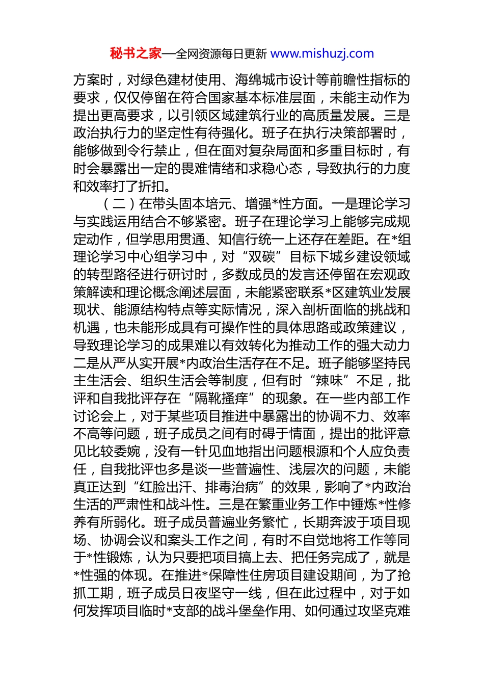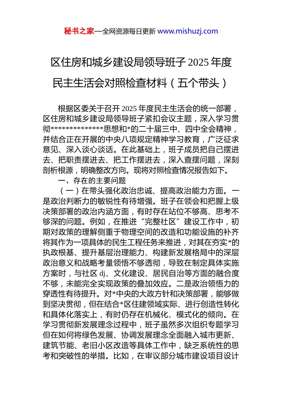 秘书之家—全网资源每日更新 www.mishuzj.com区住房和城乡建设局领导班子 2025 年度民主生活会对照检查材料(五个带头)根据区委关于召开 2025 年度民主生活会的统一部署,区住房和城乡建设局领导班子紧扣会议主题,深入学习贯彻**************思想和*的二十届三中、四中全会精神,并结合正在开展的中央八项规定精神学习教育,广泛征求意见、深入谈心谈话。在此基础上,班子成员把自己摆进去、把职责摆进去、把工作摆进去,深入查摆问题,深刻剖析根源,明确整改方向。现将对照检查情况报告如下。一、存在的主要问题(一)在带头强化政治忠诚、提高政治能力方面。一是政治判断力的敏锐性有待增强。班子在领会和把握上级决策部署的政治内涵方面,有时存在站位不够高、思考不够深的问题。例如,在推进“完整社区”建设工作中,初期对政策的理解侧重于物理空间的改造和功能设施的补齐将其作为一项具体的民生工程任务来推进,对其在夯实*的执政根基、提升基层治理能力、构建新发展格局中的深层政治意义和战略考量领悟不够透彻,导致在制定具体实施方案时,与社区 dj、文化建设、居民自治等方面的融合度不够,未能完全实现政策的叠加效应。二是政治领悟力的穿透性有待提升。对*中央的大政方针和决策部署,能够做到坚决贯彻,但在结合*区住建领域实际、进行创造性转化和具体化落实上,有时仍存在机械化、模式化的倾向。在学习贯彻新发展理念过程中,班子虽然多次组织专题学习但在如何将绿色发展、协调发展理念全面融入城市更新、建筑节能、老旧小区改造等具体工作中,缺乏系统性的思考和突破性的举措。比如,在审议部分城市建设项目设计秘书之家—全网资源每日更新 www.mishuzj.com方案时,对绿色建材使用、海绵城市设计等前瞻性指标的要求,仅仅停留在符合国家基本标准层面,未能主动作为提出更高要求,以引领区域建筑行业的高质量发展。三是政治执行力的坚定性有待强化。班子在执行决策部署时,能够做到令行禁止,但在面对复杂局面和多重目标时,有时会暴露出一定的畏难情绪和求稳心态,导致执行的力度和效率打了折扣。(二)在带头固本培元、增强*性方面。一是理论学习与实践运用结合不够紧密。班子在理论学习上能够完成规定动作,但学思用贯通、知信行统一上还存在差距。在*组理论学习中心组学习中,对“双碳”目标下城乡建设领域的转型路径进行研讨时,多数成员的发言还停留在宏观政策解读和理论概念阐述层面,未能紧密联系*区建筑业发展现状、能源结构特点等实际情况,深入剖析面临的挑战和机遇,也未能形成具有可操作性的具体思路或政策建议,导致理论学习的成果难以有效转化为推动工作的强大动力二是从严从实开展*内政治生活存在不足。班子能够坚持民主生活会、组织生活会等制度,但有时“辣味”不足,批评和自我批评存在“隔靴搔痒”的现象。在一些内部工作讨论会上,对于某些项目推进中暴露出的协调不力、效率不高等问题,班子成员之间有时碍于情面,提出的批评意见比较委婉,没有一针见血地指出问题根源和个人应负责任,自我批评也多是谈一些普遍性、浅层次的问题,未能真正达到“红脸出汗、排毒治病”的效果,影响了*内政治生活的严肃性和战斗性。三是在繁重业务工作中锤炼*性修养有所弱化。班子成员普遍业务繁忙,长期奔波于项目现场、协调会议和案头工作之间,有时不自觉地将工作等同于*性锻炼,认为只要把项目搞上去、把任务完成了,就是*性强的体现。在推进*保障性住房项目建设期间,为了抢抓工期,班子成员日夜坚守一线,但在此过程中,对于如何发挥项目临时*支部的战斗堡垒作用、如何通过攻坚克难秘书之家—全网资源每日更新 www.mishuzj.com磨砺*员干部的意志品质等 dj 工作思考不多、投入不够,存在“重业务、轻 dj”的潜在倾向。(三)在带头敬畏人民、敬畏组织、敬畏法纪方面。一是践行新时代*的群众路线不够深入。班子在决策中能够坚持问计于民,但有时方式方法比较单一,听取意见不够充分。在“迎红街道*小区”的改造初期,设计方案主要由局内业务科室和设计单位根据经验和常规做法制定,虽然也通过社区张贴了公示,但对于居民最关心的停车位优化晾晒...