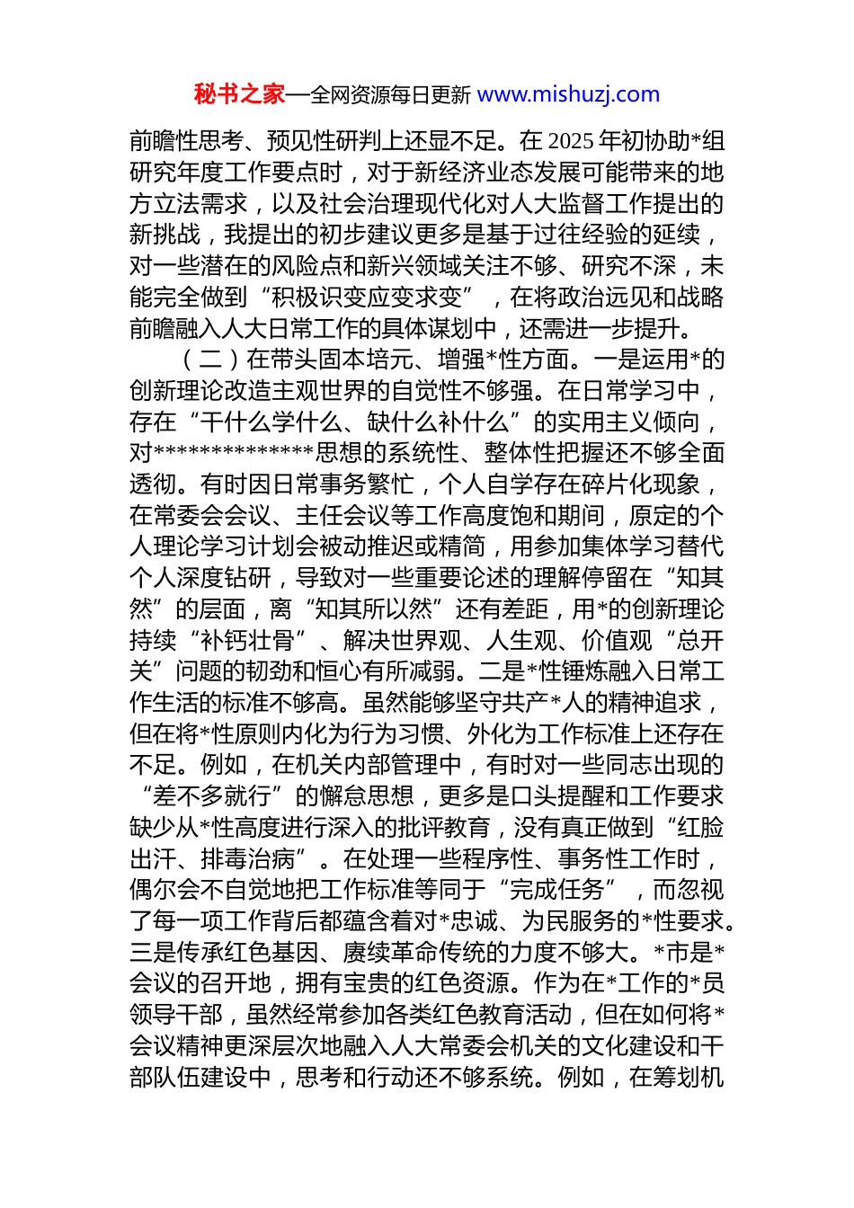 秘书之家—全网资源每日更新 www.mishuzj.com市人大常委会机关 2025 年度民主生活会秘书长个人对照检查材料(五个带头)根据市委关于召开 2025 年度民主生活会的统一部署和要求,我紧扣本次民主生活会主题,在深入学习领会**************思想、*的二十届三中、四中全会精神和******重要讲话、****批示精神的基础上,通过多种形式广泛征求意见建议,并与班子成员、分管部门同志深入开展谈心谈话。在此基础上,我严格对照“带头强化政治忠诚、提高政治能力”“带头固本培元、增强*性”“带头敬畏人民、敬畏组织、敬畏法纪”“带头干事创业、担当作为”“带头坚决扛起管*治*责任”等 5 个方面,深入查摆自身存在的突出问题,深刻剖析问题产生的思想根源,明确了今后的努力方向和整改措施。现将个人对照检查情况报告如下。一、存在的主要问题(一)在带头强化政治忠诚、提高政治能力方面。一是理论武装与实践转化结合不够紧密。在推动*中央大政方针和决策部署在人大常委会机关落地生根的过程中,有时存在“以会议落实会议、以文件落实文件”的惯性思维。例如,在组织学习贯彻*的二十届四中全会精神时,虽然机关第一时间组织了传达学习并制定了初步的学习方案,但在如何将全会精神具体转化为人大服务“十五五”良好开局的立法、监督工作要点上,最初的方案设计思考不够深入,更多是原则性号召,缺少针对*市作为省域副中心建设中面临的实际问题,提出具体、可操作的结合路径,导致学习与实践存在一定的“时差”和“温差”。二是在复杂局面下保持战略定力的敏锐性有待增强。面对当前复杂多变的经济社会形势,虽然能够坚定信心、保持定力,但在秘书之家—全网资源每日更新 www.mishuzj.com前瞻性思考、预见性研判上还显不足。在 2025 年初协助*组研究年度工作要点时,对于新经济业态发展可能带来的地方立法需求,以及社会治理现代化对人大监督工作提出的新挑战,我提出的初步建议更多是基于过往经验的延续,对一些潜在的风险点和新兴领域关注不够、研究不深,未能完全做到“积极识变应变求变”,在将政治远见和战略前瞻融入人大日常工作的具体谋划中,还需进一步提升。(二)在带头固本培元、增强*性方面。一是运用*的创新理论改造主观世界的自觉性不够强。在日常学习中,存在“干什么学什么、缺什么补什么”的实用主义倾向,对**************思想的系统性、整体性把握还不够全面透彻。有时因日常事务繁忙,个人自学存在碎片化现象,在常委会会议、主任会议等工作高度饱和期间,原定的个人理论学习计划会被动推迟或精简,用参加集体学习替代个人深度钻研,导致对一些重要论述的理解停留在“知其然”的层面,离“知其所以然”还有差距,用*的创新理论持续“补钙壮骨”、解决世界观、人生观、价值观“总开关”问题的韧劲和恒心有所减弱。二是*性锤炼融入日常工作生活的标准不够高。虽然能够坚守共产*人的精神追求,但在将*性原则内化为行为习惯、外化为工作标准上还存在不足。例如,在机关内部管理中,有时对一些同志出现的“差不多就行”的懈怠思想,更多是口头提醒和工作要求缺少从*性高度进行深入的批评教育,没有真正做到“红脸出汗、排毒治病”。在处理一些程序性、事务性工作时,偶尔会不自觉地把工作标准等同于“完成任务”,而忽视了每一项工作背后都蕴含着对*忠诚、为民服务的*性要求。三是传承红色基因、赓续革命传统的力度不够大。*市是*会议的召开地,拥有宝贵的红色资源。作为在*工作的*员领导干部,虽然经常参加各类红色教育活动,但在如何将*会议精神更深层次地融入人大常委会机关的文化建设和干部队伍建设中,思考和行动还不够系统。例如,在筹划机秘书之家—全网资源每日更新 www.mishuzj.com关青年干部理论学习小组活动时,虽然也安排了红色基地的现场教学,但在后续的研讨和成果转化上,未能有效引导青年干部从革命传统中深刻汲取自我革命、敢于斗争的智慧和力量,红色教育的实效性有待进一步提升。(三)在带头敬畏人民、敬畏组织、敬畏法纪方面。一是践行新时代*的群众路线的方式不够深入。虽然能够坚持落实“四下基层”制度,但深入基层的“深”度和“实”...