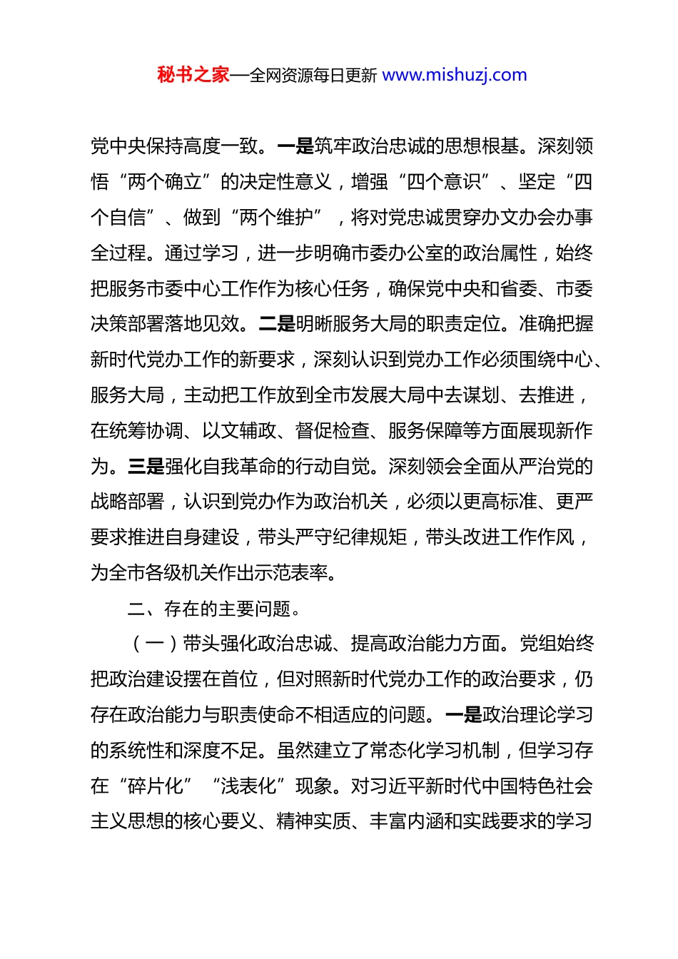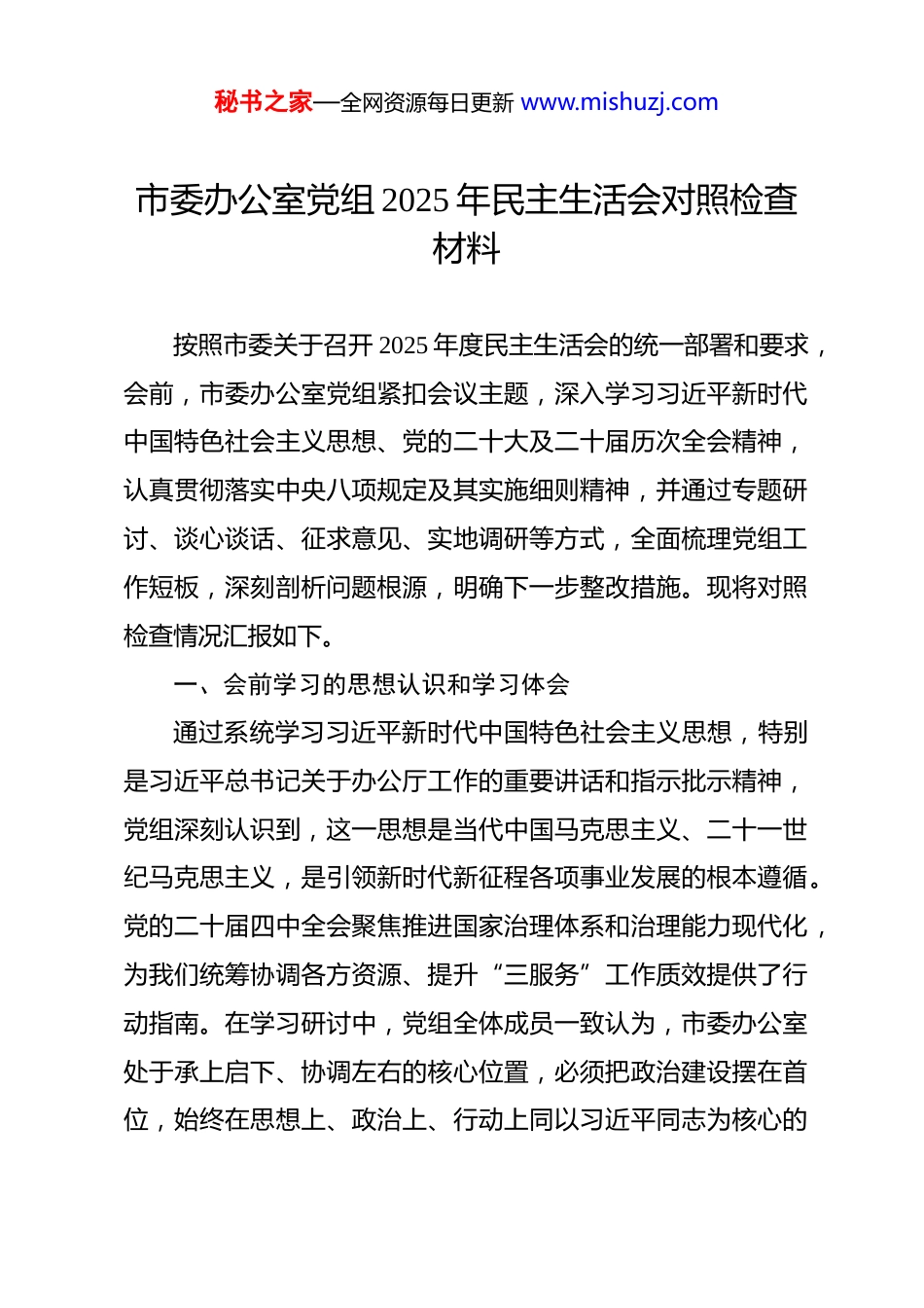 秘书之家—全网资源每日更新 www.mishuzj.com市委办公室党组 2025 年民主生活会对照检查材料 按照市委关于召开 2025 年度民主生活会的统一部署和要求,会前,市委办公室党组紧扣会议主题,深入学习习近平新时代中国特色社会主义思想、党的二十大及二十届历次全会精神,认真贯彻落实中央八项规定及其实施细则精神,并通过专题研讨、谈心谈话、征求意见、实地调研等方式,全面梳理党组工作短板,深刻剖析问题根源,明确下一步整改措施。现将对照检查情况汇报如下。一、会前学习的思想认识和学习体会通过系统学习习近平新时代中国特色社会主义思想,特别是习近平总书记关于办公厅工作的重要讲话和指示批示精神,党组深刻认识到,这一思想是当代中国马克思主义、二十一世纪马克思主义,是引领新时代新征程各项事业发展的根本遵循。党的二十届四中全会聚焦推进国家治理体系和治理能力现代化,为我们统筹协调各方资源、提升“三服务”工作质效提供了行动指南。在学习研讨中,党组全体成员一致认为,市委办公室处于承上启下、协调左右的核心位置,必须把政治建设摆在首位,始终在思想上、政治上、行动上同以习近平同志为核心的秘书之家—全网资源每日更新 www.mishuzj.com党中央保持高度一致。一是筑牢政治忠诚的思想根基。深刻领悟“两个确立”的决定性意义,增强“四个意识”、坚定“四个自信”、做到“两个维护”,将对党忠诚贯穿办文办会办事全过程。通过学习,进一步明确市委办公室的政治属性,始终把服务市委中心工作作为核心任务,确保党中央和省委、市委决策部署落地见效。二是明晰服务大局的职责定位。准确把握新时代党办工作的新要求,深刻认识到党办工作必须围绕中心、服务大局,主动把工作放到全市发展大局中去谋划、去推进,在统筹协调、以文辅政、督促检查、服务保障等方面展现新作为。三是强化自我革命的行动自觉。深刻领会全面从严治党的战略部署,认识到党办作为政治机关,必须以更高标准、更严要求推进自身建设,带头严守纪律规矩,带头改进工作作风,为全市各级机关作出示范表率。二、存在的主要问题。(一)带头强化政治忠诚、提高政治能力方面。党组始终把政治建设摆在首位,但对照新时代党办工作的政治要求,仍存在政治能力与职责使命不相适应的问题。一是政治理论学习的系统性和深度不足。虽然建立了常态化学习机制,但学习存在“碎片化”“浅表化”现象。对习近平新时代中国特色社会主义思想的核心要义、精神实质、丰富内涵和实践要求的学习秘书之家—全网资源每日更新 www.mishuzj.com缺乏系统性谋划,往往是围绕具体工作需求开展专题学习多,对理论体系的整体性把握不够。例如,在学习党的二十届四中全会关于“推进治理体系和治理能力现代化”的部署时,更多关注与协调工作直接相关的内容,对背后的理论逻辑和实践要求钻研不深,导致在起草相关政策文件时,理论支撑不够扎实,针对性和指导性有待提升。同时,学习成果转化不够充分,存在“学用脱节”问题,将理论学习与党办“三服务”工作深度融合的思路不宽、办法不多。二是政治敏锐性和政治鉴别力有待提升。面对新形势下复杂的意识形态领域形势,党组成员有时存在“业务为先、政治为辅”的惯性思维,对一些工作中潜在的政治风险警惕性不够。比如,在审核基层报送的材料、处理网络舆情信息时,更多关注内容的业务合规性,对其中可能隐含的政治导向问题研判不够精准;对社会上流传的一些错误言论,有时存在“事不关己”的思想,没有主动站出来发声亮剑、澄清是非,没有充分发挥党办机关的政治引领作用。三是政治执行力的精准性和实效性不强。在贯彻落实党中央和省委、市委决策部署时,有时存在“上下一般粗”的现象,对上级要求的理解不够透彻,结合党办实际创造性落实的力度不足。例如,在推进市委重点工作督查落实过程中,有时过于注重督查频次和材料报送,对督查发现问题的深层次原因分析不够,提秘书之家—全网资源每日更新 www.mishuzj.com出的整改建议针对性不强,导致部分问题整改不彻底、易反弹;在统筹协调跨部门、跨领域工作时,运用政治思维破解难题的能力不足,有时因协调不畅影响工作推进...