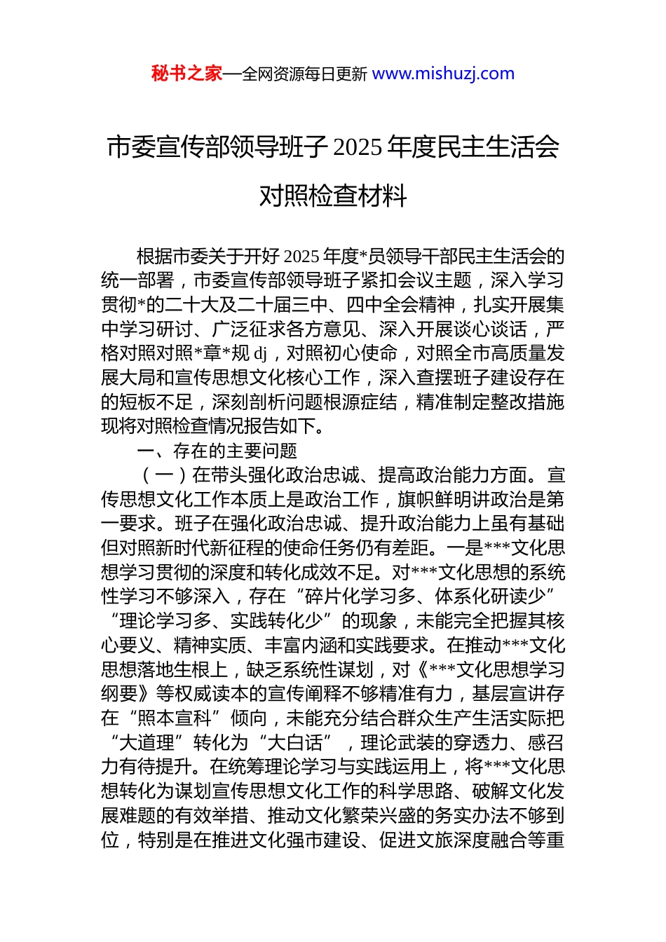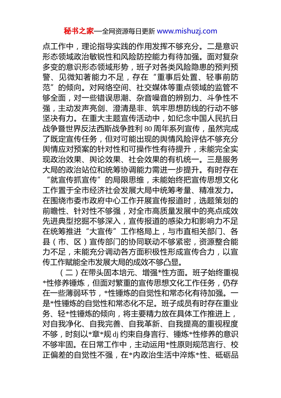 秘书之家—全网资源每日更新 www.mishuzj.com市委宣传部领导班子 2025 年度民主生活会对照检查材料根据市委关于开好 2025 年度*员领导干部民主生活会的统一部署,市委宣传部领导班子紧扣会议主题,深入学习贯彻*的二十大及二十届三中、四中全会精神,扎实开展集中学习研讨、广泛征求各方意见、深入开展谈心谈话,严格对照对照*章*规 dj,对照初心使命,对照全市高质量发展大局和宣传思想文化核心工作,深入查摆班子建设存在的短板不足,深刻剖析问题根源症结,精准制定整改措施现将对照检查情况报告如下。一、存在的主要问题(一)在带头强化政治忠诚、提高政治能力方面。宣传思想文化工作本质上是政治工作,旗帜鲜明讲政治是第一要求。班子在强化政治忠诚、提升政治能力上虽有基础但对照新时代新征程的使命任务仍有差距。一是***文化思想学习贯彻的深度和转化成效不足。对***文化思想的系统性学习不够深入,存在“碎片化学习多、体系化研读少”“理论学习多、实践转化少”的现象,未能完全把握其核心要义、精神实质、丰富内涵和实践要求。在推动***文化思想落地生根上,缺乏系统性谋划,对《***文化思想学习纲要》等权威读本的宣传阐释不够精准有力,基层宣讲存在“照本宣科”倾向,未能充分结合群众生产生活实际把“大道理”转化为“大白话”,理论武装的穿透力、感召力有待提升。在统筹理论学习与实践运用上,将***文化思想转化为谋划宣传思想文化工作的科学思路、破解文化发展难题的有效举措、推动文化繁荣兴盛的务实办法不够到位,特别是在推进文化强市建设、促进文旅深度融合等重秘书之家—全网资源每日更新 www.mishuzj.com点工作中,理论指导实践的作用发挥不够充分。二是意识形态领域政治敏锐性和风险防控能力有待加强。面对复杂多变的意识形态领域形势,班子对各类风险隐患的预判预警、见微知著能力不足,存在“重事后处置、轻事前防范”的倾向。对网络空间、社交媒体等重点领域的监管不够全面,对一些错误思潮、杂音噪音的辨别力、斗争性不强,主动发声亮剑、澄清是非、筑牢思想防线的行动不够坚决有力。在重大主题宣传活动中,如纪念中国人民抗日战争暨世界反法西斯战争胜利 80 周年系列宣传,虽然完成了既定宣传任务,但对可能出现的舆情风险评估不够充分舆情应对预案的针对性和可操作性有待提升,未能完全实现政治效果、舆论效果、社会效果的有机统一。三是服务大局的政治站位和统筹协调能力需进一步提升。有时存在“就宣传抓宣传”的局限思维,未能始终把宣传思想文化工作置于全市经济社会发展大局中统筹考量、精准发力。在围绕市委市政府中心工作开展宣传报道时,选题策划的前瞻性、针对性不够强,对全市高质量发展中的亮点成效先进典型挖掘不够深入,宣传报道的感染力和影响力不足在统筹推进“大宣传”工作格局上,与市直相关部门、各县(市、区)宣传部门的协同联动不够紧密,资源整合能力不足,未能充分调动各方面积极性形成宣传合力,以宣传工作赋能全市发展大局的成效不够凸显。(二)在带头固本培元、增强*性方面。班子始终重视*性修养锤炼,但面对繁重的宣传思想文化工作任务,仍存在一些薄弱环节,*性锤炼的自觉性和常态化有待加强。一是*性锤炼的自觉性和常态化不足。班子成员有时存在重业务、轻*性锤炼的倾向,将主要精力放在具体工作推进上,对自我净化、自我完善、自我革新、自我提高的重视程度不够,时刻以*章*规 dj 约束自身言行、锤炼*性修养的意识不够牢固。在日常工作中,主动运用*性原则规范言行、校正偏差的自觉性不强,在*内政治生活中淬炼*性、砥砺品秘书之家—全网资源每日更新 www.mishuzj.com格的韧劲不足,对一些不良风气和苗头性问题未能及时抵制和纠正。二是理想信念教育的质效和创新力度不够。对班子成员及全体*员干部的理想信念教育,方式方法偏于传统固化,多以集中学习、专题讲座等形式为主,结合新时代宣传思想文化工作特点、干部思想实际开展创新式、沉浸式教育不够。在运用红色资源、先进典型开展思想引领上,力度不足,未能充分挖掘本地红色文化资源的时代价值,打造具有感染力的理想信念教育载体。对年轻干部的理...