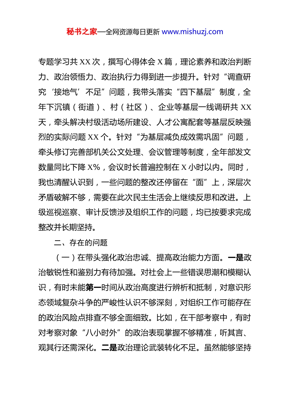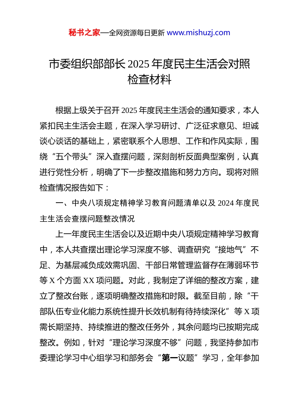 秘书之家—全网资源每日更新 www.mishuzj.com市委组织部部长 2025 年度民主生活会对照检查材料 根据上级关于召开 2025 年度民主生活会的通知要求,本人紧扣民主生活会主题,在深入学习研讨、广泛征求意见、坦诚谈心谈话的基础上,紧密联系个人思想、工作和作风实际,围绕“五个带头”深入查摆问题,深刻剖析反面典型案例,认真进行党性分析,明确了下一步整改措施和努力方向。现将对照检查情况报告如下:一、中央八项规定精神学习教育问题清单以及 2024 年度民主生活会查摆问题整改情况上一年度民主生活会以及近期中央八项规定精神学习教育中,本人共查摆出理论学习深度不够、调查研究“接地气”不足、为基层减负成效需巩固、干部日常管理监督存在薄弱环节等 X 个方面 XX 项问题。对此,我制定了详细的整改方案,建立了整改台账,逐项明确整改措施和时限。截至目前,除“干部队伍专业化能力系统性提升长效机制有待持续深化”等 X 项需长期坚持、持续推进的整改任务外,其余问题均已按期完成整改。例如,针对“理论学习深度不够”问题,我坚持参加市委理论学习中心组学习和部务会“第一议题”学习,全年参加秘书之家—全网资源每日更新 www.mishuzj.com专题学习共 XX 次,撰写心得体会 X 篇,理论素养和政治判断力、政治领悟力、政治执行力得到进一步提升。针对“调查研究‘接地气’不足”问题,我带头落实“四下基层”制度,全年下沉镇(街道)、村(社区)、企业等基层一线调研共 XX天,牵头解决村级活动场所建设、人才公寓配套等基层反映强烈的实际问题 XX 个。针对“为基层减负成效需巩固”问题,牵头修订完善部机关公文处理、会议管理等制度,全年部发文数量同比下降 X%,会议时长普遍控制在 X 小时以内。同时,我也清醒认识到,一些问题的整改还停留在“面”上,深层次矛盾破解不够,需要在此次民主生活会上继续反思和改进。上级巡视巡察、审计反馈涉及组织工作的问题,均已按要求完成整改并长期坚持。二、存在的问题(一)在带头强化政治忠诚、提高政治能力方面。一是政治敏锐性和鉴别力有待加强。对社会上一些错误思潮和模糊认识,有时未能第一时间从政治高度进行辨析和抵制,对意识形态领域复杂斗争的严峻性认识不够深刻,对组织工作可能存在的政治风险点排查不够全面细致。比如,在干部考察中,有时对考察对象“八小时外”的政治表现掌握不够精准,听其言、观其行还需深化。二是政治理论武装转化不足。虽然能够坚持秘书之家—全网资源每日更新 www.mishuzj.com学习习近平新时代中国特色社会主义思想,但在“学懂弄通做实”上还有差距,特别是如何将党的创新理论,如“两个结合”、“六个必须坚持”等,创造性地转化为组织工作的具体思路、政策举措和实际成效,思考不深、办法不多,存在“知行合一”不够紧密的问题。三是贯彻落实中央决策部署的穿透力有待提升。对中央和省委、市委的一些重大决策部署,有时满足于及时传达学习,但在结合 X 实际、创造性地推动落地见效上,缺乏“一竿子插到底”的韧劲。例如,在推动新业态新就业群体党建工作中,虽然建立了初步覆盖机制,但如何有效引领、深度融入基层治理,发挥实质作用,还需进一步探索深化。(二)在带头固本培元、增强党性方面。一是党性锤炼的主动性自觉性有待增强。有时以事务性工作繁忙为由,未能时时处处以党员标准严格要求自己,参加组织生活的主动性、投入度偶有不足,运用批评和自我批评武器不够经常有力,“红脸出汗”的效果不够明显。对照党章党规党纪进行自我检视、自我净化、自我提高的频度和深度还需加强。二是理想信念的根基扎得不够牢固。随着工作阅历增加,有时会产生“歇歇脚”的念头,攻坚克难、锐意进取的劲头有所减退,当初入党时的激情和誓言在平淡工作中有所磨蚀。面对组织工作中的难秘书之家—全网资源每日更新 www.mishuzj.com点堵点问题,有时存在畏难情绪,缺乏“闯”的精神和“创”的勇气。三是宗旨意识树得不够坚实。虽然主观上想为群众办实事,但有时深入基层倾听群众心声不够主动、不够深入,坐在办公室听汇报、看材料多,真正沉到一线与普通党员群众面对...