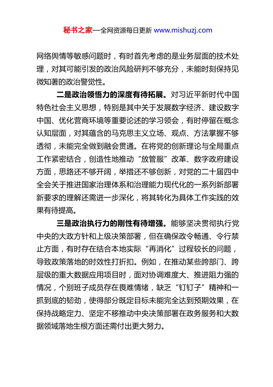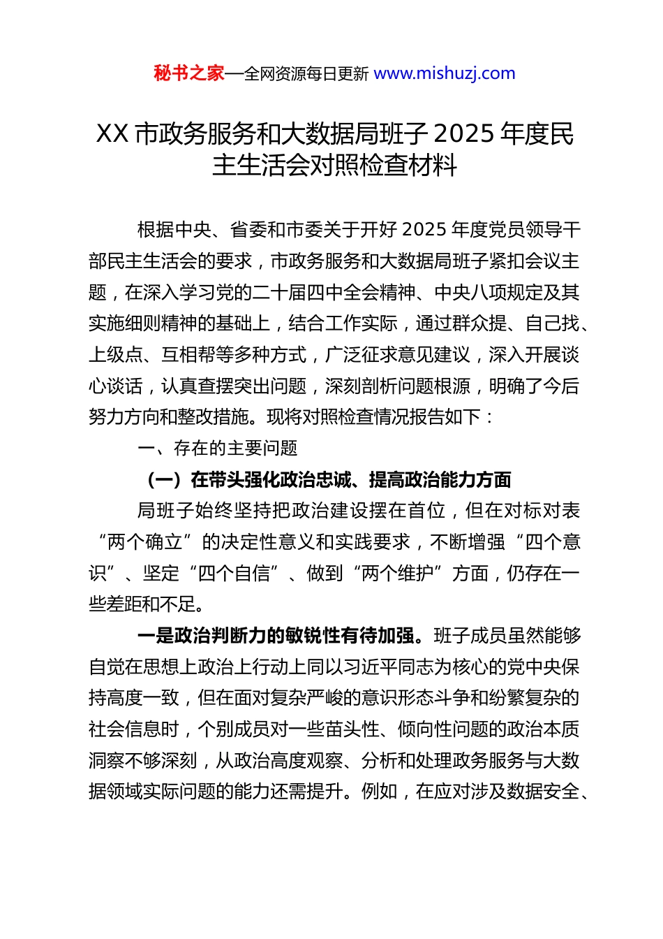 秘书之家—全网资源每日更新 www.mishuzj.comXX 市政务服务和大数据局班子 2025 年度民主生活会对照检查材料根据中央、省委和市委关于开好 2025 年度党员领导干部民主生活会的要求,市政务服务和大数据局班子紧扣会议主题,在深入学习党的二十届四中全会精神、中央八项规定及其实施细则精神的基础上,结合工作实际,通过群众提、自己找、上级点、互相帮等多种方式,广泛征求意见建议,深入开展谈心谈话,认真查摆突出问题,深刻剖析问题根源,明确了今后努力方向和整改措施。现将对照检查情况报告如下:一、存在的主要问题(一)在带头强化政治忠诚、提高政治能力方面局班子始终坚持把政治建设摆在首位,但在对标对表“两个确立”的决定性意义和实践要求,不断增强“四个意识”、坚定“四个自信”、做到“两个维护”方面,仍存在一些差距和不足。一是政治判断力的敏锐性有待加强。班子成员虽然能够自觉在思想上政治上行动上同以习近平同志为核心的党中央保持高度一致,但在面对复杂严峻的意识形态斗争和纷繁复杂的社会信息时,个别成员对一些苗头性、倾向性问题的政治本质洞察不够深刻,从政治高度观察、分析和处理政务服务与大数据领域实际问题的能力还需提升。例如,在应对涉及数据安全、秘书之家—全网资源每日更新 www.mishuzj.com网络舆情等敏感问题时,有时首先考虑的是业务层面的技术处理,对其可能引发的政治风险研判不够充分,未能时刻保持见微知著的政治警觉性。二是政治领悟力的深度有待拓展。对习近平新时代中国特色社会主义思想,特别是其中关于发展数字经济、建设数字中国、优化营商环境等重要论述的学习领会,有时停留在概念认知层面,对其蕴含的马克思主义立场、观点、方法掌握不够透彻,未能完全做到融会贯通。在将党的创新理论与全局重点工作紧密结合,创造性地推动“放管服”改革、数字政府建设方面,思路还不够开阔,举措还不够创新,对党的二十届四中全会关于推进国家治理体系和治理能力现代化的一系列新部署新要求的理解还需进一步深化,将其转化为具体工作实践的效果有待提高。三是政治执行力的刚性有待增强。能够坚决贯彻执行党中央的大政方针和上级决策部署,但在确保政令畅通、令行禁止方面,有时存在结合本地实际“再消化”过程较长的问题,导致政策落地的时效性打折扣。例如,在推动某些跨部门、跨层级的重大数据应用项目时,面对协调难度大、推进阻力强的情况,个别班子成员存在畏难情绪,缺乏“钉钉子”精神和一抓到底的韧劲,使得部分既定目标未能完全达到预期效果,在保持战略定力、坚定不移推动中央决策部署在政务服务和大数据领域落地生根方面还需付出更大努力。秘书之家—全网资源每日更新 www.mishuzj.com(二)在带头固本培元、增强党性方面局班子高度重视党性锻炼,但对照新时代党的建设总要求,在强化理论武装、锤炼坚强党性方面仍有薄弱环节。一是理论武装的自觉性系统性有待提升。虽然坚持了集体学习制度,但学习内容有时不够系统全面,存在“用到才学、急用先学”的现象。对党章党规党纪的经常性、深入性学习不够,对其精神实质和核心要义的理解把握还需加强。运用习近平新时代中国特色社会主义思想凝心铸魂的深度不足,未能完全将其内化为坚定的理想信念和强大的精神力量,在解决好世界观、人生观、价值观这个“总开关”问题上,自我净化、自我完善的主动性还需增强。个别成员在理论学习上满足于“读过了、学过了”,但在“学懂、弄通、做实”上还有差距,未能真正做到以学铸魂、以学增智、以学正风、以学促干。二是党性修养的锤炼标准有待提高。班子成员能够自觉用党性原则要求自己,但在严格党内政治生活方面,有时开展批评与自我批评“辣味”不足,担心影响团结、怕伤和气,“自我批评怕丢面子、批评上级怕穿小鞋、批评同级怕伤和气、批评下级怕丢选票”的思想在一定程度上存在。对照焦裕禄、兰辉等先进典型的党性标准,反思自身在坚定理想信念、筑牢对党忠诚、厚植为民情怀、纯正道德品质等方面还存在差距。随着工作环境和岗位的变化,个别成员艰苦奋斗、锐意进取的精神有所弱化,未能始终以最高标准最严要求审视和锤炼自...
