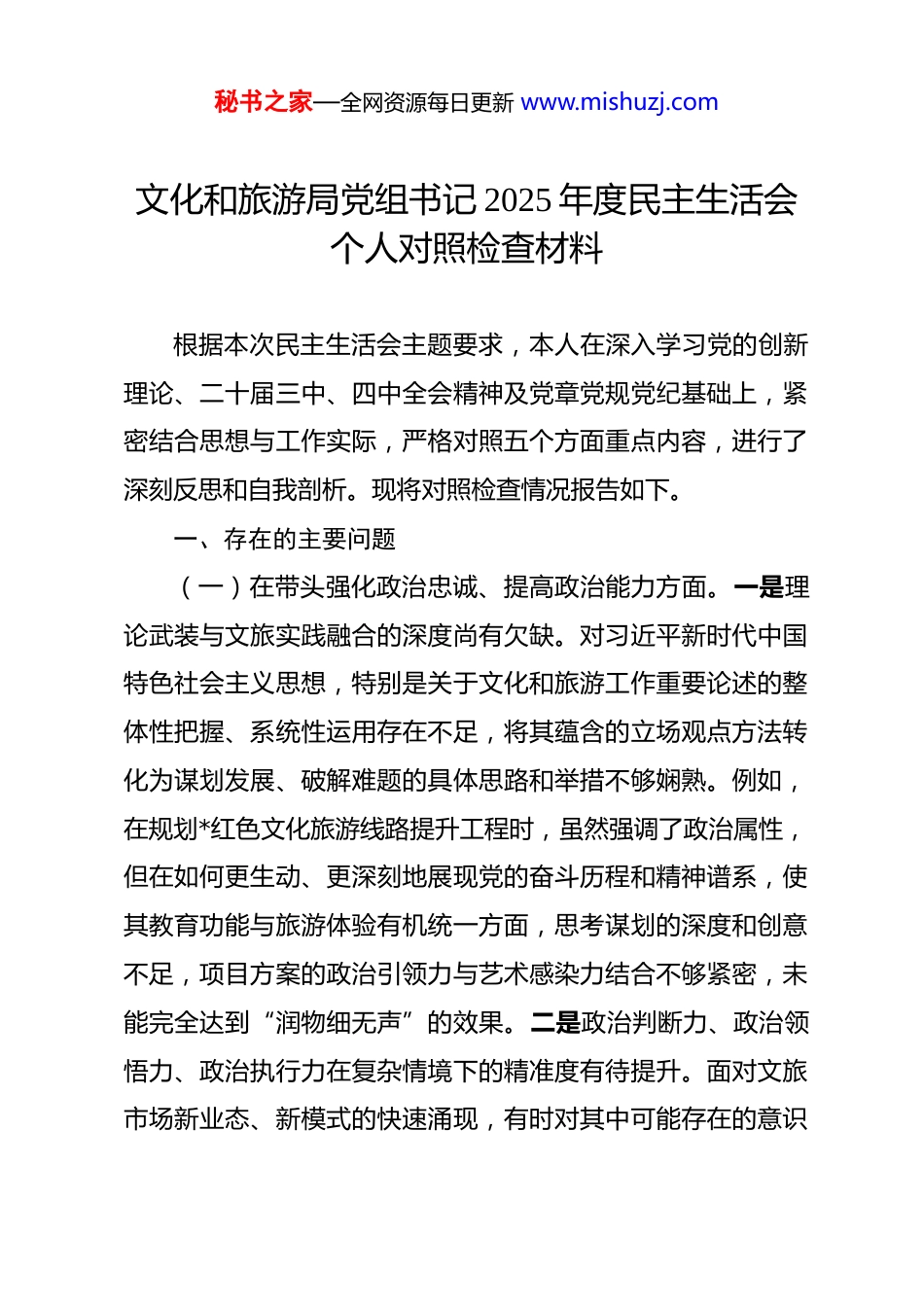 秘书之家—全网资源每日更新 www.mishuzj.com文化和旅游局党组书记 2025 年度民主生活会个人对照检查材料 根据本次民主生活会主题要求,本人在深入学习党的创新理论、二十届三中、四中全会精神及党章党规党纪基础上,紧密结合思想与工作实际,严格对照五个方面重点内容,进行了深刻反思和自我剖析。现将对照检查情况报告如下。一、存在的主要问题(一)在带头强化政治忠诚、提高政治能力方面。一是理论武装与文旅实践融合的深度尚有欠缺。对习近平新时代中国特色社会主义思想,特别是关于文化和旅游工作重要论述的整体性把握、系统性运用存在不足,将其蕴含的立场观点方法转化为谋划发展、破解难题的具体思路和举措不够娴熟。例如,在规划*红色文化旅游线路提升工程时,虽然强调了政治属性,但在如何更生动、更深刻地展现党的奋斗历程和精神谱系,使其教育功能与旅游体验有机统一方面,思考谋划的深度和创意不足,项目方案的政治引领力与艺术感染力结合不够紧密,未能完全达到“润物细无声”的效果。二是政治判断力、政治领悟力、政治执行力在复杂情境下的精准度有待提升。面对文旅市场新业态、新模式的快速涌现,有时对其中可能存在的意识秘书之家—全网资源每日更新 www.mishuzj.com形态风险、文化安全隐患洞察不够敏锐,预见性部署不足。在落实上级关于文旅产业高质量发展的决策部署时,有时存在机械执行等靠思想,结合*资源禀赋和发展阶段进行创造性落实、差异化探索的主动性不强,如推动文旅深度融合赋能乡村振兴方面,思路和举措的创新性、突破性不足。三是政治纪律和政治规矩的刚性约束在细微处落实不够彻底。能够严守重大原则问题,但在日常工作中,对一些非原则性的“小节”问题警惕性不高,例如在内部会议讨论中,有时对个别同志偏离主题的议论未能及时、严肃地提醒纠正,维护会议政治性、严肃性的斗争精神有所弱化。(二)在带头固本培元、增强党性方面。一是理想信念的“压舱石”作用在日常砥砺中有所松动。面对文旅工作中存在的资金短缺、项目推进缓慢、历史遗留问题复杂等现实困难时,偶尔会产生畏难情绪和求稳心态,攻坚克难的锐气和“功成不必在我”的境界有待提升。在组织局内理论学习中心组学习时,有时满足于完成“规定动作”,在引导党员干部真正把学习成果内化为坚定信仰、外化为自觉行动上,抓手不多、成效不显。例如,在推动*非遗传承保护工作中,面对传承人老龄化、市场萎缩的困境,一度思路保守,创新性保护与发展措施推出不及时,本质上是理想信念不够坚定、担当精神不足的反映。二是秘书之家—全网资源每日更新 www.mishuzj.com党性原则在修身律己的标尺上刻度不够精准。对照党章党规党纪进行自我检视的主动性、经常性不足,以党员标准严格要求自己贯穿工作生活全过程的自觉性有待加强。在抵制社会不良风气、净化“生活圈”“社交圈”方面,虽然自身能做到清正,但对身边同志和家属的提醒、约束可以更加严格、更加经常。三是宗旨意识在文化惠民中的穿透力有待增强。虽然高度重视公共文化服务体系建设,但在深入了解不同群体,特别是偏远乡镇群众、青少年、老年人等差异化文化需求方面,调研的频次和深度不够,导致部分文化惠民活动内容与群众实际喜好存在“温差”。例如,2025 年举办的“送戏下乡”活动中,部分剧目选择未能充分征求当地群众意见,上座率和群众反响未达预期,反映出以人民为中心的发展思想扎根不够深。(三)在带头敬畏人民、敬畏组织、敬畏法纪方面。一是“四下基层”制度在文旅工作中的实践效能未能充分释放。下基层调研有时存在“走马观花”现象,提前设定路线、看“盆景”多,随机走访、深入农家、与普通游客面对面交流少,对基层文旅工作真实状况和群众急难愁盼掌握不够全面精准。例如,在调研*古镇旅游业态升级时,更多听取了管委会和重点商户的意见,对原住民关于旅游开发影响其生活、参与度低的诉求收集不够充分,后续政策制定中对其利益的兼顾考虑不足。秘书之家—全网资源每日更新 www.mishuzj.com二是民主集中制原则在议事决策中的刚性执行有待加强。在局党组会议讨论重大事项时,虽然能保障班子成员充分发表意见,...