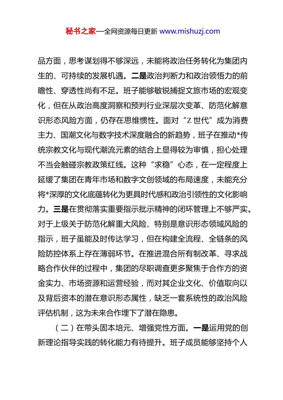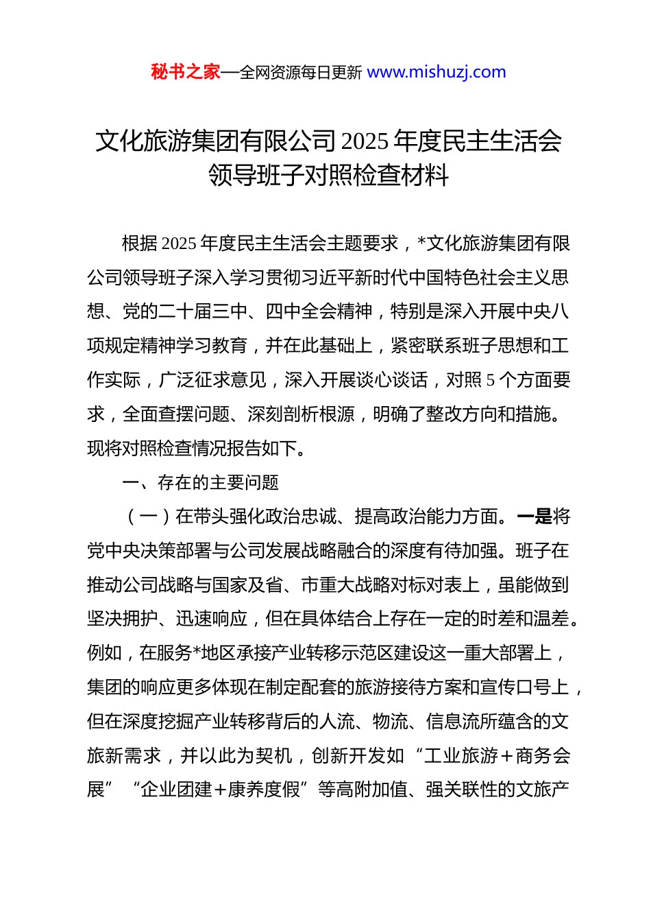 秘书之家—全网资源每日更新 www.mishuzj.com文化旅游集团有限公司 2025 年度民主生活会领导班子对照检查材料 根据 2025 年度民主生活会主题要求,*文化旅游集团有限公司领导班子深入学习贯彻习近平新时代中国特色社会主义思想、党的二十届三中、四中全会精神,特别是深入开展中央八项规定精神学习教育,并在此基础上,紧密联系班子思想和工作实际,广泛征求意见,深入开展谈心谈话,对照 5 个方面要求,全面查摆问题、深刻剖析根源,明确了整改方向和措施。现将对照检查情况报告如下。一、存在的主要问题(一)在带头强化政治忠诚、提高政治能力方面。一是将党中央决策部署与公司发展战略融合的深度有待加强。班子在推动公司战略与国家及省、市重大战略对标对表上,虽能做到坚决拥护、迅速响应,但在具体结合上存在一定的时差和温差。例如,在服务*地区承接产业转移示范区建设这一重大部署上,集团的响应更多体现在制定配套的旅游接待方案和宣传口号上,但在深度挖掘产业转移背后的人流、物流、信息流所蕴含的文旅新需求,并以此为契机,创新开发如“工业旅游+商务会展”“企业团建+康养度假”等高附加值、强关联性的文旅产秘书之家—全网资源每日更新 www.mishuzj.com品方面,思考谋划得不够深远,未能将政治任务转化为集团内生的、可持续的发展机遇。二是政治判断力和政治领悟力的前瞻性、穿透性尚有不足。班子能够敏锐捕捉文旅市场的宏观变化,但在从政治高度洞察和预判行业深层次变革、防范化解意识形态风险方面,仍存在思维惯性。面对“Z 世代”成为消费主力、国潮文化与数字技术深度融合的新趋势,班子在推动*传统宗教文化与现代潮流元素的结合上显得较为审慎,担心处理不当会触碰宗教政策红线。这种“求稳”心态,在一定程度上延缓了集团在青年市场和数字文创领域的布局速度,未能充分将*深厚的文化底蕴转化为更具时代感和政治引领性的文化影响力。三是在贯彻落实重要指示批示精神的闭环管理上不够严实。对于上级关于防范化解重大风险、特别是意识形态领域风险的指示,班子虽能及时传达学习,但在构建全流程、全链条的风险防控体系上存在薄弱环节。在推进混合所有制改革、寻求战略合作伙伴的过程中,集团的尽职调查更多聚焦于合作方的资金实力、市场资源和运营经验,而对其企业文化、价值取向以及背后资本的潜在意识形态属性,缺乏一套系统性的政治风险评估机制,这为未来合作埋下了潜在隐患。(二)在带头固本培元、增强党性方面。一是运用党的创新理论指导实践的转化能力有待提升。班子成员能够坚持个人秘书之家—全网资源每日更新 www.mishuzj.com自学与集中学习相结合,但有时存在“为了学习而学习”的倾向,将理论学习与解决公司改革发展中的实际难题结合得不够紧密。比如,在学习贯彻习近平总书记关于“推动中华优秀传统文化创造性转化、创新性发展”的重要论述时,讨论多、研究多,但在如何将这一论述具体应用到*小镇的业态升级或“*一码游”平台的文化内容建设上,缺乏体系化的实施路径和可量化的成果检验,导致理论学习的成果没能最大限度地转化为推动高质量发展的强大动力。二是传承红色基因、砥砺斗争精神的自觉性有待增强。在和平发展时期,尤其是在*旅游市场持续向好的背景下,班子成员内心深处艰苦奋斗、攻坚克难的革命精神有所弱化。面对数字化转型中的“硬骨头”,如打通“*一码游”平台与景区内各酒店、餐饮、零售商户之间的数据壁垒,在实现全产业链数据互联互通时,有时会因为协调难度大、涉及利益主体多而产生畏难情绪,倾向于采取渐进式的、妥协性的解决方案,而不是以“逢山开路、遇水搭桥”的斗争精神,下定决心一揽子解决问题,这在一定程度上影响了智慧景区建设的整体效能。三是坚守共产党人精神家园、抵制不良风气的思想堤坝需持续加固。班子成员能够做到廉洁自律,但对于行业内一些奢华铺张的现象警惕性不高,自我要求有时会不自觉地“随大流”。在组织对外考察或同业交流活动时,虽然严格秘书之家—全网资源每日更新 www.mishuzj.com遵守中央八项规定精神,但在接待标准、行程安排等细节上,有时会不自觉地向高标准看齐,认为这是...