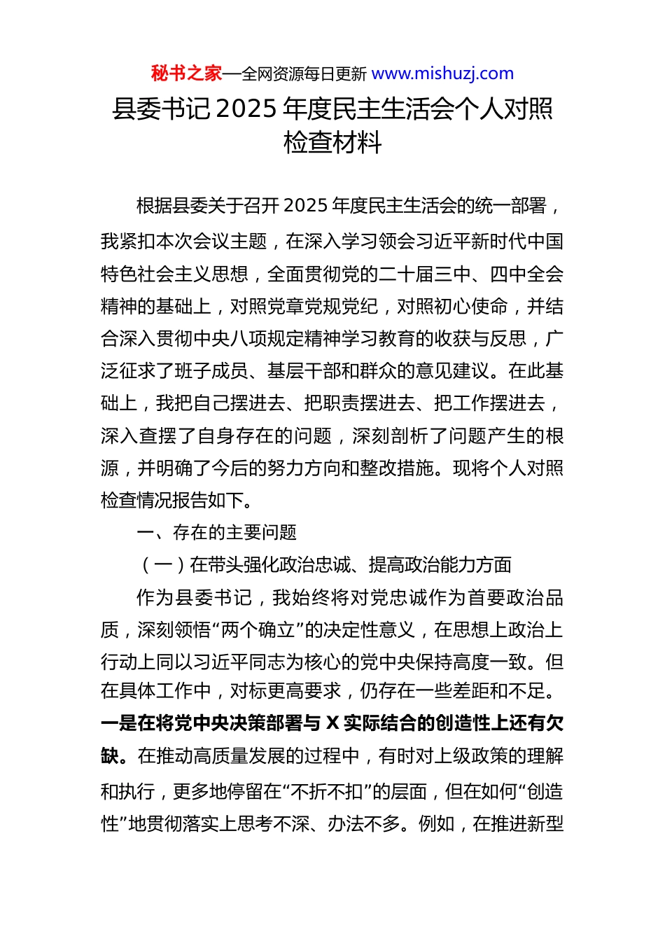 秘书之家—全网资源每日更新 www.mishuzj.com县委 2025 年度民主生活会对照检查材料汇编目录1.县委书记 2025 年度民主生活会个人对照检查材料2.县长 2025 年度民主生活会个人对照检查材料3.县委副书记 2025 年度民主生活会个人对照检查材料4.县纪委书记 2025 年度民主生活会个人对照检查材料5.县委常委、政法委书记 2025 年度民主生活会个人对照检查材料6.县委办公室主任 2025 年度民主生活会个人对照检查材料7.组织部长 2025 年度民主生活会个人对照检查材料8.县委宣传部部长 2025 年度民主生活会个人对照检查材料9.县委常委、县人民武装部部长 2025 年度民主生活会个人对照检查材料10.县委常委、统战部长 2025 年度民主生活会个人对照检查材料。秘书之家—全网资源每日更新 www.mishuzj.com县委书记 2025 年度民主生活会个人对照检查材料根据县委关于召开 2025 年度民主生活会的统一部署,我紧扣本次会议主题,在深入学习领会习近平新时代中国特色社会主义思想,全面贯彻党的二十届三中、四中全会精神的基础上,对照党章党规党纪,对照初心使命,并结合深入贯彻中央八项规定精神学习教育的收获与反思,广泛征求了班子成员、基层干部和群众的意见建议。在此基础上,我把自己摆进去、把职责摆进去、把工作摆进去,深入查摆了自身存在的问题,深刻剖析了问题产生的根源,并明确了今后的努力方向和整改措施。现将个人对照检查情况报告如下。一、存在的主要问题(一)在带头强化政治忠诚、提高政治能力方面作为县委书记,我始终将对党忠诚作为首要政治品“”质,深刻领悟 两个确立 的决定性意义,在思想上政治上行动上同以习近平同志为核心的党中央保持高度一致。但在具体工作中,对标更高要求,仍存在一些差距和不足。一是在将党中央决策部署与 X 实际结合的创造性上还有欠缺。在推动高质量发展的过程中,有时对上级政策的理解“”“和执行,更多地停留在 不折不扣 的层面,但在如何 创造”性 地贯彻落实上思考不深、办法不多。例如,在推进新型秘书之家—全网资源每日更新 www.mishuzj.com工业化建设中,面对年产 10 万吨铝棒和年产 5 万吨铝型材新材料生产基地这类重大项目,我前期的关注点更多地集中在如何快速完成审批、保障土地供应、确保项目尽快投产达效等战术执行环节,但在如何将其深度嵌入国家新材料产业战略布局、如何围绕该项目进行前瞻性的产业链培育和技术创新生态构建等战略层面的谋划上,思考的深度和系统性还不够,导致政策红利与地方发展潜力的结合度未能达到最优。二是在防范化解重大风险的预见性和敏锐性上仍需加强。面对当前复杂多变的宏观环境,虽然能够保持基本的底线思维和忧患意识,但在一些潜在风险的识别和预判上,有时存在一定的滞后性。比如,在推进新型城镇化,支持盛 X 都、X·御玺等房地产项目建设时,我更多地看到了项目对于拉动投资、提升城市品位的积极作用,但对于房地产市场波动可能引发的金融风险、社会稳定风险等传导效应,尽管有常规的风险评估,但主动进行压力测试、制定极端情况应对预案的自觉性还不够强,在“”“工作部署上存在 就事论事 的倾向,未能完全做到 草摇叶”响知鹿过、松风一起知虎来 。三是在应对复杂局面、驾驭全局的政治能力上尚有提升空间。面对经济发展、社会稳定、民生保障、生态保护等多重任务交织叠加的复杂局“”面,有时会不自觉地陷入 单打一 的思维定式,统筹兼顾的能力有待进一步提升。在 2025 年第一季度推动 23 个重大项目集中开工,总投资达 17 亿元的背景下,我将主要精秘书之家—全网资源每日更新 www.mishuzj.com力放在了项目建设进度和投资完成率上,这固然是推动发展的关键。但在项目推进过程中,对于一些非紧急但重要的工作,如干部队伍的思想动态、基层治理中出现的新情况新问题等,关注和投入的精力相对不足,导致在处理一些突发性社会矛盾时,偶尔会感到准备不够充分,未能将“”所有工作都纳入 一盘棋 中通盘考量、系统推进。(二)在带头固本培元、增强党性方面我始终坚持用习近平新时代中国特色社会主义思想凝心铸魂,注重加强党性...