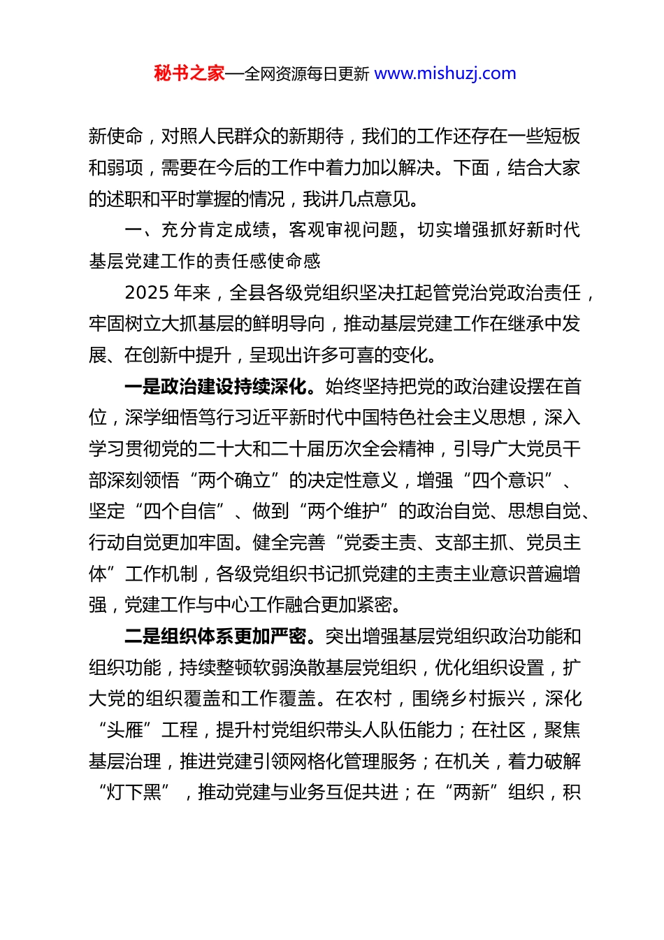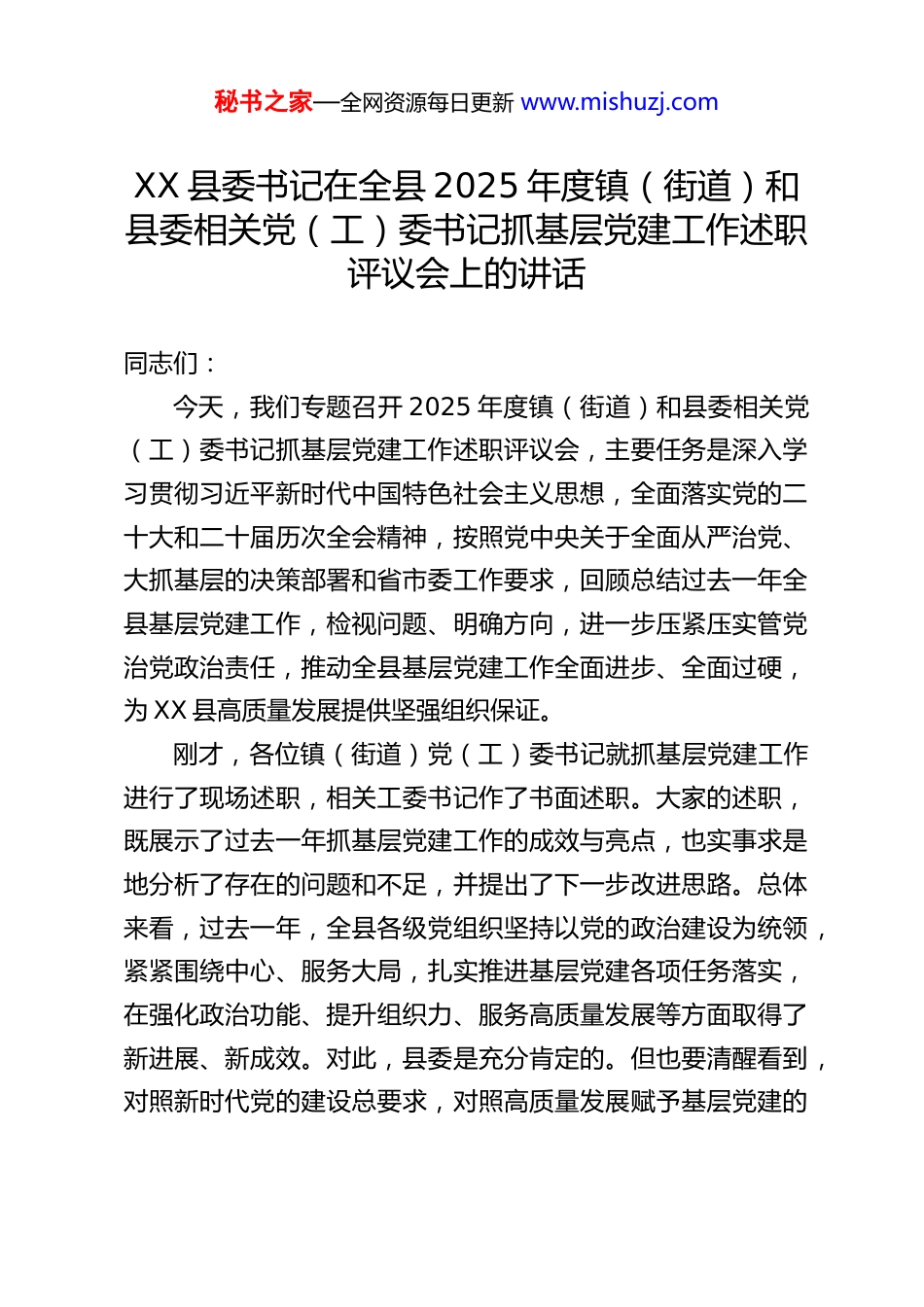 秘书之家—全网资源每日更新 www.mishuzj.comXX 县委书记在全县 2025 年度镇(街道)和县委相关党(工)委书记抓基层党建工作述职评议会上的讲话同志们:今天,我们专题召开 2025 年度镇(街道)和县委相关党(工)委书记抓基层党建工作述职评议会,主要任务是深入学习贯彻习近平新时代中国特色社会主义思想,全面落实党的二十大和二十届历次全会精神,按照党中央关于全面从严治党、大抓基层的决策部署和省市委工作要求,回顾总结过去一年全县基层党建工作,检视问题、明确方向,进一步压紧压实管党治党政治责任,推动全县基层党建工作全面进步、全面过硬,为 XX 县高质量发展提供坚强组织保证。刚才,各位镇(街道)党(工)委书记就抓基层党建工作进行了现场述职,相关工委书记作了书面述职。大家的述职,既展示了过去一年抓基层党建工作的成效与亮点,也实事求是地分析了存在的问题和不足,并提出了下一步改进思路。总体来看,过去一年,全县各级党组织坚持以党的政治建设为统领,紧紧围绕中心、服务大局,扎实推进基层党建各项任务落实,在强化政治功能、提升组织力、服务高质量发展等方面取得了新进展、新成效。对此,县委是充分肯定的。但也要清醒看到,对照新时代党的建设总要求,对照高质量发展赋予基层党建的秘书之家—全网资源每日更新 www.mishuzj.com新使命,对照人民群众的新期待,我们的工作还存在一些短板和弱项,需要在今后的工作中着力加以解决。下面,结合大家的述职和平时掌握的情况,我讲几点意见。一、充分肯定成绩,客观审视问题,切实增强抓好新时代基层党建工作的责任感使命感2025 年来,全县各级党组织坚决扛起管党治党政治责任,牢固树立大抓基层的鲜明导向,推动基层党建工作在继承中发展、在创新中提升,呈现出许多可喜的变化。一是政治建设持续深化。始终坚持把党的政治建设摆在首位,深学细悟笃行习近平新时代中国特色社会主义思想,深入学习贯彻党的二十大和二十届历次全会精神,引导广大党员干部深刻领悟“两个确立”的决定性意义,增强“四个意识”、坚定“四个自信”、做到“两个维护”的政治自觉、思想自觉、行动自觉更加牢固。健全完善“党委主责、支部主抓、党员主体”工作机制,各级党组织书记抓党建的主责主业意识普遍增强,党建工作与中心工作融合更加紧密。二是组织体系更加严密。突出增强基层党组织政治功能和组织功能,持续整顿软弱涣散基层党组织,优化组织设置,扩大党的组织覆盖和工作覆盖。在农村,围绕乡村振兴,深化“头雁”工程,提升村党组织带头人队伍能力;在社区,聚焦基层治理,推进党建引领网格化管理服务;在机关,着力破解“灯下黑”,推动党建与业务互促共进;在“两新”组织,积秘书之家—全网资源每日更新 www.mishuzj.com极探索适应新经济组织、新社会组织、新就业群体特点的党建模式,党的组织基础不断巩固。三是服务大局成效显著。坚持围绕发展抓党建、抓好党建促发展,推动党建工作与全县中心工作同频共振。在“工业强县”主战场上,各级党组织和广大党员在项目攻坚、科技创新、招商引资中勇挑重担、冲锋在前。在“强村富民”实践中,党建引领产业发展、乡村治理、环境整治的作用更加凸显,村级集体经济不断发展壮大,群众获得感、幸福感、安全感持续提升。在防范化解风险、维护安全稳定一线,基层党组织战斗堡垒作用和党员先锋模范作用得到有效发挥。四是基层基础不断夯实。持续加大基层投入保障力度,阵地建设更加规范,经费保障更加有力,基层干部待遇稳步提升。严肃党内政治生活,“三会一课”、组织生活会、民主评议党员等制度执行更加严格规范。党员教育管理监督得到加强,党员队伍结构持续优化,先锋模范作用进一步发挥。在肯定成绩的同时,我们必须坚持问题导向,清醒认识当前我县基层党建工作还存在的一些不容忽视的问题:一是责任压力传导还不够到位。少数党组织书记“第一责任人”职责意识还不够强,存在“重业务、轻党建”的现象,压力传导存在层层递减的问题,班子成员“一岗双责”落实不够均衡。二是党建与业务融合还不够深入。部分领域党建工作与中心工作结合不够紧密,存在“两张皮...
