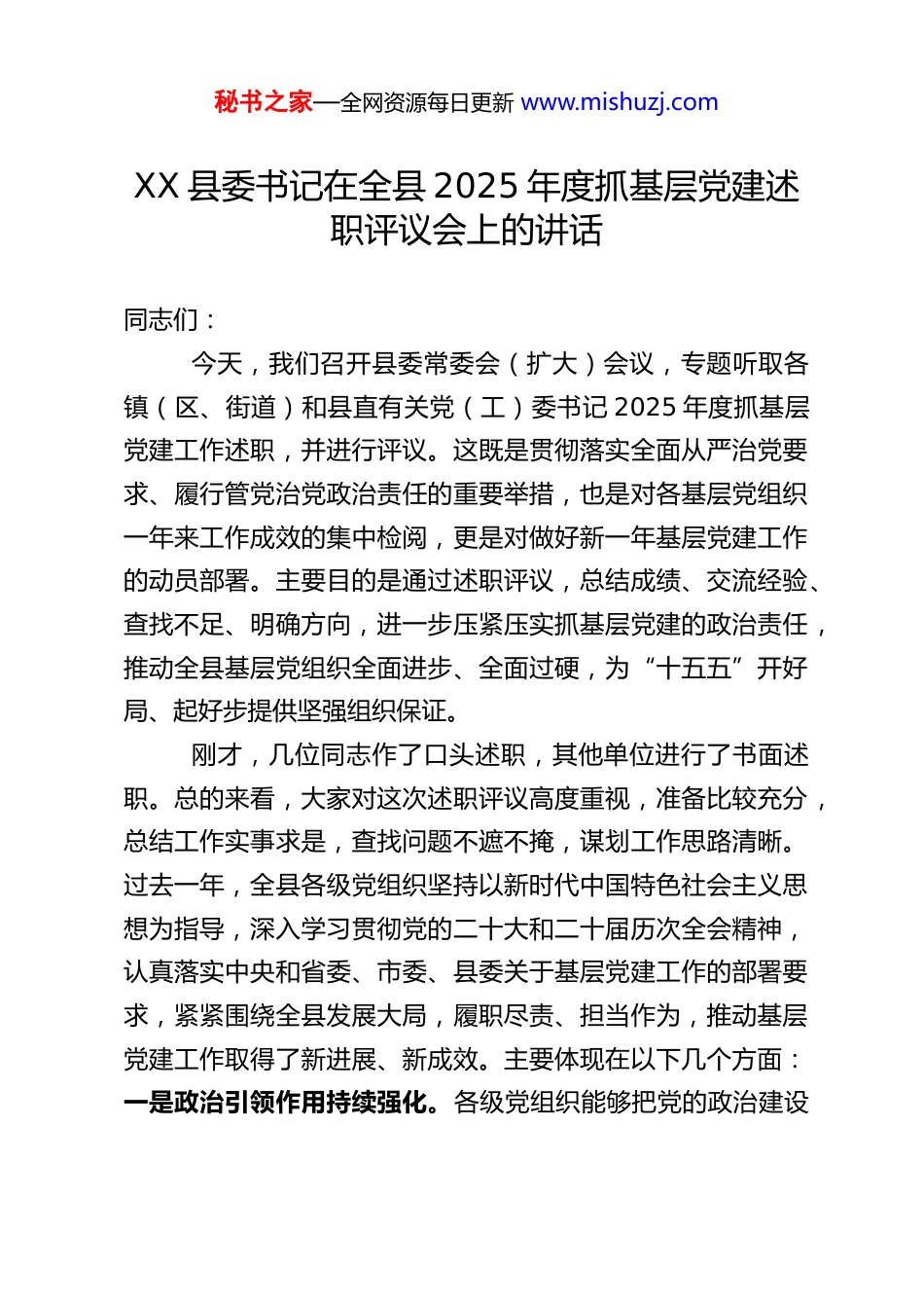 秘书之家—全网资源每日更新 www.mishuzj.comXX 县委书记在全县 2025 年度抓基层党建述职评议会上的讲话同志们:今天,我们召开县委常委会(扩大)会议,专题听取各镇(区、街道)和县直有关党(工)委书记 2025 年度抓基层党建工作述职,并进行评议。这既是贯彻落实全面从严治党要求、履行管党治党政治责任的重要举措,也是对各基层党组织一年来工作成效的集中检阅,更是对做好新一年基层党建工作的动员部署。主要目的是通过述职评议,总结成绩、交流经验、查找不足、明确方向,进一步压紧压实抓基层党建的政治责任,推动全县基层党组织全面进步、全面过硬,为“十五五”开好局、起好步提供坚强组织保证。刚才,几位同志作了口头述职,其他单位进行了书面述职。总的来看,大家对这次述职评议高度重视,准备比较充分,总结工作实事求是,查找问题不遮不掩,谋划工作思路清晰。过去一年,全县各级党组织坚持以新时代中国特色社会主义思想为指导,深入学习贯彻党的二十大和二十届历次全会精神,认真落实中央和省委、市委、县委关于基层党建工作的部署要求,紧紧围绕全县发展大局,履职尽责、担当作为,推动基层党建工作取得了新进展、新成效。主要体现在以下几个方面:一是政治引领作用持续强化。各级党组织能够把党的政治建设秘书之家—全网资源每日更新 www.mishuzj.com摆在首位,教育引导广大党员干部深刻领悟“两个确立”的决定性意义,增强“四个意识”、坚定“四个自信”、做到“两个维护”的政治自觉、思想自觉、行动自觉不断增强。二是基层组织基础更加牢固。持续推进党支部标准化规范化建设,基层党组织覆盖面和影响力进一步扩大,特别是在新兴领域和薄弱环节的党建工作得到加强。三是服务发展大局有力有效。坚持党建工作与中心任务深度融合,在推动高质量发展、深化改革开放、维护安全稳定、增进民生福祉等各项工作中,基层党组织战斗堡垒作用和党员先锋模范作用得到较好发挥。四是全面从严治党向基层延伸。持续正风肃纪反腐,着力解决群众身边的不正之风和腐败问题,基层政治生态不断净化优化。这些成绩的取得,是全县各级党组织和广大党员干部共同努力的结果。在此,我代表县委常委会,向大家表示衷心的感谢!在肯定成绩的同时,我们也要清醒地看到,对照新形势新任务新要求,我县基层党建工作还存在一些不容忽视的问题和短板。比如,有的党组织政治功能和组织功能发挥还不够充分,党建引领基层治理的效能有待进一步提升;有的领域党建工作存在薄弱环节,均衡性、协调性有待加强;有的基层党组织书记主责主业意识还不够强,抓党建的思路办法还不够多、创新性不足;有的党员教育管理还不够精细,先锋模范作用发挥不够明显;党建工作与业务工作“两张皮”的现象在一些单位仍然存在。对于这些问题,大家要在述职中点到了一些,但秘书之家—全网资源每日更新 www.mishuzj.com还需要我们深入剖析根源,采取更有力的措施加以解决。XX 同志代表县委常委会对述职情况进行了点评,既肯定了成绩,也指出了问题,提出了改进要求,点得比较准、很有针对性,希望大家认真对照检查,抓好整改落实。同志们,2026 年是全面贯彻落实党的二十届四中全会精神的关键之年,更是“十五五”规划的开局起步之年。做好今年基层党建工作,意义尤为重大、责任尤为艰巨。开局关系全局,起步决定后势。基层党建是党执政大厦的根基,根基不牢,地动山摇。面对复杂严峻的国内外形势和艰巨繁重的改革发展稳定任务,只有把基层党组织建设成为坚强战斗堡垒,把广大党员动员起来、组织起来、凝聚起来,才能有效应对各种风险挑战,才能凝聚起奋进新征程、建功新时代的磅礴力量,才能确保“十五五”发展蓝图在我县落地生根、开花结果。下面,围绕做好今年基层党建工作,我讲四点意见。一、筑牢政治忠诚,在紧跟紧随中践行初心使命,始终把稳思想之舵党的政治建设是党的根本性建设,决定党的建设方向和效果。基层党建工作,首先要从政治上看,必须把旗帜鲜明讲政治贯穿全过程、各方面。一要持续强化创新理论武装。要坚持把学懂弄通做实新时代中国特色社会主义思想作为首要政治任务,建立健全“第一议...
