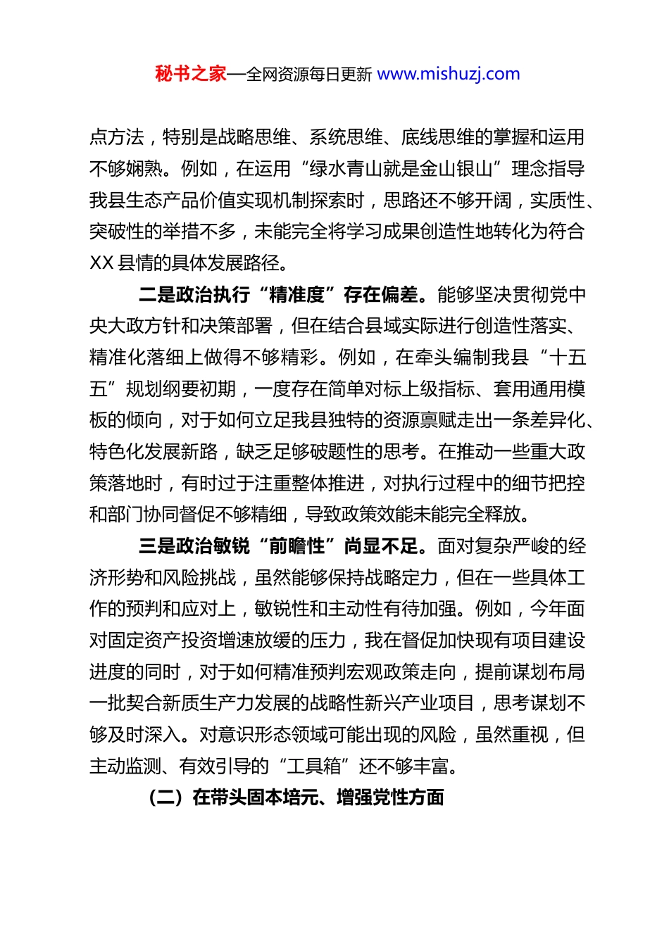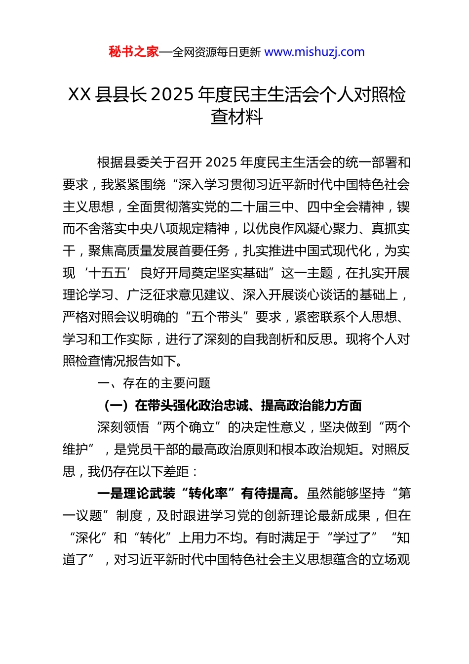 秘书之家—全网资源每日更新 www.mishuzj.comXX 县县长 2025 年度民主生活会个人对照检查材料根据县委关于召开 2025 年度民主生活会的统一部署和要求,我紧紧围绕“深入学习贯彻习近平新时代中国特色社会主义思想,全面贯彻落实党的二十届三中、四中全会精神,锲而不舍落实中央八项规定精神,以优良作风凝心聚力、真抓实干,聚焦高质量发展首要任务,扎实推进中国式现代化,为实现‘十五五’良好开局奠定坚实基础”这一主题,在扎实开展理论学习、广泛征求意见建议、深入开展谈心谈话的基础上,严格对照会议明确的“五个带头”要求,紧密联系个人思想、学习和工作实际,进行了深刻的自我剖析和反思。现将个人对照检查情况报告如下。一、存在的主要问题(一)在带头强化政治忠诚、提高政治能力方面深刻领悟“两个确立”的决定性意义,坚决做到“两个维护”,是党员干部的最高政治原则和根本政治规矩。对照反思,我仍存在以下差距:一是理论武装“转化率”有待提高。虽然能够坚持“第一议题”制度,及时跟进学习党的创新理论最新成果,但在“深化”和“转化”上用力不均。有时满足于“学过了”“知道了”,对习近平新时代中国特色社会主义思想蕴含的立场观秘书之家—全网资源每日更新 www.mishuzj.com点方法,特别是战略思维、系统思维、底线思维的掌握和运用不够娴熟。例如,在运用“绿水青山就是金山银山”理念指导我县生态产品价值实现机制探索时,思路还不够开阔,实质性、突破性的举措不多,未能完全将学习成果创造性地转化为符合XX 县情的具体发展路径。二是政治执行“精准度”存在偏差。能够坚决贯彻党中央大政方针和决策部署,但在结合县域实际进行创造性落实、精准化落细上做得不够精彩。例如,在牵头编制我县“十五五”规划纲要初期,一度存在简单对标上级指标、套用通用模板的倾向,对于如何立足我县独特的资源禀赋走出一条差异化、特色化发展新路,缺乏足够破题性的思考。在推动一些重大政策落地时,有时过于注重整体推进,对执行过程中的细节把控和部门协同督促不够精细,导致政策效能未能完全释放。三是政治敏锐“前瞻性”尚显不足。面对复杂严峻的经济形势和风险挑战,虽然能够保持战略定力,但在一些具体工作的预判和应对上,敏锐性和主动性有待加强。例如,今年面对固定资产投资增速放缓的压力,我在督促加快现有项目建设进度的同时,对于如何精准预判宏观政策走向,提前谋划布局一批契合新质生产力发展的战略性新兴产业项目,思考谋划不够及时深入。对意识形态领域可能出现的风险,虽然重视,但主动监测、有效引导的“工具箱”还不够丰富。(二)在带头固本培元、增强党性方面秘书之家—全网资源每日更新 www.mishuzj.com党性是党员干部立身、立业、立言、立德的基石。对照反思,我存在以下不足:一是党性锤炼的“自觉性”有所松懈。随着事务性工作增多,有时不自觉地将更多精力投入到具体行政事务中,静下心来读原著、学原文、悟原理的时间被挤占。参加所在党支部的组织生活有时存在“赶场”现象,以普通党员身份与同志们进行思想交流、接受监督帮助的深度不够。运用批评和自我批评武器时,自我剖析可以更深,但对同志的批评有时碍于情面,“辣味”不足,未能完全达到“红脸出汗”的效果。二是理想信念的“总开关”拧得不够紧。虽然能够坚守共产党人精神追求,但对照革命先辈和先进典型,反躬自省、主动对标的频率和标准不够高。在纷繁复杂的社会思潮和现实考验面前,从世界观、人生观、价值观层面进行持续、深刻的自我改造和党性体检不够经常。对一些深层次理论问题的钻研不够透彻,运用马克思主义立场观点方法分析和解决实际问题的理论底蕴支撑有时显得不足。三是道德修为的“高标准”坚持不够。能够注重个人品德修养,但有时在“八小时之外”的自我约束上有所放松。艰苦奋斗、勤俭节约的“传家宝”意识有所弱化,对办公经费、项目预算的审核把关,虽然符合规定,但从严从紧、精打细算的意识可以更强。在弘扬清风正气、抵制不良风气方面,虽然自身能做到,但带头在全社会倡导践行做得还不够充分。秘书之家—全网资源每日更新 www.mishuzj.com(三)在...