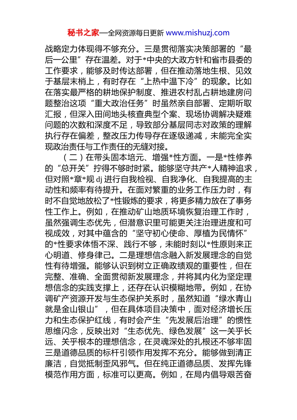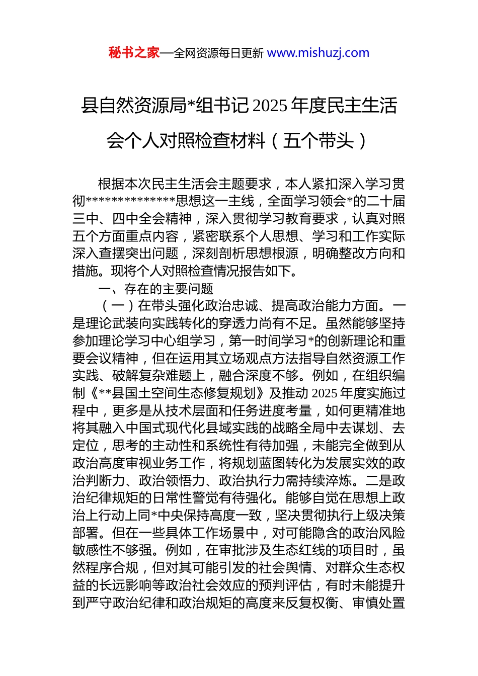 秘书之家—全网资源每日更新 www.mishuzj.com县自然资源局*组书记 2025 年度民主生活会个人对照检查材料(五个带头)根据本次民主生活会主题要求,本人紧扣深入学习贯彻**************思想这一主线,全面学习领会*的二十届三中、四中全会精神,深入贯彻学习教育要求,认真对照五个方面重点内容,紧密联系个人思想、学习和工作实际深入查摆突出问题,深刻剖析思想根源,明确整改方向和措施。现将个人对照检查情况报告如下。一、存在的主要问题(一)在带头强化政治忠诚、提高政治能力方面。一是理论武装向实践转化的穿透力尚有不足。虽然能够坚持参加理论学习中心组学习,第一时间学习*的创新理论和重要会议精神,但在运用其立场观点方法指导自然资源工作实践、破解复杂难题上,融合深度不够。例如,在组织编制《**县国土空间生态修复规划》及推动 2025 年度实施过程中,更多是从技术层面和任务进度考量,如何更精准地将其融入中国式现代化县域实践的战略全局中去谋划、去定位,思考的主动性和系统性有待加强,未能完全做到从政治高度审视业务工作,将规划蓝图转化为发展实效的政治判断力、政治领悟力、政治执行力需持续淬炼。二是政治纪律规矩的日常性警觉有待强化。能够自觉在思想上政治上行动上同*中央保持高度一致,坚决贯彻执行上级决策部署。但在一些具体工作场景中,对可能隐含的政治风险敏感性不够强。例如,在审批涉及生态红线的项目时,虽然程序合规,但对其可能引发的社会舆情、对群众生态权益的长远影响等政治社会效应的预判评估,有时未能提升到严守政治纪律和政治规矩的高度来反复权衡、审慎处置秘书之家—全网资源每日更新 www.mishuzj.com战略定力体现得不够充分。三是贯彻落实决策部署的“最后一公里”存在温差。对于*中央的大政方针和省市县委的工作要求,能够及时传达部署,但在推动落地生根、见效于基层末梢上,有时存在“上热中温下冷”的现象。比如在落实最严格的耕地保护制度、推进农村乱占耕地建房问题整治这项“重大政治任务”时虽然亲自部署、定期听取汇报,但深入田间地头核查典型个案、现场协调解决疑难问题的次数和深度不足,导致部分基层同志对政策的理解执行存在偏差,整改压力传导存在逐级递减,未能完全实现政治责任与工作责任的无缝对接。(二)在带头固本培元、增强*性方面。一是*性修养的“总开关”拧得不够时时紧。能够坚守共产*人精神追求,但对照*章*规 dj 进行自我检视、自我净化、自我提高的主动性和频率有待提升。在面对繁重的业务工作压力时,有时不自觉地放松了*性锻炼的要求,将更多精力放在了事务性工作上。例如,在推动矿山地质环境恢复治理工作时,虽然强调生态优先,但潜意识里可能更关注治理进度和可视成效,对其中蕴含的“坚守初心使命、厚植为民情怀”的*性要求体悟不深、践行不够,未能时刻以*性原则来正心明道、修身律己。二是理想信念融入新发展理念的自觉性有待增强。能够认识到树立正确政绩观的重要性,但在完整、准确、全面贯彻新发展理念,并将其内化为坚定理想信念的实践支撑上,还存在认识模糊地带。例如,在协调矿产资源开发与生态保护关系时,虽然知道“绿水青山就是金山银山”,但在具体项目决策中,面对经济增长压力和生态保护红线,有时会产生“先发展后治理”的惯性思维闪念,反映出对“生态优先、绿色发展”这一关乎长远、关乎根本的理想信念,在灵魂深处的扎根还不够牢固三是道德品质的标杆引领作用发挥不充分。能够做到清正廉洁,自觉抵制歪风邪气。但在纯正道德品质、发挥先锋模范作用方面,标准可以更高。例如,在局内倡导艰苦奋秘书之家—全网资源每日更新 www.mishuzj.com斗、勤俭节约的作风时,虽然自身能做到,但对他人在公务接待、办公耗材等方面存在的细微浪费现象,有时碍于情面,批评提醒不够直接、不够经常,未能以“严于律己”的同样标准“严管所辖”,在弘扬共产*人高尚道德情操上,带头作用和辐射效应有待进一步彰显。(三)在带头敬畏人民、敬畏组织、敬畏法纪方面。一是践行“四下基层”制度的深度和温度有欠缺。虽然能够按要求下基层调研,但有时调研安排偏重于听汇报、看亮点,...