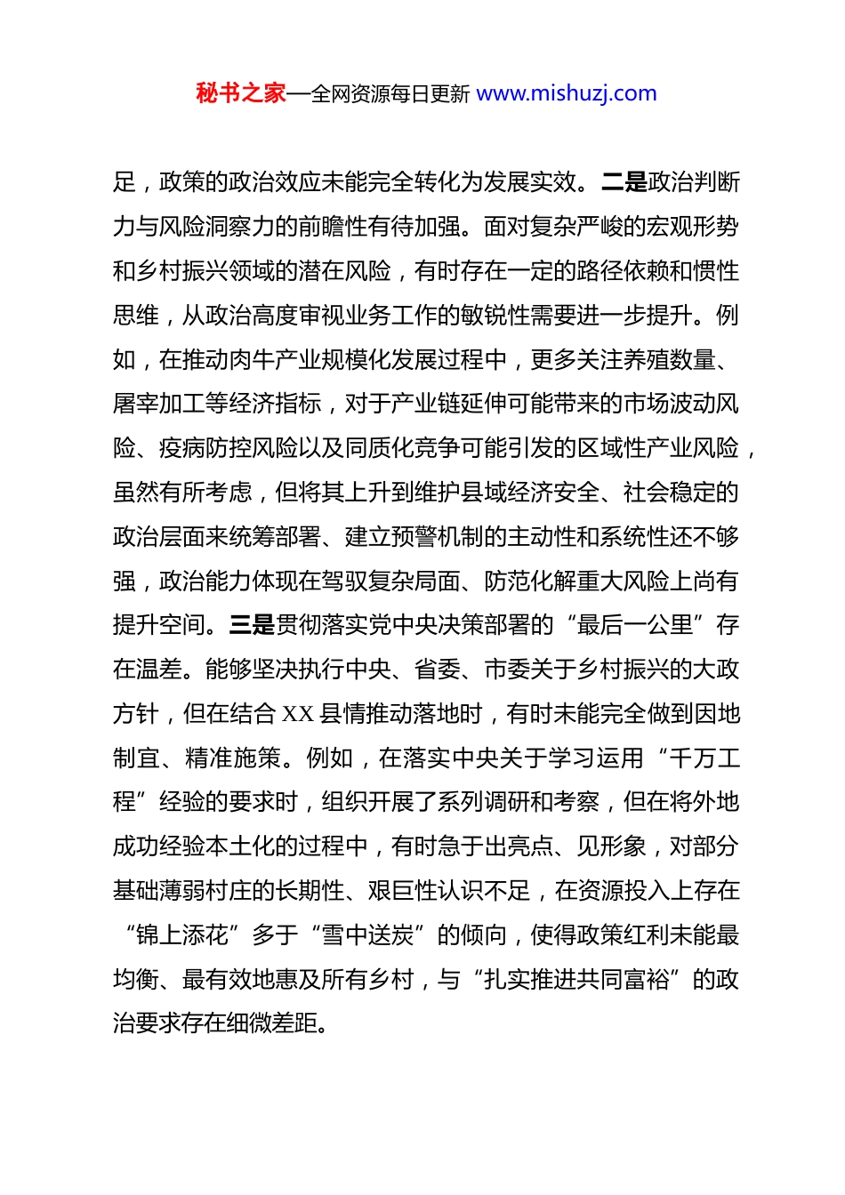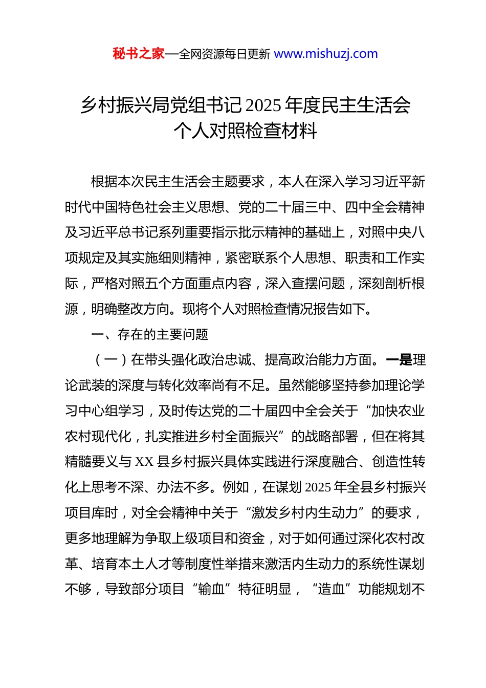秘书之家—全网资源每日更新 www.mishuzj.com乡村振兴局党组书记 2025 年度民主生活会个人对照检查材料 根据本次民主生活会主题要求,本人在深入学习习近平新时代中国特色社会主义思想、党的二十届三中、四中全会精神及习近平总书记系列重要指示批示精神的基础上,对照中央八项规定及其实施细则精神,紧密联系个人思想、职责和工作实际,严格对照五个方面重点内容,深入查摆问题,深刻剖析根源,明确整改方向。现将个人对照检查情况报告如下。一、存在的主要问题(一)在带头强化政治忠诚、提高政治能力方面。一是理论武装的深度与转化效率尚有不足。虽然能够坚持参加理论学习中心组学习,及时传达党的二十届四中全会关于“加快农业农村现代化,扎实推进乡村全面振兴”的战略部署,但在将其精髓要义与 XX 县乡村振兴具体实践进行深度融合、创造性转化上思考不深、办法不多。例如,在谋划 2025 年全县乡村振兴项目库时,对全会精神中关于“激发乡村内生动力”的要求,更多地理解为争取上级项目和资金,对于如何通过深化农村改革、培育本土人才等制度性举措来激活内生动力的系统性谋划不够,导致部分项目“输血”特征明显,“造血”功能规划不秘书之家—全网资源每日更新 www.mishuzj.com足,政策的政治效应未能完全转化为发展实效。二是政治判断力与风险洞察力的前瞻性有待加强。面对复杂严峻的宏观形势和乡村振兴领域的潜在风险,有时存在一定的路径依赖和惯性思维,从政治高度审视业务工作的敏锐性需要进一步提升。例如,在推动肉牛产业规模化发展过程中,更多关注养殖数量、屠宰加工等经济指标,对于产业链延伸可能带来的市场波动风险、疫病防控风险以及同质化竞争可能引发的区域性产业风险,虽然有所考虑,但将其上升到维护县域经济安全、社会稳定的政治层面来统筹部署、建立预警机制的主动性和系统性还不够强,政治能力体现在驾驭复杂局面、防范化解重大风险上尚有提升空间。三是贯彻落实党中央决策部署的“最后一公里”存在温差。能够坚决执行中央、省委、市委关于乡村振兴的大政方针,但在结合 XX 县情推动落地时,有时未能完全做到因地制宜、精准施策。例如,在落实中央关于学习运用“千万工程”经验的要求时,组织开展了系列调研和考察,但在将外地成功经验本土化的过程中,有时急于出亮点、见形象,对部分基础薄弱村庄的长期性、艰巨性认识不足,在资源投入上存在“锦上添花”多于“雪中送炭”的倾向,使得政策红利未能最均衡、最有效地惠及所有乡村,与“扎实推进共同富裕”的政治要求存在细微差距。秘书之家—全网资源每日更新 www.mishuzj.com(二)在带头固本培元、增强党性方面。一是理想信念的内化践行存在“知行间隙”。能够认识到习近平新时代中国特色社会主义思想是指导乡村振兴工作的根本遵循,但在将其蕴含的立场、观点、方法真正融入日常决策、转化为行动自觉方面,仍有提升余地。例如,在项目资金分配决策中,虽然强调要公平公正,但潜意识里有时会倾向于选择实施难度小、见效快的“保险”项目,对于那些需要攻坚克难、但长期效益显著、更能体现新发展理念的生态修复或科技兴农项目,推动的决心和力度相对不足,这反映出在改造主观世界、锤炼坚强党性上仍需持续用力,“总开关”拧得不够紧。二是党性原则在复杂情境下的刚性约束力有待强化。能够自觉用党章党规党纪约束言行,但在面对一些历史遗留问题或部门协调难题时,有时为了推动工作、求得“最大公约数”,在原则性问题上存在一定的灵活性,斗争精神有所弱化。例如,在协调推进某个跨乡镇的流域面源污染治理项目时,面对个别乡镇因局部利益提出的变通要求,虽然坚持了治理标准,但在执行时限和考核问责上有所迁就,未能完全做到“寸步不让”,党性修养在直面矛盾、敢于碰硬的具体实践中经受的考验还不够充分。三是为民情怀在躬身实践中的温度传导不够充分。深知乡村振兴为了人民、依靠人民,但在具体工作中,沉浸于事务性工作多,主动深入秘书之家—全网资源每日更新 www.mishuzj.com田间地头与群众“坐在一条板凳上”谈心交流的时间相对不足。例如,在制定农村人居环境整治提升方案时,虽...