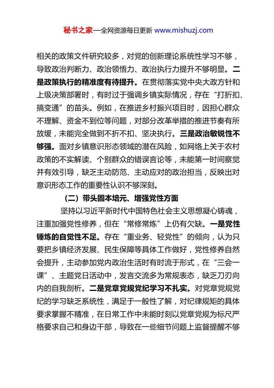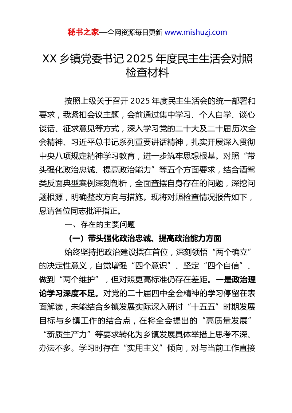 秘书之家—全网资源每日更新 www.mishuzj.comXX 乡镇党委书记 2025 年度民主生活会对照检查材料按照上级关于召开 2025 年度民主生活会的统一部署和要求,我紧扣会议主题,会前通过集中学习、个人自学、谈心谈话、征求意见等方式,深入学习党的二十大及二十届历次全会精神、习近平总书记系列重要讲话精神,扎实开展深入贯彻中央八项规定精神学习教育,进一步筑牢思想根基。对照“带头强化政治忠诚、提高政治能力”等五个方面要求,结合酒驾类反面典型案例深刻剖析,全面查摆自身存在的问题,深挖问题根源,明确整改方向与措施。现将对照检查情况报告如下,恳请各位同志批评指正。一、存在的主要问题(一)带头强化政治忠诚、提高政治能力方面始终坚持把政治建设摆在首位,深刻领悟“两个确立”的决定性意义,自觉增强“四个意识”、坚定“四个自信”、做到“两个维护”,但对照更高标准仍存在差距。一是政治理论学习深度不足。对党的二十届四中全会精神的学习停留在表面解读,未能结合乡镇发展实际深入研讨“十五五”时期发展目标与乡镇工作的结合点,在将全会提出的“高质量发展”“新质生产力”等要求转化为乡镇发展具体举措上思考不深、办法不多。学习时存在“实用主义”倾向,对与当前工作直接秘书之家—全网资源每日更新 www.mishuzj.com相关的政策文件研究较多,对党的创新理论系统性学习不够,导致政治判断力、政治领悟力、政治执行力提升不够明显。二是政策执行的精准度有待提升。在贯彻落实党中央大政方针和上级决策部署时,有时过于强调乡镇实际情况,存在“打折扣、搞变通”的苗头。例如,在推进乡村振兴项目时,因担心群众不理解、资金不到位等问题,对部分改革举措的推进节奏有所放缓,未能完全做到不折不扣、坚决执行。三是政治敏锐性不够强。面对乡镇意识形态领域的潜在风险,如网络上关于农村政策的不实解读、个别群众的错误言论等,未能第一时间察觉并有效引导,缺乏主动防范、主动应对的政治担当,反映出对意识形态工作的重要性认识不够深刻。(二)带头固本培元、增强党性方面坚持以习近平新时代中国特色社会主义思想凝心铸魂,注重加强党性修养,但在“常修常炼”上仍有欠缺。一是党性锤炼的自觉性不足。存在“重业务、轻党性”的倾向,认为只要把乡镇经济发展、民生保障等具体工作做好,党性修养自然会提升,主动参加党内政治生活时有时流于形式,在“三会一课”、主题党日活动中,发言交流多为常规表态,缺乏刀刃向内的自我剖析。二是党章党规党纪学习不扎实。对党章党规党纪的学习缺乏系统性,满足于一般性了解,对纪律规矩的具体要求掌握不精准,在日常工作中未能时刻以党章党规为标尺严格要求自己和身边干部,导致在一些细节问题上监督提醒不够秘书之家—全网资源每日更新 www.mishuzj.com到位。三是理想信念与实际工作结合不紧密。在面对乡镇工作中的复杂矛盾和繁重任务时,有时会产生畏难情绪,缺乏“逢山开路、遇水架桥”的奋斗精神,未能始终以共产党人的精神追求引领工作实践,在解决世界观、人生观、价值观这个“总开关”问题上仍需持续发力。(三)带头敬畏人民、敬畏组织、敬畏法纪方面始终牢记党的根本宗旨,坚持以人民为中心的发展思想,但在践行“三个敬畏”的深度和广度上仍有差距。一是群众工作不够扎实。落实“四下基层”制度不够到位,下村入户调研时存在“走马观花”现象,有时提前安排路线、预设问题,未能真正深入群众了解所思所想所盼。对群众反映强烈的农村饮水安全、农田水利设施维修等急难愁盼问题,虽然能够安排部署,但跟踪督办不够有力,部分问题解决不及时、不彻底,导致群众满意度提升缓慢。二是民主集中制执行不够严格。在乡镇党委班子议事决策时,有时因担心会议效率,对一些重大事项的讨论不够充分,存在“先定调、后讨论”的情况,未能充分听取班子成员的不同意见,在一定程度上影响了决策的科学性。对分管副职的工作放手不够,存在“管得过多、过细”的问题,不利于充分调动班子成员的工作积极性。三是法纪敬畏之心有所弱化。虽然能够自觉遵守党纪国法,但在日常工作中,对一些“小节”问题不够重视,如有时接受...