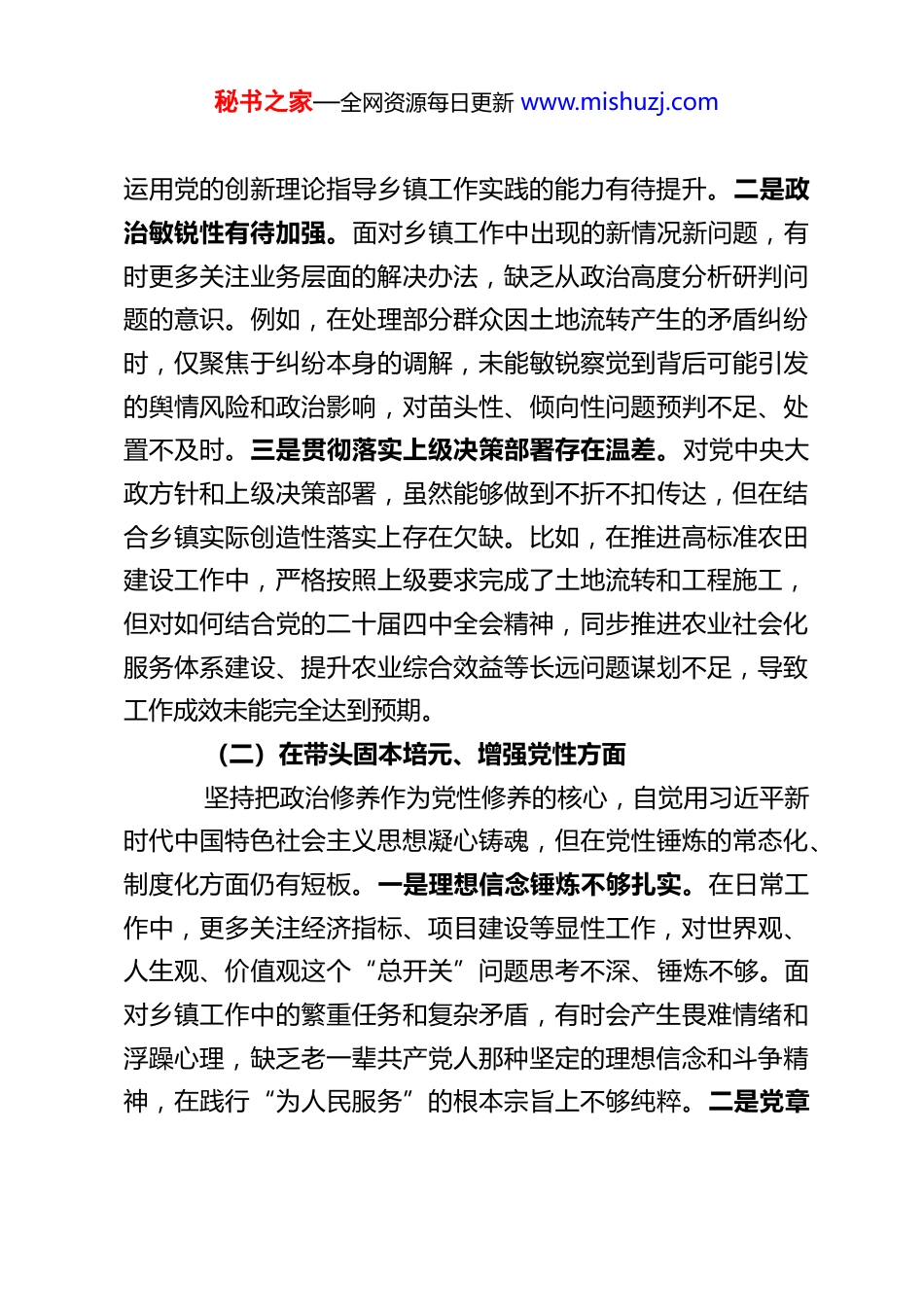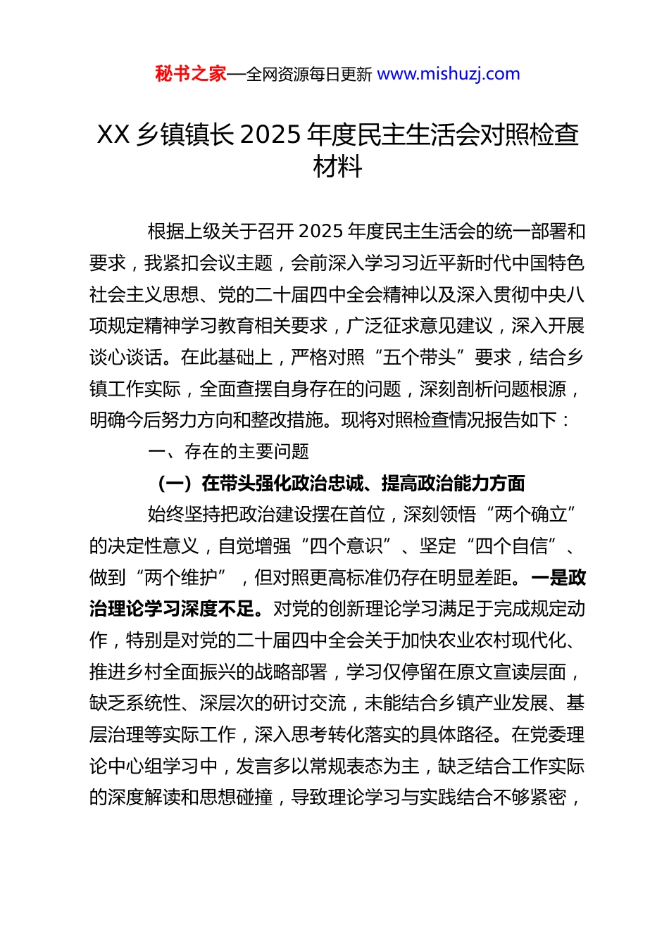 秘书之家—全网资源每日更新 www.mishuzj.comXX 乡镇镇长 2025 年度民主生活会对照检查材料根据上级关于召开 2025 年度民主生活会的统一部署和要求,我紧扣会议主题,会前深入学习习近平新时代中国特色社会主义思想、党的二十届四中全会精神以及深入贯彻中央八项规定精神学习教育相关要求,广泛征求意见建议,深入开展谈心谈话。在此基础上,严格对照“五个带头”要求,结合乡镇工作实际,全面查摆自身存在的问题,深刻剖析问题根源,明确今后努力方向和整改措施。现将对照检查情况报告如下:一、存在的主要问题(一)在带头强化政治忠诚、提高政治能力方面始终坚持把政治建设摆在首位,深刻领悟“两个确立”的决定性意义,自觉增强“四个意识”、坚定“四个自信”、做到“两个维护”,但对照更高标准仍存在明显差距。一是政治理论学习深度不足。对党的创新理论学习满足于完成规定动作,特别是对党的二十届四中全会关于加快农业农村现代化、推进乡村全面振兴的战略部署,学习仅停留在原文宣读层面,缺乏系统性、深层次的研讨交流,未能结合乡镇产业发展、基层治理等实际工作,深入思考转化落实的具体路径。在党委理论中心组学习中,发言多以常规表态为主,缺乏结合工作实际的深度解读和思想碰撞,导致理论学习与实践结合不够紧密,秘书之家—全网资源每日更新 www.mishuzj.com运用党的创新理论指导乡镇工作实践的能力有待提升。二是政治敏锐性有待加强。面对乡镇工作中出现的新情况新问题,有时更多关注业务层面的解决办法,缺乏从政治高度分析研判问题的意识。例如,在处理部分群众因土地流转产生的矛盾纠纷时,仅聚焦于纠纷本身的调解,未能敏锐察觉到背后可能引发的舆情风险和政治影响,对苗头性、倾向性问题预判不足、处置不及时。三是贯彻落实上级决策部署存在温差。对党中央大政方针和上级决策部署,虽然能够做到不折不扣传达,但在结合乡镇实际创造性落实上存在欠缺。比如,在推进高标准农田建设工作中,严格按照上级要求完成了土地流转和工程施工,但对如何结合党的二十届四中全会精神,同步推进农业社会化服务体系建设、提升农业综合效益等长远问题谋划不足,导致工作成效未能完全达到预期。(二)在带头固本培元、增强党性方面坚持把政治修养作为党性修养的核心,自觉用习近平新时代中国特色社会主义思想凝心铸魂,但在党性锤炼的常态化、制度化方面仍有短板。一是理想信念锤炼不够扎实。在日常工作中,更多关注经济指标、项目建设等显性工作,对世界观、人生观、价值观这个“总开关”问题思考不深、锤炼不够。面对乡镇工作中的繁重任务和复杂矛盾,有时会产生畏难情绪和浮躁心理,缺乏老一辈共产党人那种坚定的理想信念和斗争精神,在践行“为人民服务”的根本宗旨上不够纯粹。二是党章秘书之家—全网资源每日更新 www.mishuzj.com党规党纪学习不够深入。对党章党规党纪的学习存在碎片化现象,满足于知道大概内容,对具体条款的理解不够精准,在工作中未能完全做到用党性原则正心明道、修身律己。例如,在开展村级事务监督时,对部分村干部轻微违纪问题的处置,因对纪律条款把握不准,存在处置标准不够统一、处理力度不够到位的情况。三是党性修养与履职尽责结合不够紧密。在推进乡村振兴、民生保障等工作中,有时存在重结果轻过程、重速度轻质量的倾向,未能始终以党性原则为标尺衡量工作成效。比如,在推进人居环境整治工作中,为了尽快完成上级考核指标,对部分村庄的整治存在“表面化”“一刀切”现象,未能充分考虑群众实际需求,体现出为民情怀的厚度不足。(三)在带头敬畏人民、敬畏组织、敬畏法纪方面始终牢记党的根本宗旨,严格遵守组织纪律和法律法规,但在践行“三个敬畏”的自觉性和坚定性上仍需提升。一是践行新时代群众路线不够扎实。虽然能够落实“四下基层”制度,但深入群众、服务群众的质效不高。调研走访存在“走马观花”现象,往往是提前安排路线、确定对象,深入田间地头、农户家中倾听群众真实诉求不够,对群众反映强烈的农村养老、医疗保障、基础设施配套等急难愁盼问题,有时因忙于日常事务未能及时跟进解决,导致部分群众满意度不高...