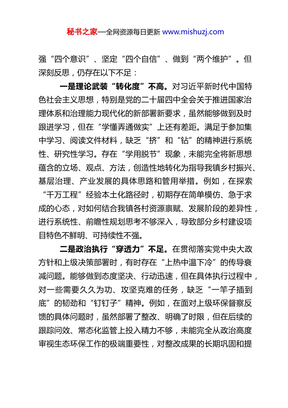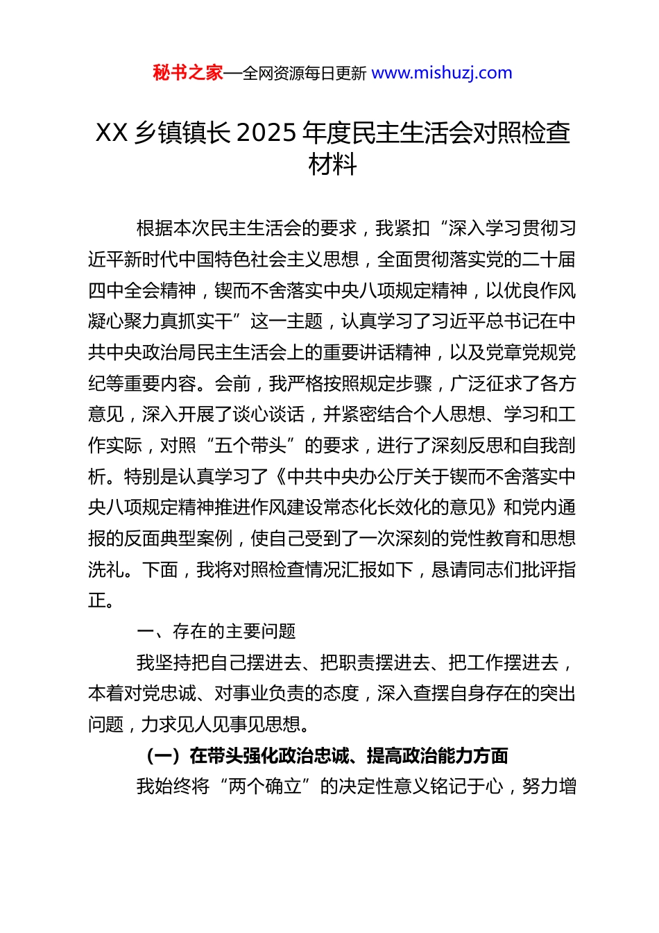 秘书之家—全网资源每日更新 www.mishuzj.comXX 乡镇镇长 2025 年度民主生活会对照检查材料根据本次民主生活会的要求,我紧扣“深入学习贯彻习近平新时代中国特色社会主义思想,全面贯彻落实党的二十届四中全会精神,锲而不舍落实中央八项规定精神,以优良作风凝心聚力真抓实干”这一主题,认真学习了习近平总书记在中共中央政治局民主生活会上的重要讲话精神,以及党章党规党纪等重要内容。会前,我严格按照规定步骤,广泛征求了各方意见,深入开展了谈心谈话,并紧密结合个人思想、学习和工作实际,对照“五个带头”的要求,进行了深刻反思和自我剖析。特别是认真学习了《中共中央办公厅关于锲而不舍落实中央八项规定精神推进作风建设常态化长效化的意见》和党内通报的反面典型案例,使自己受到了一次深刻的党性教育和思想洗礼。下面,我将对照检查情况汇报如下,恳请同志们批评指正。一、存在的主要问题我坚持把自己摆进去、把职责摆进去、把工作摆进去,本着对党忠诚、对事业负责的态度,深入查摆自身存在的突出问题,力求见人见事见思想。(一)在带头强化政治忠诚、提高政治能力方面我始终将“两个确立”的决定性意义铭记于心,努力增秘书之家—全网资源每日更新 www.mishuzj.com强“四个意识”、坚定“四个自信”、做到“两个维护”。但深刻反思,仍存在以下不足:一是理论武装“转化度”不高。对习近平新时代中国特色社会主义思想,特别是党的二十届四中全会关于推进国家治理体系和治理能力现代化的新部署新要求,虽然能够做到及时跟进学习,但在“学懂弄通做实”上还有差距。满足于参加集中学习、阅读文件材料,缺乏“挤”和“钻”的精神进行系统性、研究性学习。存在“学用脱节”现象,未能完全将新思想蕴含的立场、观点、方法,创造性地转化为指导我镇乡村振兴、基层治理、产业发展的具体思路和管用举措。例如,在探索“千万工程”经验本土化路径时,初期存在简单模仿、急于求成的心态,对如何结合我镇各村资源禀赋、发展阶段的差异性,进行系统性、前瞻性规划思考不够深入,导致部分乡村建设项目特色不鲜明、可持续性不强。二是政治执行“穿透力”不足。在贯彻落实党中央大政方针和上级决策部署时,有时存在“上热中温下冷”的传导衰减问题。能够做到态度坚决、行动迅速,但在具体执行过程中,对一些需要久久为功、攻坚克难的任务,缺乏“一竿子插到底”的韧劲和“钉钉子”精神。例如,在面对上级环保督察反馈的具体问题时,虽然部署了整改、明确了时限,但在后续的跟踪问效、常态化监管上投入精力不够,未能完全从政治高度审视生态环保工作的极端重要性,对整改成果的长期巩固和提秘书之家—全网资源每日更新 www.mishuzj.com升缺乏有效机制保障,导致个别问题存在反弹风险。三是政治敏锐“鉴别力”不强。对社会上一些错误思潮和模糊认识,警惕性不够高,未能时刻从政治角度观察、分析和处理问题。在日常工作中,对一些可能影响政治安全、意识形态安全的苗头性、倾向性问题,敏感性不足,未能做到见微知著、防患于未然。例如,对农村网络舆情中出现的杂音,有时简单地视为一般性社会议论,缺乏主动引导、正面回应的意识和有效手段,未能完全将“两个维护”的政治要求融入日常言行和工作细节。(二)在带头固本培元、增强党性方面我深知党性是党员干部立身、立业、立言、立德的基石,始终努力以党员标准严格要求自己。但对照检查,仍有差距:一是党性锤炼的“主动性”有所弱化。随着职务提升和工作繁忙,有时不自觉地放松了持续性的党性锻炼。参加“三会一课”、组织生活会等党内政治生活,有时存在“例行公事”的心态,会前准备不够充分,会上未能真正把自己“摆进去”,运用批评与自我批评武器“红脸出汗”不够经常。自我批评有时碍于情面、怕丢“面子”,对深层次问题触及不够;相互批评时,有时存在“好人主义”思想,以提希望、谈建议代替点问题,使得党内政治生活的“熔炉”作用未能得到充分发挥。二是理想信念的“内化度”有待加深。对马克思主义信秘书之家—全网资源每日更新 www.mishuzj.com仰、中国特色社会主义信念是真诚的,但将其内化为坚不可摧的...