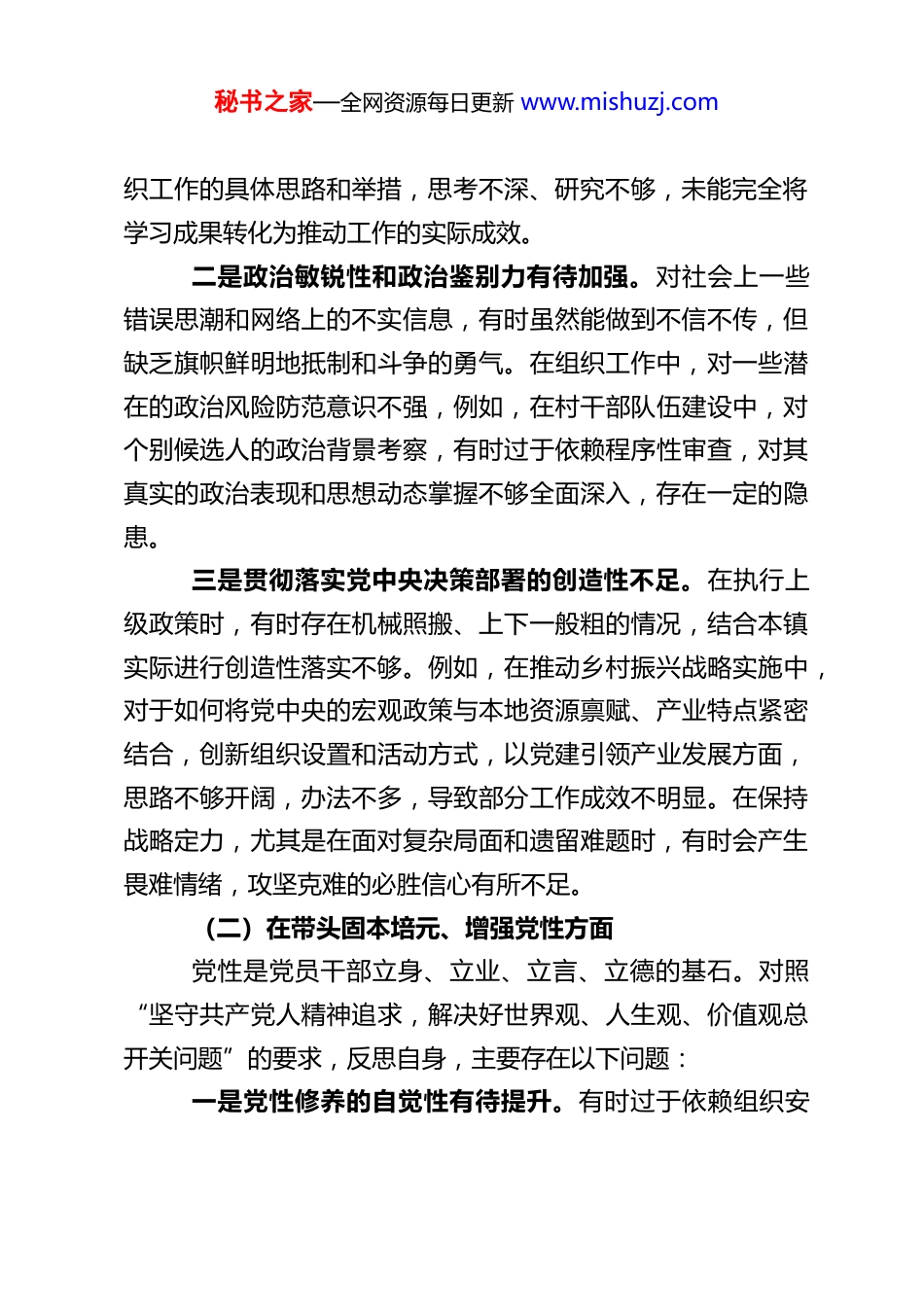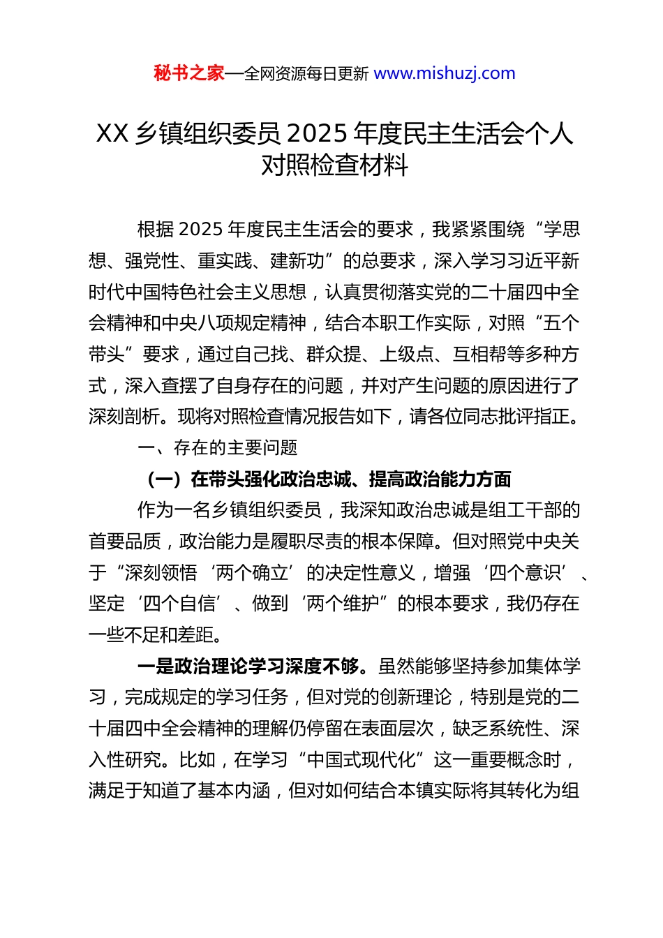 秘书之家—全网资源每日更新 www.mishuzj.comXX 乡镇组织委员 2025 年度民主生活会个人对照检查材料根据 2025 年度民主生活会的要求,我紧紧围绕“学思想、强党性、重实践、建新功”的总要求,深入学习习近平新时代中国特色社会主义思想,认真贯彻落实党的二十届四中全会精神和中央八项规定精神,结合本职工作实际,对照“五个带头”要求,通过自己找、群众提、上级点、互相帮等多种方式,深入查摆了自身存在的问题,并对产生问题的原因进行了深刻剖析。现将对照检查情况报告如下,请各位同志批评指正。一、存在的主要问题(一)在带头强化政治忠诚、提高政治能力方面作为一名乡镇组织委员,我深知政治忠诚是组工干部的首要品质,政治能力是履职尽责的根本保障。但对照党中央关于“深刻领悟‘两个确立’的决定性意义,增强‘四个意识’、坚定‘四个自信’、做到‘两个维护”的根本要求,我仍存在一些不足和差距。一是政治理论学习深度不够。虽然能够坚持参加集体学习,完成规定的学习任务,但对党的创新理论,特别是党的二十届四中全会精神的理解仍停留在表面层次,缺乏系统性、深入性研究。比如,在学习“中国式现代化”这一重要概念时,满足于知道了基本内涵,但对如何结合本镇实际将其转化为组秘书之家—全网资源每日更新 www.mishuzj.com织工作的具体思路和举措,思考不深、研究不够,未能完全将学习成果转化为推动工作的实际成效。二是政治敏锐性和政治鉴别力有待加强。对社会上一些错误思潮和网络上的不实信息,有时虽然能做到不信不传,但缺乏旗帜鲜明地抵制和斗争的勇气。在组织工作中,对一些潜在的政治风险防范意识不强,例如,在村干部队伍建设中,对个别候选人的政治背景考察,有时过于依赖程序性审查,对其真实的政治表现和思想动态掌握不够全面深入,存在一定的隐患。三是贯彻落实党中央决策部署的创造性不足。在执行上级政策时,有时存在机械照搬、上下一般粗的情况,结合本镇实际进行创造性落实不够。例如,在推动乡村振兴战略实施中,对于如何将党中央的宏观政策与本地资源禀赋、产业特点紧密结合,创新组织设置和活动方式,以党建引领产业发展方面,思路不够开阔,办法不多,导致部分工作成效不明显。在保持战略定力,尤其是在面对复杂局面和遗留难题时,有时会产生畏难情绪,攻坚克难的必胜信心有所不足。(二)在带头固本培元、增强党性方面党性是党员干部立身、立业、立言、立德的基石。对照“坚守共产党人精神追求,解决好世界观、人生观、价值观总开关问题”的要求,反思自身,主要存在以下问题:一是党性修养的自觉性有待提升。有时过于依赖组织安秘书之家—全网资源每日更新 www.mishuzj.com排的学习教育活动,主动运用习近平新时代中国特色社会主义思想改造主观世界的积极性不够强。在繁重的基层事务性工作面前,静下心来研读党章党规党纪、重温党史、进行自我反思的时间被挤压,导致党性锤炼存在“雨过地皮湿”的现象,未能完全做到内化于心、外化于行。例如,在落实“三会一课”制度时,有时满足于完成规定动作,但在提升实际效果、真正触及思想灵魂方面下功夫不够。二是理想信念的根基需进一步夯实。随着工作年限增长,有时会不自觉地放松对自身的要求,艰苦奋斗的精神有所减退。虽然能够坚守廉洁底线,但在思想深处,有时也会受到社会上一些功利化、庸俗化观念的影响,对比焦裕禄、孔繁森等先进先辈,在“心中装着全体人民,唯独没有他自己”的公仆情怀和无私奉献精神方面,还存在较大差距。解决“总开关”问题是一个持续的过程,自我反思不够深入,未能时常对照先锋先进审视自身思想变化轨迹。三是宗旨意识践行不够到位。虽然主观上想为群众办实事,但有时深入基层、深入群众不够,坐在办公室听汇报、看材料多,主动下沉到田间地头、农户家中,与群众面对面沟通交流、了解急难愁盼问题的时间相对不足。这导致有时制定的组织工作措施与群众实际需求存在偏差,服务群众的“最后一公里”未能完全打通。例如,在推动党员联系服务群众工作中,对机制设计考虑较多,但对实际效果跟踪问效不够,群众获得秘书之家—全网资源每日更新 www.mishuzj.c...