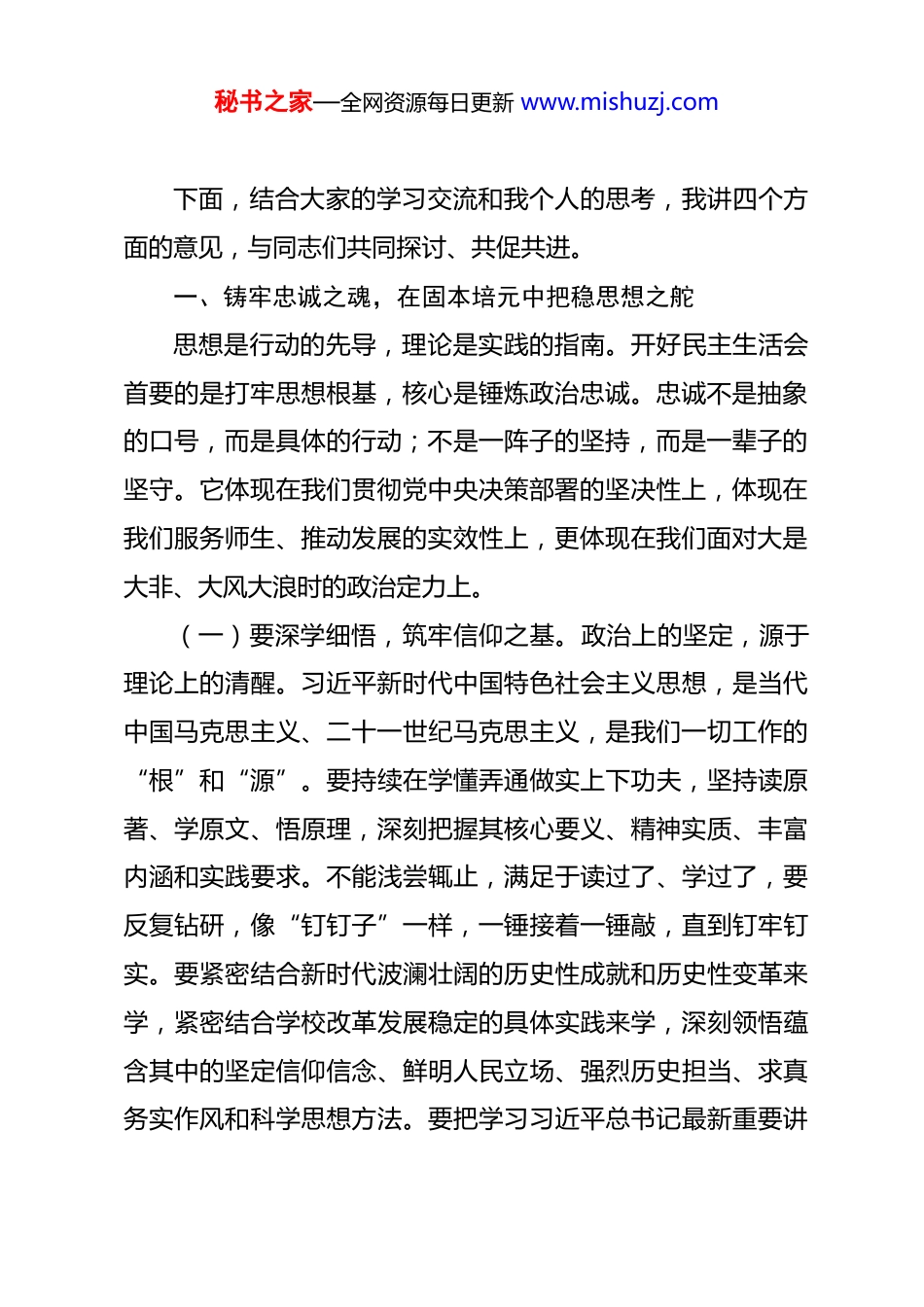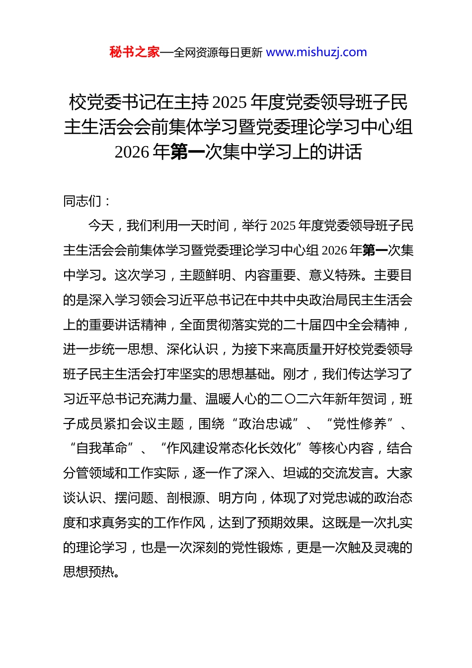 秘书之家—全网资源每日更新 www.mishuzj.com校党委书记在主持 2025 年度党委领导班子民主生活会会前集体学习暨党委理论学习中心组2026 年第一次集中学习上的讲话 同志们:今天,我们利用一天时间,举行 2025 年度党委领导班子民主生活会会前集体学习暨党委理论学习中心组 2026 年第一次集中学习。这次学习,主题鲜明、内容重要、意义特殊。主要目的是深入学习领会习近平总书记在中共中央政治局民主生活会上的重要讲话精神,全面贯彻落实党的二十届四中全会精神,进一步统一思想、深化认识,为接下来高质量开好校党委领导班子民主生活会打牢坚实的思想基础。刚才,我们传达学习了习近平总书记充满力量、温暖人心的二〇二六年新年贺词,班子成员紧扣会议主题,围绕“政治忠诚”、“党性修养”、“自我革命”、“作风建设常态化长效化”等核心内容,结合分管领域和工作实际,逐一作了深入、坦诚的交流发言。大家谈认识、摆问题、剖根源、明方向,体现了对党忠诚的政治态度和求真务实的工作作风,达到了预期效果。这既是一次扎实的理论学习,也是一次深刻的党性锻炼,更是一次触及灵魂的思想预热。秘书之家—全网资源每日更新 www.mishuzj.com下面,结合大家的学习交流和我个人的思考,我讲四个方面的意见,与同志们共同探讨、共促共进。一、铸牢忠诚之魂,在固本培元中把稳思想之舵思想是行动的先导,理论是实践的指南。开好民主生活会首要的是打牢思想根基,核心是锤炼政治忠诚。忠诚不是抽象的口号,而是具体的行动;不是一阵子的坚持,而是一辈子的坚守。它体现在我们贯彻党中央决策部署的坚决性上,体现在我们服务师生、推动发展的实效性上,更体现在我们面对大是大非、大风大浪时的政治定力上。(一)要深学细悟,筑牢信仰之基。政治上的坚定,源于理论上的清醒。习近平新时代中国特色社会主义思想,是当代中国马克思主义、二十一世纪马克思主义,是我们一切工作的“根”和“源”。要持续在学懂弄通做实上下功夫,坚持读原著、学原文、悟原理,深刻把握其核心要义、精神实质、丰富内涵和实践要求。不能浅尝辄止,满足于读过了、学过了,要反复钻研,像“钉钉子”一样,一锤接着一锤敲,直到钉牢钉实。要紧密结合新时代波澜壮阔的历史性成就和历史性变革来学,紧密结合学校改革发展稳定的具体实践来学,深刻领悟蕴含其中的坚定信仰信念、鲜明人民立场、强烈历史担当、求真务实作风和科学思想方法。要把学习习近平总书记最新重要讲秘书之家—全网资源每日更新 www.mishuzj.com话和指示批示精神作为首要政治任务,及时跟进、常学常新,确保党的创新理论入脑入心、融会贯通,真正把学习成果转化为推动学校高质量发展的强大动力和实际成效。(二)要对标看齐,把准政治方向。忠诚,最直接的体现就是向党中央看齐,向党的理论和路线方针政策看齐,向党中央决策部署看齐。要时刻关注党中央在关心什么、强调什么,深刻领会什么是党和国家最重要的利益、什么是最需要坚定维护的立场。要自觉增强“四个意识”、坚定“四个自信”、做到“两个维护”,这不能只停留在口头表态上,而要融入血脉、见诸行动。要严守党的政治纪律和政治规矩,决不允许搞“七个有之”,在重大原则问题和大是大非面前,必须立场坚定、旗帜鲜明、斗争坚决。要不断提高政治判断力、政治领悟力、政治执行力,善于从一般事务中发现政治问题,善于从苗头性、倾向性问题中把握政治端倪,确保学校各项工作始终沿着正确政治方向前进,确保党中央的各项决策部署在学校不折不扣落地生根。(三)要知行合一,践行忠诚担当。检验忠诚的试金石是行动,是担当。学习的目的全在于运用。要把对党的忠诚,落实到履职尽责、办好人民满意教育的实际行动中。当前,学校正处在实施“四两三高”战略的关键时期,任务艰巨繁重。越秘书之家—全网资源每日更新 www.mishuzj.com是这个时候,越要展现忠诚担当。要勇于挑重担子、啃硬骨头,面对学科建设瓶颈、人才培养挑战、科研创新压力,要敢于迎难而上,积极主动作为。要把忠诚体现在推动学校内涵式发展上,体现在服务云南“3815”战略和临沧重点产业链的需求上,体现在优化专业...