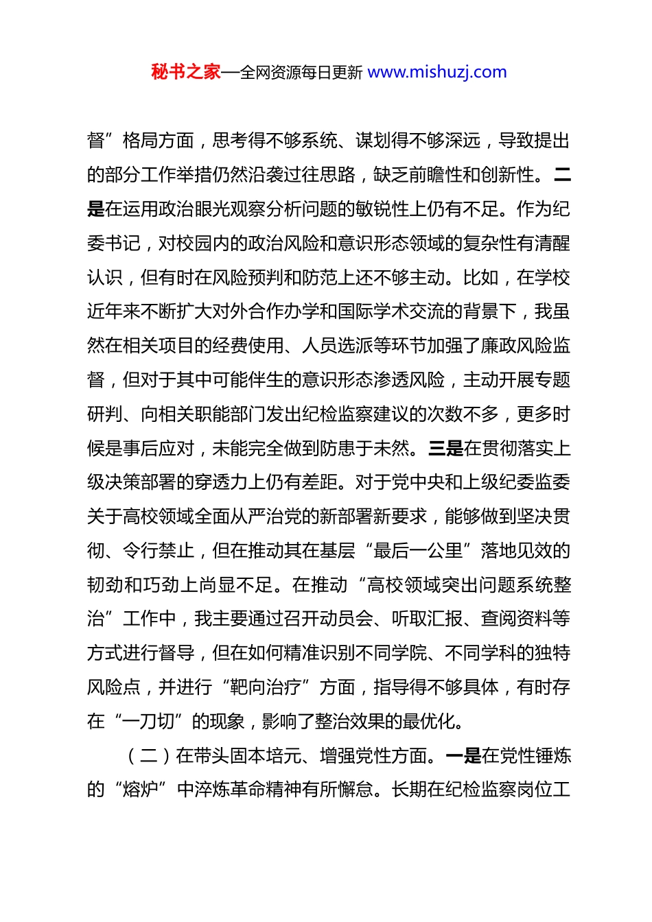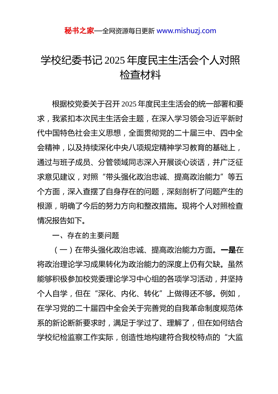 秘书之家—全网资源每日更新 www.mishuzj.com学校纪委书记 2025 年度民主生活会个人对照检查材料 根据校党委关于召开 2025 年度民主生活会的统一部署和要求,我紧扣本次民主生活会主题,在深入学习领会习近平新时代中国特色社会主义思想,全面贯彻党的二十届三中、四中全会精神,以及持续深化中央八项规定精神学习教育的基础上,通过与班子成员、分管领域同志深入开展谈心谈话,并广泛征求意见建议,对照“带头强化政治忠诚、提高政治能力”等五个方面,深入查摆了自身存在的问题,深刻剖析了问题产生的根源,明确了今后的努力方向和整改措施。现将个人对照检查情况报告如下。一、存在的主要问题(一)在带头强化政治忠诚、提高政治能力方面。一是在将政治理论学习成果转化为政治能力的深度上仍有欠缺。虽然能够积极参加校党委理论学习中心组的各项学习活动,并坚持个人自学,但在“深化、内化、转化”上做得还不够。例如,在学习党的二十届四中全会关于完善党的自我革命制度规范体系的新论断新要求时,满足于学过了、理解了,但在如何结合学校纪检监察工作实际,创造性地构建符合我校特点的“大监秘书之家—全网资源每日更新 www.mishuzj.com督”格局方面,思考得不够系统、谋划得不够深远,导致提出的部分工作举措仍然沿袭过往思路,缺乏前瞻性和创新性。二是在运用政治眼光观察分析问题的敏锐性上仍有不足。作为纪委书记,对校园内的政治风险和意识形态领域的复杂性有清醒认识,但有时在风险预判和防范上还不够主动。比如,在学校近年来不断扩大对外合作办学和国际学术交流的背景下,我虽然在相关项目的经费使用、人员选派等环节加强了廉政风险监督,但对于其中可能伴生的意识形态渗透风险,主动开展专题研判、向相关职能部门发出纪检监察建议的次数不多,更多时候是事后应对,未能完全做到防患于未然。三是在贯彻落实上级决策部署的穿透力上仍有差距。对于党中央和上级纪委监委关于高校领域全面从严治党的新部署新要求,能够做到坚决贯彻、令行禁止,但在推动其在基层“最后一公里”落地见效的韧劲和巧劲上尚显不足。在推动“高校领域突出问题系统整治”工作中,我主要通过召开动员会、听取汇报、查阅资料等方式进行督导,但在如何精准识别不同学院、不同学科的独特风险点,并进行“靶向治疗”方面,指导得不够具体,有时存在“一刀切”的现象,影响了整治效果的最优化。(二)在带头固本培元、增强党性方面。一是在党性锤炼的“熔炉”中淬炼革命精神有所懈怠。长期在纪检监察岗位工秘书之家—全网资源每日更新 www.mishuzj.com作,面对形形色色的违纪违法案件,对党风廉政建设和反腐败斗争的长期性、复杂性、艰巨性有深刻认识。但有时也因工作繁忙、事务繁杂,不自觉地将这份神圣职责当作一项按部就班的日常工作来完成,内心深处那种“永远在路上”的革命热情和斗争精神有所减退,尤其是在处理一些程序性、事务性的信访举报件时,有时会产生“例行公事”的念头,缺少了对每一次监督执纪都如履薄冰、如临深渊的敬畏之心。二是在自我修养的严格自律上存在标准不高的情况。能够时刻绷紧廉洁自律这根弦,但在运用党性原则改造主观世界上还不够彻底。比如,虽然经常组织党员干部观看警示教育片、旁听职务犯罪案件庭审但在内心深处,有时会不自觉地以“旁观者”心态看案例,用“局外人”视角评判他人,把自己摆进去、把职责摆进去进行深刻反思和灵魂拷问的自觉性不强,未能真正做到每次警示教育都是一次深刻的党性洗礼和自我净化。三是在坚守共产党人精神追求的知行合一上存在差距。能够认真学习党章党规党纪,对理想信念的重要性有充分认识。但在具体工作中,对一些“软性”的作风问题不够“较真”。例如,在参加一些工作会议时,发现有的同志发言材料空话套话较多,结合实际不紧密,虽然心里不认同,但考虑到要维护团结、不影响会议进程,大多时候没有当场予以严肃指出,实质上是对不良风气的妥协秘书之家—全网资源每日更新 www.mishuzj.com和纵容,未能将坚定的党性原则时时刻刻体现到一言一行之中。(三)在带头敬畏人民、敬畏组织、敬畏法纪方面。一是在践行新时代党...