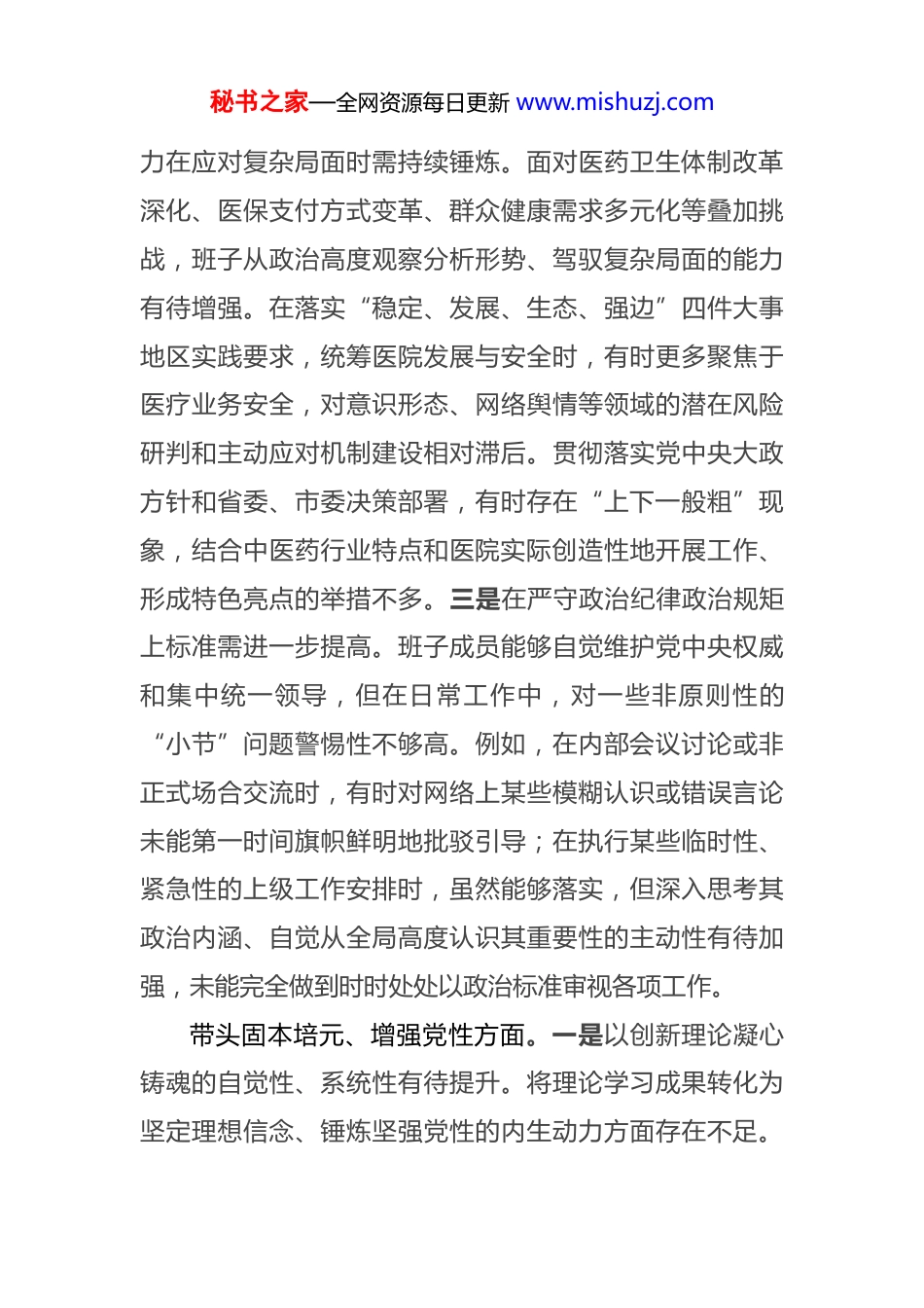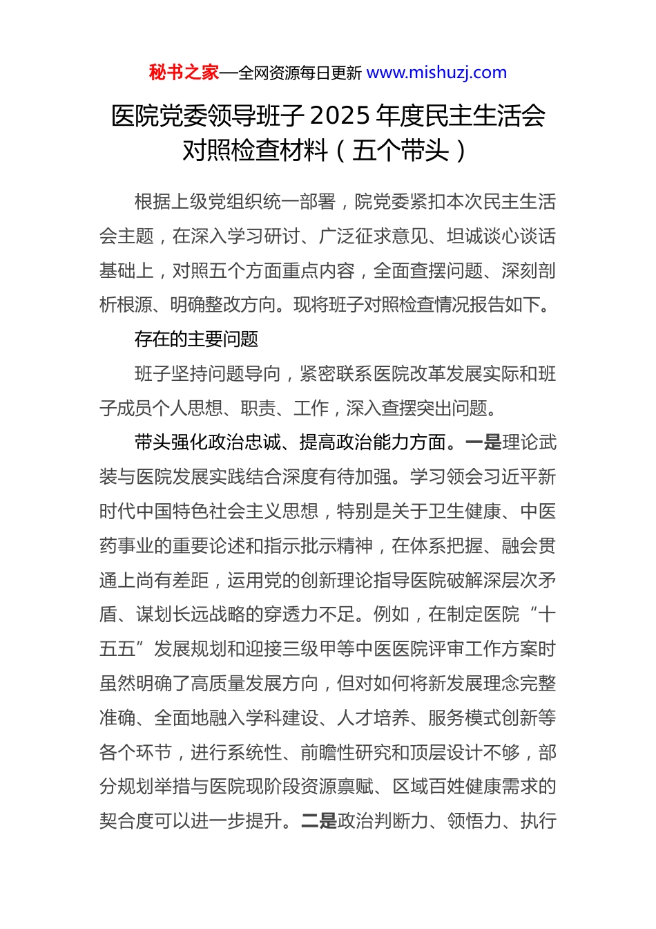 秘书之家—全网资源每日更新 www.mishuzj.com医院党委领导班子 2025 年度民主生活会对照检查材料(五个带头)根据上级党组织统一部署,院党委紧扣本次民主生活会主题,在深入学习研讨、广泛征求意见、坦诚谈心谈话基础上,对照五个方面重点内容,全面查摆问题、深刻剖析根源、明确整改方向。现将班子对照检查情况报告如下。存在的主要问题班子坚持问题导向,紧密联系医院改革发展实际和班子成员个人思想、职责、工作,深入查摆突出问题。带头强化政治忠诚、提高政治能力方面。一是理论武装与医院发展实践结合深度有待加强。学习领会习近平新时代中国特色社会主义思想,特别是关于卫生健康、中医药事业的重要论述和指示批示精神,在体系把握、融会贯通上尚有差距,运用党的创新理论指导医院破解深层次矛盾、谋划长远战略的穿透力不足。例如,在制定医院“十五五”发展规划和迎接三级甲等中医医院评审工作方案时虽然明确了高质量发展方向,但对如何将新发展理念完整准确、全面地融入学科建设、人才培养、服务模式创新等各个环节,进行系统性、前瞻性研究和顶层设计不够,部分规划举措与医院现阶段资源禀赋、区域百姓健康需求的契合度可以进一步提升。二是政治判断力、领悟力、执行秘书之家—全网资源每日更新 www.mishuzj.com力在应对复杂局面时需持续锤炼。面对医药卫生体制改革深化、医保支付方式变革、群众健康需求多元化等叠加挑战,班子从政治高度观察分析形势、驾驭复杂局面的能力有待增强。在落实“稳定、发展、生态、强边”四件大事地区实践要求,统筹医院发展与安全时,有时更多聚焦于医疗业务安全,对意识形态、网络舆情等领域的潜在风险研判和主动应对机制建设相对滞后。贯彻落实党中央大政方针和省委、市委决策部署,有时存在“上下一般粗”现象,结合中医药行业特点和医院实际创造性地开展工作、形成特色亮点的举措不多。三是在严守政治纪律政治规矩上标准需进一步提高。班子成员能够自觉维护党中央权威和集中统一领导,但在日常工作中,对一些非原则性的“小节”问题警惕性不够高。例如,在内部会议讨论或非正式场合交流时,有时对网络上某些模糊认识或错误言论未能第一时间旗帜鲜明地批驳引导;在执行某些临时性、紧急性的上级工作安排时,虽然能够落实,但深入思考其政治内涵、自觉从全局高度认识其重要性的主动性有待加强,未能完全做到时时处处以政治标准审视各项工作。带头固本培元、增强党性方面。一是以创新理论凝心铸魂的自觉性、系统性有待提升。将理论学习成果转化为坚定理想信念、锤炼坚强党性的内生动力方面存在不足。秘书之家—全网资源每日更新 www.mishuzj.com学习党章党规党纪有时停留在知晓条文,将其作为正心明道、修身律己“标尺”的敬畏感和应用能力需强化。在解决世界观、人生观、价值观这个“总开关”问题上,班子成员相互之间开展严肃的、触及灵魂的党性分析交流不够经常,运用批评与自我批评武器清洗思想灰尘、抵制错误思潮的锐度不足。面对中医药事业发展中的困难挑战,个别时候从理想信念中汲取的奋斗力量有所衰减,攻坚克难的锐气斗志需要进一步激发。二是党性修养融入日常诊疗服务和管理实践不够紧密。坚守共产党人精神追求,未能完全转化为每一位班子成员在分管领域精耕细作、追求卓越的持久行动。例如,在推动中医药传承创新工作中,虽然上线了“中医循证智医助手”等信息化工具,但在引导全院医务人员深植“大医精诚”理念、将仁心仁术贯穿于每一次诊疗、每一次沟通的全过程方面,制度化的载体和常态化的督导机制尚不完善。班子成员以普通党员身份参加所在支部组织生活,有时以工作指导代替党性锻炼,与一线医务人员进行思想交流、倾听他们真实想法的深度和频次有待增加。三是对标先进典型反躬自省、提升道德境界的主动性不足。在厚植为民情怀、纯正道德品质上,满足于遵守廉洁自律底线,但在追求“高线”、发挥道德示范引领作用上标准不高。学习焦裕禄、谷文昌等先进典型秘书之家—全网资源每日更新 www.mishuzj.com和医疗卫生战线模范人物,有时停留在感动一阵子,未能真正将其精神内化为价值追求和行动自觉。在分管领域和部门...
