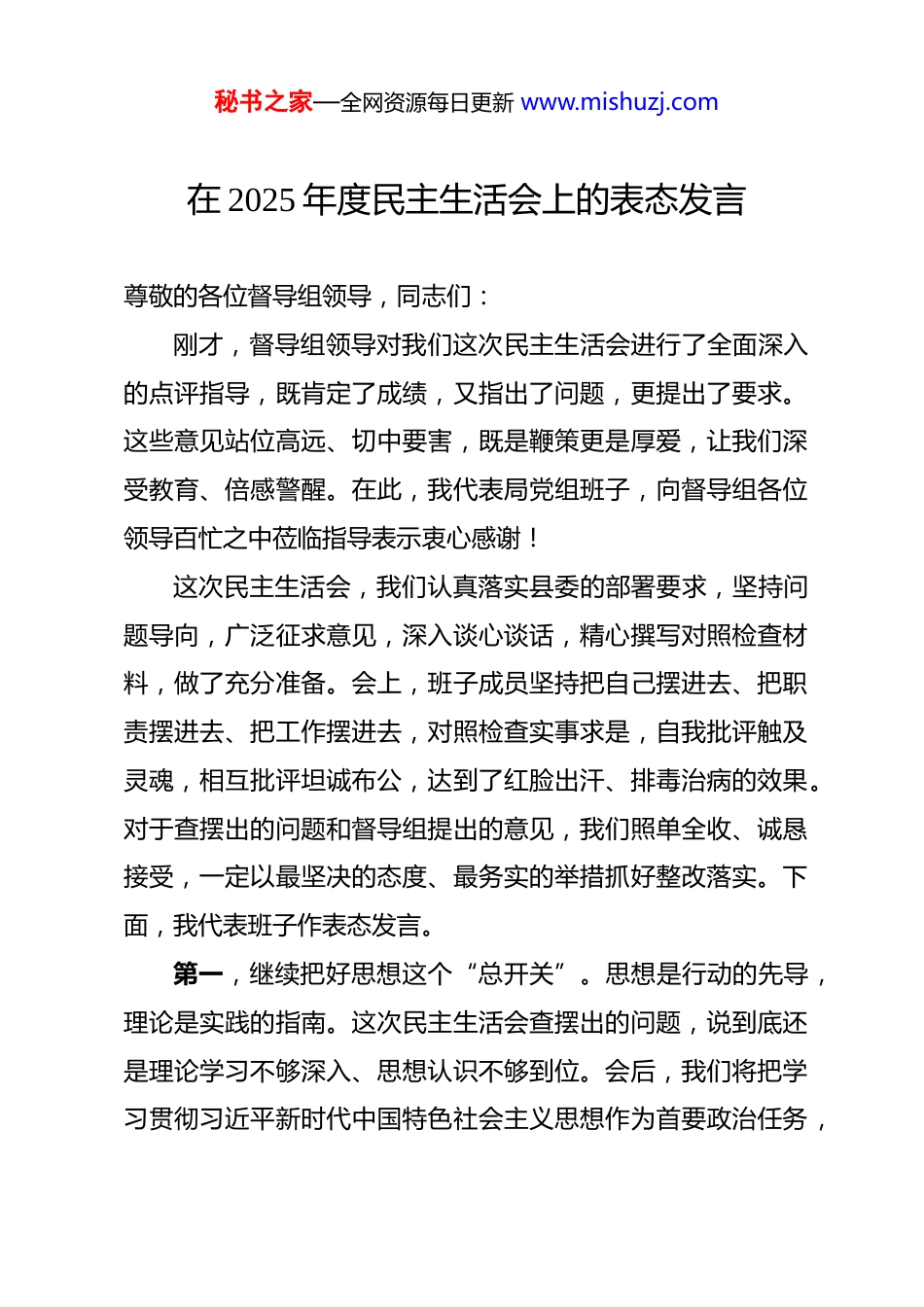 秘书之家—全网资源每日更新 www.mishuzj.com在 2025 年度民主生活会上的表态发言 尊敬的各位督导组领导,同志们:刚才,督导组领导对我们这次民主生活会进行了全面深入的点评指导,既肯定了成绩,又指出了问题,更提出了要求。这些意见站位高远、切中要害,既是鞭策更是厚爱,让我们深受教育、倍感警醒。在此,我代表局党组班子,向督导组各位领导百忙之中莅临指导表示衷心感谢!这次民主生活会,我们认真落实县委的部署要求,坚持问题导向,广泛征求意见,深入谈心谈话,精心撰写对照检查材料,做了充分准备。会上,班子成员坚持把自己摆进去、把职责摆进去、把工作摆进去,对照检查实事求是,自我批评触及灵魂,相互批评坦诚布公,达到了红脸出汗、排毒治病的效果。对于查摆出的问题和督导组提出的意见,我们照单全收、诚恳接受,一定以最坚决的态度、最务实的举措抓好整改落实。下面,我代表班子作表态发言。第一,继续把好思想这个“总开关”。思想是行动的先导,理论是实践的指南。这次民主生活会查摆出的问题,说到底还是理论学习不够深入、思想认识不够到位。会后,我们将把学习贯彻习近平新时代中国特色社会主义思想作为首要政治任务,秘书之家—全网资源每日更新 www.mishuzj.com始终坚持将政治理论学习融入日常、抓在经常,坚决落实“第一议题”制度,不断在学懂弄通做实上下功夫。班子成员要以身作则、率先垂范,带头读原著学原文悟原理,带头用党的创新理论武装头脑、指导实践、推动工作,真正做到学深悟透、融会贯通,切实把学习成效转化为坚定理想信念、加强党性修养的政治自觉,转化为推动工作、解决问题的实际本领。要完善学习制度,创新学习方式,丰富学习载体,通过集中学习、个人自学、研讨交流、专题辅导等多种形式,增强学习的针对性和实效性。要教育引导全体党员干部以学促行、知行合一,不断升华理论智慧,切实筑牢履职尽责的思想根基,以理论上的清醒保证政治上的坚定,以思想上的统一保证行动上的一致。第二,继续用好批评这把“好武器”。批评与自我批评是我们党的优良传统和政治优势,是解决党内矛盾、保持党的肌体健康的有力武器。我们要把这次民主生活会的好做法、好作风坚持下去,在日常工作中树立敢于坚持原则的勇气,保持一心为公的情怀。对自己的缺点和错误,要经常“照镜子、正衣冠”,勇于解剖自己、深挖根源,做到自我批评触及内心、不护短、不遮丑;对同志的缺点和错误,要出于公心、着眼帮助,本着对同志、对事业高度负责的态度,做到相互批评实事求是、真点问题、点真问题。班子成员之间要常打招呼、常扯袖子、秘书之家—全网资源每日更新 www.mishuzj.com常敲警钟,该提醒的及时提醒,该批评的认真批评,真正做到“洗洗澡、治治病”,不断增强班子的凝聚力和战斗力。要把开展批评与自我批评作为一项经常性工作,坚持民主生活会、组织生活会制度不动摇,营造既有集中又有民主、既有纪律又有自由、既有统一意志又有个人心情舒畅的良好政治生态。第三,着力抓好问题整改“靶向标”。开好民主生活会不是目的,解决问题才是关键。整改落实的成效,是检验民主生活会质量的重要标尺。我们将以这次民主生活会为契机,坚决杜绝纸上谈兵、坐而论道的歪风邪气,坚持问题导向、实践导向、实效导向,以“求真、求准、求实、求效”为目标,扎扎实实做好整改“后半篇文章”。会后,我们将立即梳理汇总班子和个人查摆出的问题,逐条制定整改措施,明确整改时限和责任人,建立整改台账,实行销号管理。对能够立即整改的,马上改、改到位;对需要一定时间整改的,明确时间表、路线图,限期完成;对需要长期坚持的,建立健全制度机制,形成常态长效。要坚持领导带头、以上率下,班子成员对分管领域的问题整改要亲自研究、亲自部署、亲自督办,形成一级抓一级、层层抓落实的工作格局。我们将定期对整改情况进行“回头看”,对整改不力、敷衍塞责的严肃追责问责,确保查摆出的问题件件有着落、事事有回音,以整改的实际成效取信于民、秘书之家—全网资源每日更新 www.mishuzj.com取信于组织。第四,始终扛牢管党治党政治责任。全面从严治党永远在路上。...