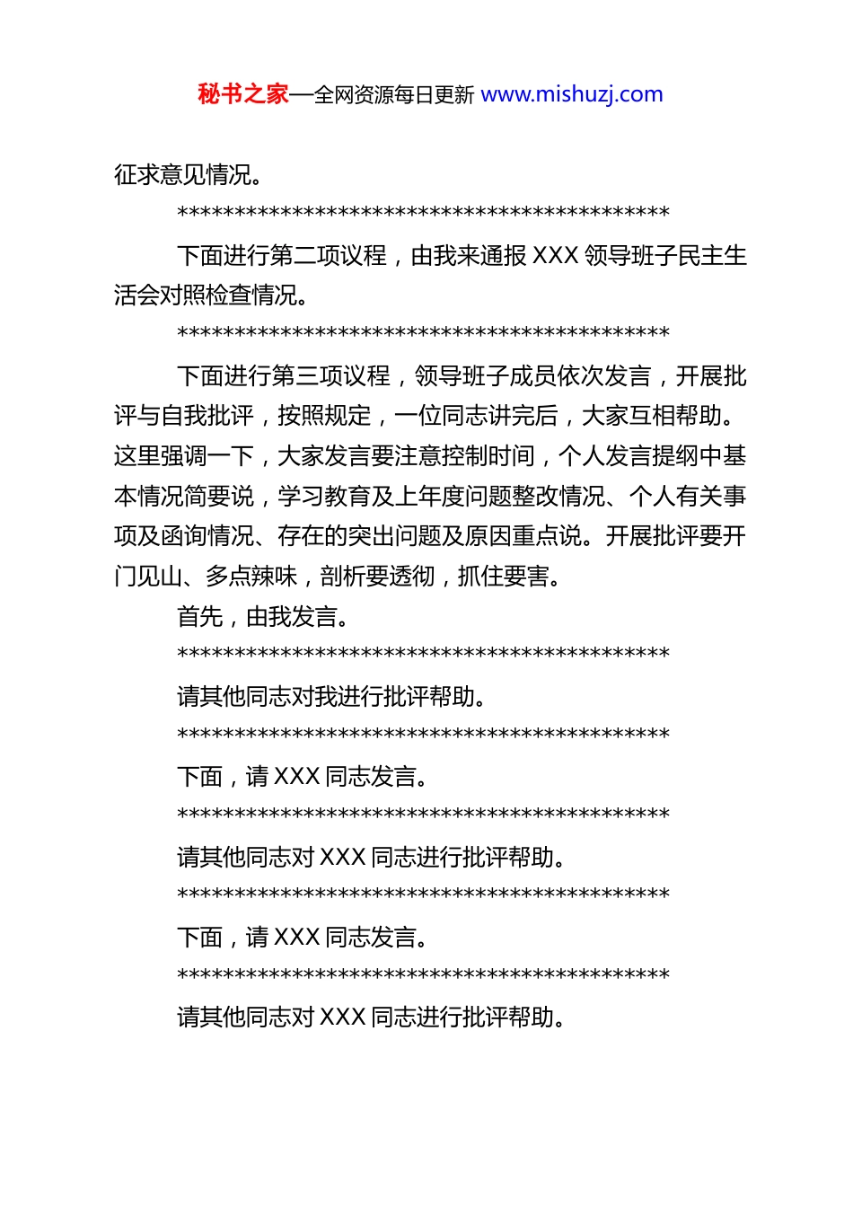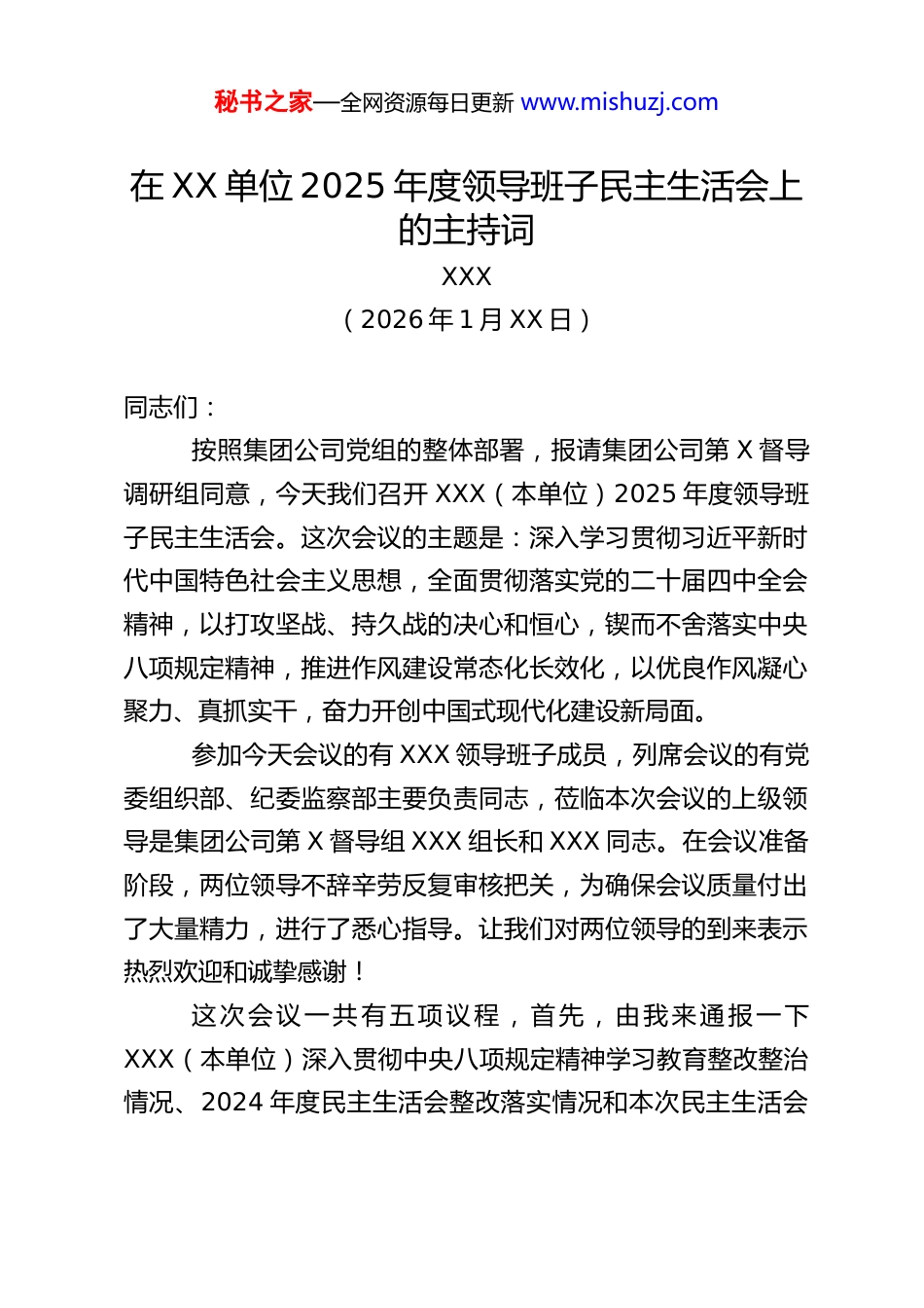 秘书之家—全网资源每日更新 www.mishuzj.com在 XX 单位 2025 年度领导班子民主生活会上的主持词XXX(2026 年 1 月 XX 日)同志们:按照集团公司党组的整体部署,报请集团公司第 X 督导调研组同意,今天我们召开 XXX(本单位)2025 年度领导班子民主生活会。这次会议的主题是:深入学习贯彻习近平新时代中国特色社会主义思想,全面贯彻落实党的二十届四中全会精神,以打攻坚战、持久战的决心和恒心,锲而不舍落实中央八项规定精神,推进作风建设常态化长效化,以优良作风凝心聚力、真抓实干,奋力开创中国式现代化建设新局面。参加今天会议的有 XXX 领导班子成员,列席会议的有党委组织部、纪委监察部主要负责同志,莅临本次会议的上级领导是集团公司第 X 督导组 XXX 组长和 XXX 同志。在会议准备阶段,两位领导不辞辛劳反复审核把关,为确保会议质量付出了大量精力,进行了悉心指导。让我们对两位领导的到来表示热烈欢迎和诚挚感谢!这次会议一共有五项议程,首先,由我来通报一下XXX(本单位)深入贯彻中央八项规定精神学习教育整改整治情况、2024 年度民主生活会整改落实情况和本次民主生活会秘书之家—全网资源每日更新 www.mishuzj.com征求意见情况。*******************************************下面进行第二项议程,由我来通报 XXX 领导班子民主生活会对照检查情况。*******************************************下面进行第三项议程,领导班子成员依次发言,开展批评与自我批评,按照规定,一位同志讲完后,大家互相帮助。这里强调一下,大家发言要注意控制时间,个人发言提纲中基本情况简要说,学习教育及上年度问题整改情况、个人有关事项及函询情况、存在的突出问题及原因重点说。开展批评要开门见山、多点辣味,剖析要透彻,抓住要害。首先,由我发言。 *******************************************请其他同志对我进行批评帮助。*******************************************下面,请 XXX 同志发言。*******************************************请其他同志对 XXX 同志进行批评帮助。*******************************************下面,请 XXX 同志发言。*******************************************请其他同志对 XXX 同志进行批评帮助。秘书之家—全网资源每日更新 www.mishuzj.com*******************************************下面,请 XXX 同志发言。*******************************************请其他同志对 XXX 同志进行批评帮助。*******************************************下面,请 XXX 同志发言。*******************************************请其他同志对 XXX 同志进行批评帮助。*******************************************下面,请 XXX 同志发言。*******************************************请其他同志对 XXX 同志进行批评帮助。*******************************************下面,请 XXX 同志发言。*******************************************请其他同志对 XXX 同志进行批评帮助。*******************************************下面,请 XXX 同志发言。*******************************************请其他同志对 XXX 同志进行批评帮助。*******************************************领导班子成员的发言以及大家相互批评到此结束。下面,秘书之家—全网资源每日更新 www.mishuzj.com让我们欢迎集团公司第 X 督导组组长 XXX 同志做点评。*******************************************同志们,经过认真准备,今天我们召开了 XXX(本单位)2025 年度领导班子民主生活会。大家按照会议的主题和要求,主动联系思想和工作实际,重点从“五个带头”方面深入查摆问题,开展批评与自我批评,整个过程中,大家开门见山、敞开心扉、揭短亮丑、直挖根源。总体来说,会议开得比较成功,起到了团结民主、统一思想、凝心聚力和推进发展的作用。刚才,督导组 XXX 同志对我们的会议给予了充分肯定和评价,提出了四点建议。这次会议之所以能够达到预期效果,离不开督导组的指导,请大家再次用掌声...