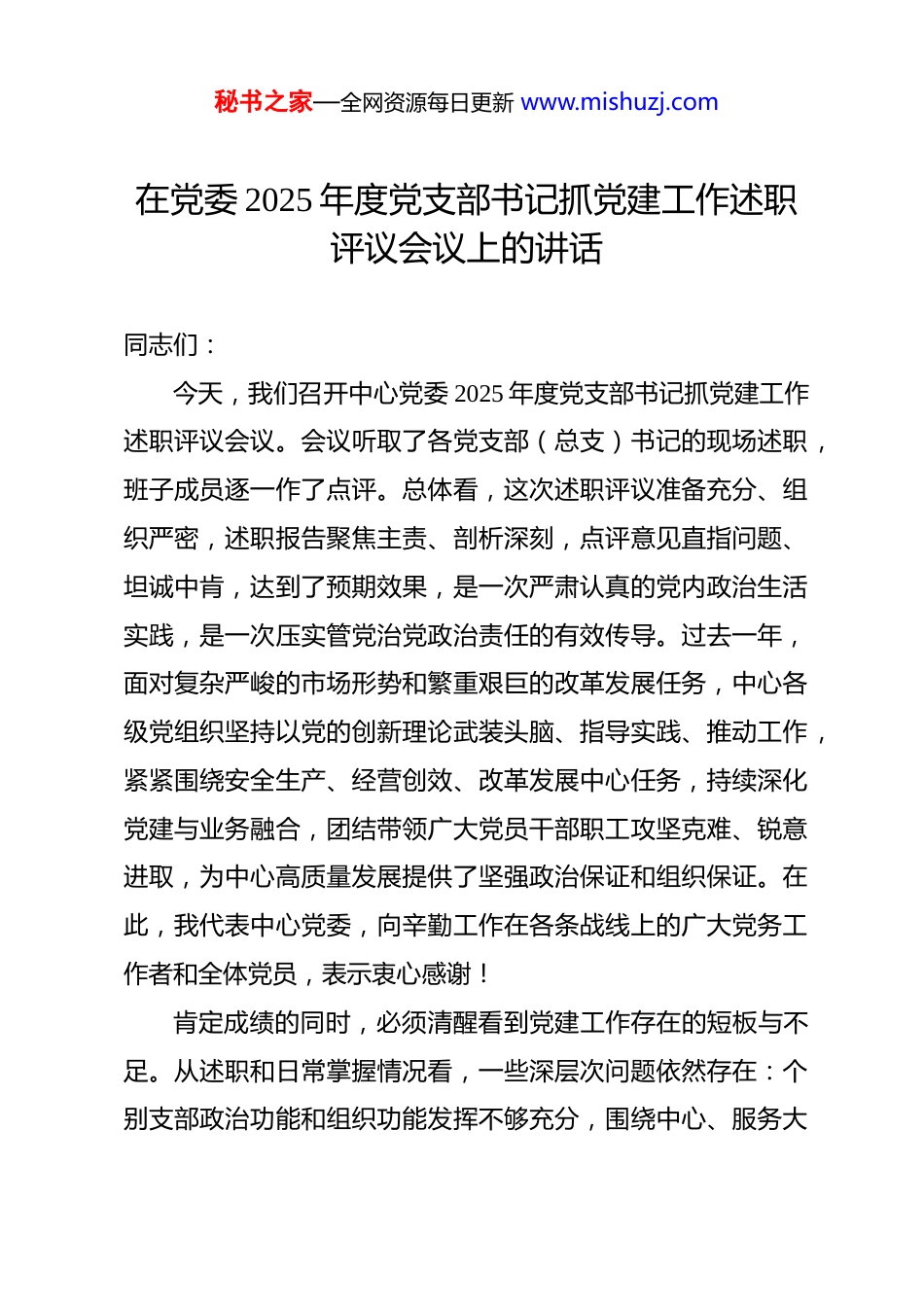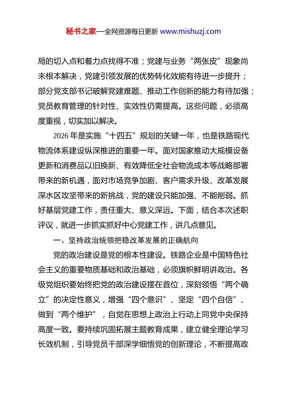 秘书之家—全网资源每日更新 www.mishuzj.com在党委 2025 年度党支部书记抓党建工作述职评议会议上的讲话 同志们:今天,我们召开中心党委 2025 年度党支部书记抓党建工作述职评议会议。会议听取了各党支部(总支)书记的现场述职,班子成员逐一作了点评。总体看,这次述职评议准备充分、组织严密,述职报告聚焦主责、剖析深刻,点评意见直指问题、坦诚中肯,达到了预期效果,是一次严肃认真的党内政治生活实践,是一次压实管党治党政治责任的有效传导。过去一年,面对复杂严峻的市场形势和繁重艰巨的改革发展任务,中心各级党组织坚持以党的创新理论武装头脑、指导实践、推动工作,紧紧围绕安全生产、经营创效、改革发展中心任务,持续深化党建与业务融合,团结带领广大党员干部职工攻坚克难、锐意进取,为中心高质量发展提供了坚强政治保证和组织保证。在此,我代表中心党委,向辛勤工作在各条战线上的广大党务工作者和全体党员,表示衷心感谢!肯定成绩的同时,必须清醒看到党建工作存在的短板与不足。从述职和日常掌握情况看,一些深层次问题依然存在:个别支部政治功能和组织功能发挥不够充分,围绕中心、服务大秘书之家—全网资源每日更新 www.mishuzj.com局的切入点和着力点找得不准;党建与业务“两张皮”现象尚未根本解决,党建引领发展的优势转化效能有待进一步提升;部分党支部书记破解党建难题、推动工作创新的能力有待加强;党员教育管理的针对性、实效性仍需提高。这些问题,必须高度重视,切实加以解决。2026 年是实施“十四五”规划的关键一年,也是铁路现代物流体系建设纵深推进的重要一年。面对国家推动大规模设备更新和消费品以旧换新、有效降低全社会物流成本等战略部署带来的新机遇,面对市场竞争加剧、客户需求升级、改革发展深水区攻坚带来的新挑战,党的建设只能加强、不能削弱。抓好基层党建工作,责任重大、意义深远。下面,结合本次述职评议,就进一步抓实抓好中心党建工作,讲几点意见。一、坚持政治统领把稳改革发展的正确航向党的政治建设是党的根本性建设。铁路企业是中国特色社会主义的重要物质基础和政治基础,必须旗帜鲜明讲政治。各级党组织要始终把党的政治建设摆在首位,深刻领悟“两个确立”的决定性意义,增强“四个意识”、坚定“四个自信”、做到“两个维护”,自觉在思想上政治上行动上同党中央保持高度一致。要持续巩固拓展主题教育成果,建立健全理论学习长效机制,引导党员干部深学细悟党的创新理论,不断提高政秘书之家—全网资源每日更新 www.mishuzj.com治判断力、政治领悟力、政治执行力。要严明党的政治纪律和政治规矩,不折不扣贯彻落实国铁集团党组、集团公司党委的各项决策部署,确保中心各项工作始终沿着正确方向前进。要严格落实意识形态工作责任制,密切关注干部职工思想动态,加强正面宣传引导,有效防范化解风险,凝聚起团结奋斗、共谋发展的强大合力。当前,要特别将党建工作与贯彻落实中央经济工作会议精神、服务国家重大战略紧密结合起来,确保党的路线方针政策在物流中心落地生根。二、压实主体责任锻造坚强有力的战斗堡垒党支部书记是基层党建工作的“第一责任人”。抓好党建是本职、不抓党建是失职、抓不好党建是不称职。这次述职评议,“辣味”较足,根本目的就是倒逼责任落实。各位书记要切实把抓党建的责任扛在肩上、抓在手上。要带头履行好“一岗双责”,既要抓好生产经营,也要抓好分管领域的党建工作,推动党建责任层层传递、全面覆盖。要着力建强支部班子,发挥好“头雁效应”,严格执行民主集中制,提升议事决策的科学化、规范化水平,把支委会建设成为团结群众的核心、教育党员的学校、攻坚克难的堡垒。要牢固树立大抓基层的鲜明导向,持续推进基层党组织“强基提质”工程。要深入落实《中国共产党支部工作条例(试行)》,扎实推进党支部标准化规秘书之家—全网资源每日更新 www.mishuzj.com范化建设,不断提升党支部的政治功能和组织力。要坚决反对形式主义、官僚主义,把工作重心放在解决实际问题上,经常性深入偏远岗点、作业现场开展调查研究,用心用情用力解决职工群众急难愁盼问题,以...
