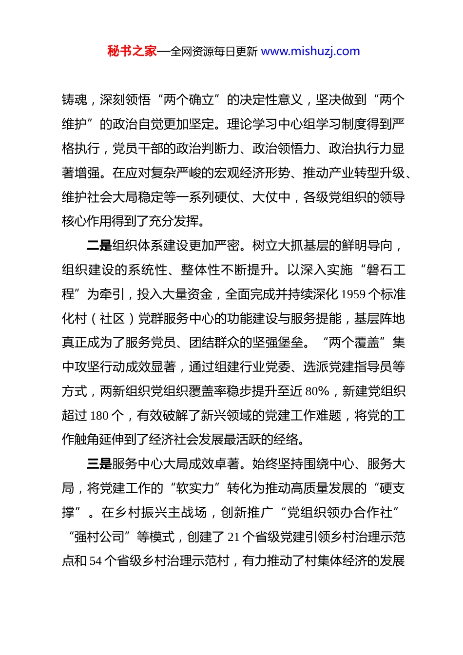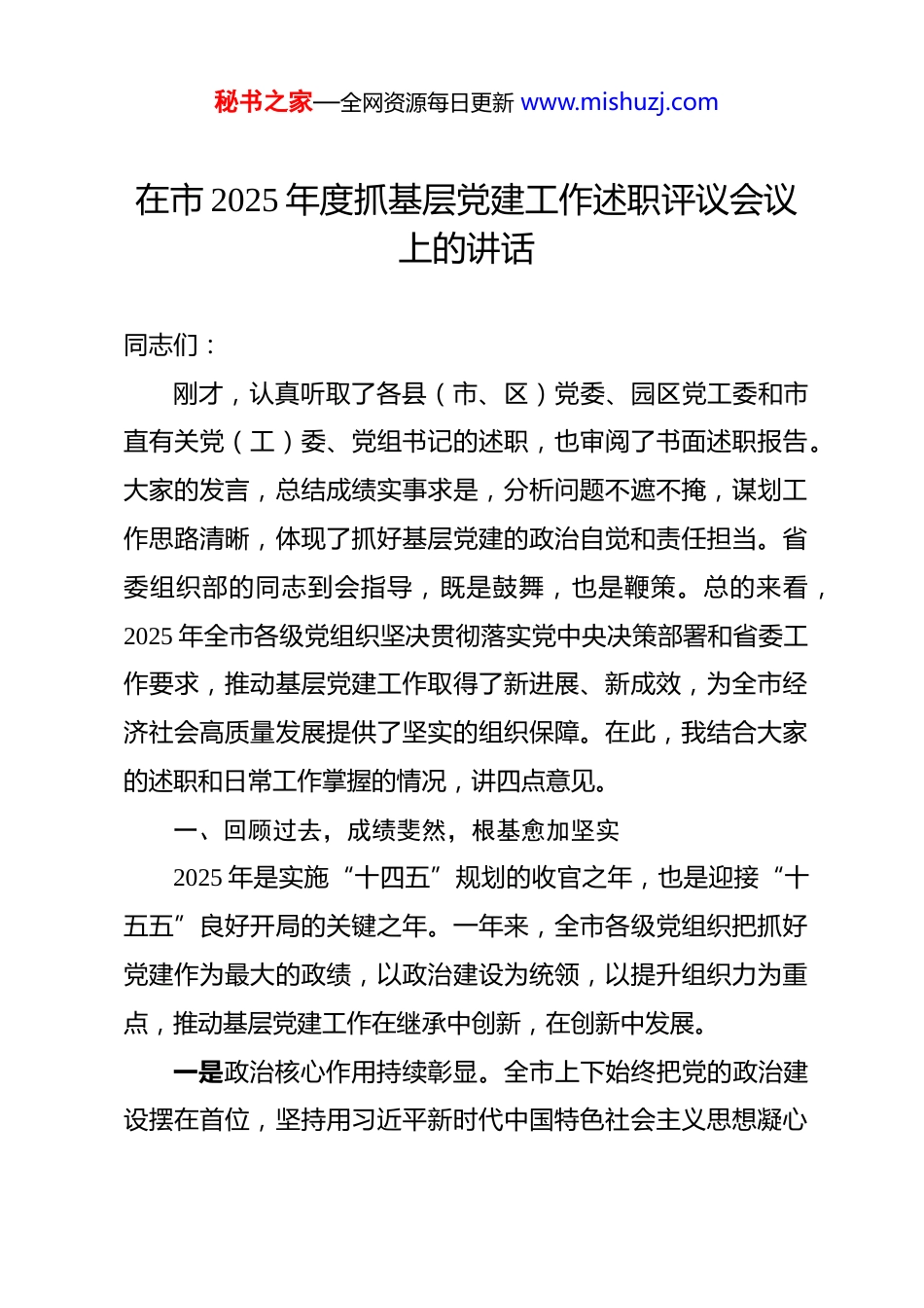 秘书之家—全网资源每日更新 www.mishuzj.com在市 2025 年度抓基层党建工作述职评议会议上的讲话 同志们:刚才,认真听取了各县(市、区)党委、园区党工委和市直有关党(工)委、党组书记的述职,也审阅了书面述职报告。大家的发言,总结成绩实事求是,分析问题不遮不掩,谋划工作思路清晰,体现了抓好基层党建的政治自觉和责任担当。省委组织部的同志到会指导,既是鼓舞,也是鞭策。总的来看,2025 年全市各级党组织坚决贯彻落实党中央决策部署和省委工作要求,推动基层党建工作取得了新进展、新成效,为全市经济社会高质量发展提供了坚实的组织保障。在此,我结合大家的述职和日常工作掌握的情况,讲四点意见。一、回顾过去,成绩斐然,根基愈加坚实2025 年是实施“十四五”规划的收官之年,也是迎接“十五五”良好开局的关键之年。一年来,全市各级党组织把抓好党建作为最大的政绩,以政治建设为统领,以提升组织力为重点,推动基层党建工作在继承中创新,在创新中发展。一是政治核心作用持续彰显。全市上下始终把党的政治建设摆在首位,坚持用习近平新时代中国特色社会主义思想凝心秘书之家—全网资源每日更新 www.mishuzj.com铸魂,深刻领悟“两个确立”的决定性意义,坚决做到“两个维护”的政治自觉更加坚定。理论学习中心组学习制度得到严格执行,党员干部的政治判断力、政治领悟力、政治执行力显著增强。在应对复杂严峻的宏观经济形势、推动产业转型升级、维护社会大局稳定等一系列硬仗、大仗中,各级党组织的领导核心作用得到了充分发挥。二是组织体系建设更加严密。树立大抓基层的鲜明导向,组织建设的系统性、整体性不断提升。以深入实施“磐石工程”为牵引,投入大量资金,全面完成并持续深化 1959 个标准化村(社区)党群服务中心的功能建设与服务提能,基层阵地真正成为了服务党员、团结群众的坚强堡垒。“两个覆盖”集中攻坚行动成效显著,通过组建行业党委、选派党建指导员等方式,两新组织党组织覆盖率稳步提升至近 80%,新建党组织超过 180 个,有效破解了新兴领域的党建工作难题,将党的工作触角延伸到了经济社会发展最活跃的经络。三是服务中心大局成效卓著。始终坚持围绕中心、服务大局,将党建工作的“软实力”转化为推动高质量发展的“硬支撑”。在乡村振兴主战场,创新推广“党组织领办合作社”“强村公司”等模式,创建了 21 个省级党建引领乡村治理示范点和 54 个省级乡村治理示范村,有力推动了村集体经济的发展秘书之家—全网资源每日更新 www.mishuzj.com壮大,部分村集体经济经营性收入突破 100 万元,农民人均可支配收入实现 7.8%的稳健增长,党建引领的振兴之路越走越宽广。在产业发展第一线,深入开展“党建兴企”“小平故里红”等特色行动,党员带头技术攻关、开拓市场,党组织的战斗堡垒作用和党员的先锋模范作用在项目建设、招商引资、科技创新中得到了充分体现。四是干部队伍建设充满活力。坚持党管干部原则和新时代好干部标准,干部队伍的结构和能力素质得到系统性优化。突出实干实绩的选人用人导向,一批想干事、能干事、干成事的干部走上了重要岗位。大规模、多层次的干部教育培训体系不断完善,广大干部的专业精神和履职能力得到有效提升。党员队伍的先进性和纯洁性建设持续加强,发展党员的质量不断提高,党员教育管理更加严格规范,先锋形象在各自岗位上熠熠生辉。这些成绩的取得,是党中央和省委坚强领导的结果,是全市各级党组织和广大党员干部群众团结奋斗、顽强拼搏的结果。在肯定成绩的同时,也必须清醒地认识到工作中存在的短板和不足。二、正视问题,短板尚存,务必精准发力从刚才的述职和日常调研来看,一些深层次、结构性的问秘书之家—全网资源每日更新 www.mishuzj.com题仍然存在,必须高度重视,采取有力措施加以解决。一是党建工作发展不平衡不充分的问题依然存在。一些领域、一些单位对党建工作的重视程度依然是“上热下冷”“内热外冷”,存在层层递减的现象。机关党建“灯下黑”、国企党建与生产经营“两张皮”、两新组织党建基础薄弱等问题,在部分单位还不同程度地存在。基层党组织标准化规...