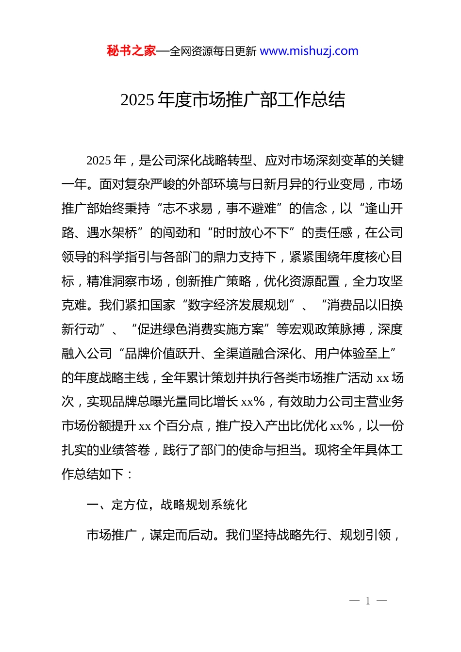 秘书之家—全网资源每日更新 www.mishuzj.com2025 年度市场推广部工作总结2025 年,是公司深化战略转型、应对市场深刻变革的关键一年。面对复杂严峻的外部环境与日新月异的行业变局,市场推广部始终秉持“志不求易,事不避难”的信念,以“逢山开路、遇水架桥”的闯劲和“时时放心不下”的责任感,在公司领导的科学指引与各部门的鼎力支持下,紧紧围绕年度核心目标,精准洞察市场,创新推广策略,优化资源配置,全力攻坚克难。我们紧扣国家“数字经济发展规划”、“消费品以旧换新行动”、“促进绿色消费实施方案”等宏观政策脉搏,深度融入公司“品牌价值跃升、全渠道融合深化、用户体验至上”的年度战略主线,全年累计策划并执行各类市场推广活动 xx 场次,实现品牌总曝光量同比增长 xx%,有效助力公司主营业务市场份额提升 xx 个百分点,推广投入产出比优化 xx%,以一份扎实的业绩答卷,践行了部门的使命与担当。现将全年具体工作总结如下:一、定方位,战略规划系统化市场推广,谋定而后动。我们坚持战略先行、规划引领,— 1 —秘书之家—全网资源每日更新 www.mishuzj.com确保全年工作方向明、路径清、举措实,在不确定性中寻找确定性,于变局中开新局。(一)政策与市场双轮驱动,战略解码清晰化。一是深化政策研究,把握发展东风。组织部门骨干成立专项研究小组,系统梳理解读年度国家及地方层面关于数字经济、消费促进、绿色发展、乡村振兴等相关政策文件 xx 份,形成《2025 年度政策机遇与市场推广应对策略》专项报告。明确将“借力数字基建普及深化线上渗透”、“抓住以旧换新政策窗口抢占换新市场”、“顺应绿色消费趋势打造品牌环保形象”作为年度三大战略抓手,确保推广工作与国家导向同频共振。二是精研市场动态,洞察竞争格局。建立“月度市场动态分析-季度竞品深度复盘”机制,通过大数据监测、第三方报告购买、神秘顾客调查、核心消费者深度访谈等多种方式,覆盖 xx 个重点城市市场,收集分析竞品动态信息 xx 余条,用户画像数据 xx 组。精准识别出当前市场“高端细分领域品牌护城河待加固”、“下沉市场品牌认知存在空白”、“新兴媒介渠道流量红利争夺白热化”等核心挑战与机遇。三是细化目标路径,确保落地执行。依据公司整体战略与上述研判,牵头制定《市场推广部 2025 年度作战地图》,将抽象的“品牌升级”、“增长拓展”目标,— 2 —秘书之家—全网资源每日更新 www.mishuzj.com分解为“高端产品线声量份额提升至 xx%”、“下沉市场渠道触点新增 xx 个”、“新媒体矩阵粉丝总量增长 xx%”、“品效合一项目占比超 xx%”等 xx 项可量化、可考核的关键绩效指标(kpi),并对应制定 xx 项核心推广任务清单,责任到人,时间到点,形成从战略到执行的完整闭环。(二)区域与客群精准施策,破局路径差异化。一是实施区域差异化攻坚。针对一线及新一线城市市场,制定“品牌高度塑造与体验深化”策略,聚焦高端商圈、地标场馆、精英社群,全年举办“品牌美学沙龙”、“核心技术品鉴会”等高端活动 xx 场,联合顶级设计院校、艺术机构进行跨界合作 xx 次,显著提升品牌在核心城市的高端形象与口碑。针对三四线及县域下沉市场,推行“渠道下沉与口碑裂变”策略,通过“本地化达人合作”、“社区团购领袖培育”、“县域零售终端形象升级”等项目,全年新增有效下沉市场触点 xx 个,举办区域性惠民推广活动 xx 场,初步构建起下沉市场传播网络。二是深化客群精细化运营。针对 z 世代及年轻家庭客群,全力拥抱短视频、直播、兴趣社群等新媒体形态,打造虚拟偶像“x 推官”,发起“#我的 xx 新生活#”短视频挑战赛,播放量超 xx 亿,与头部及中腰部达人合作内容 xx 条,显著提升品牌在年轻人群中— 3 —秘书之家—全网资源每日更新 www.mishuzj.com的喜爱度与话题度。针对品质升级型中产客群,侧重内容营销与场景化体验,推出《匠心之旅》系列纪录片、发布《年度消费趋势白皮书》,打造“智慧生活家”、“绿色健康周”等沉浸式体验活动,强化品牌专业、可靠、有温度的认知。针对存量老用户,设计“以旧换新专属...
