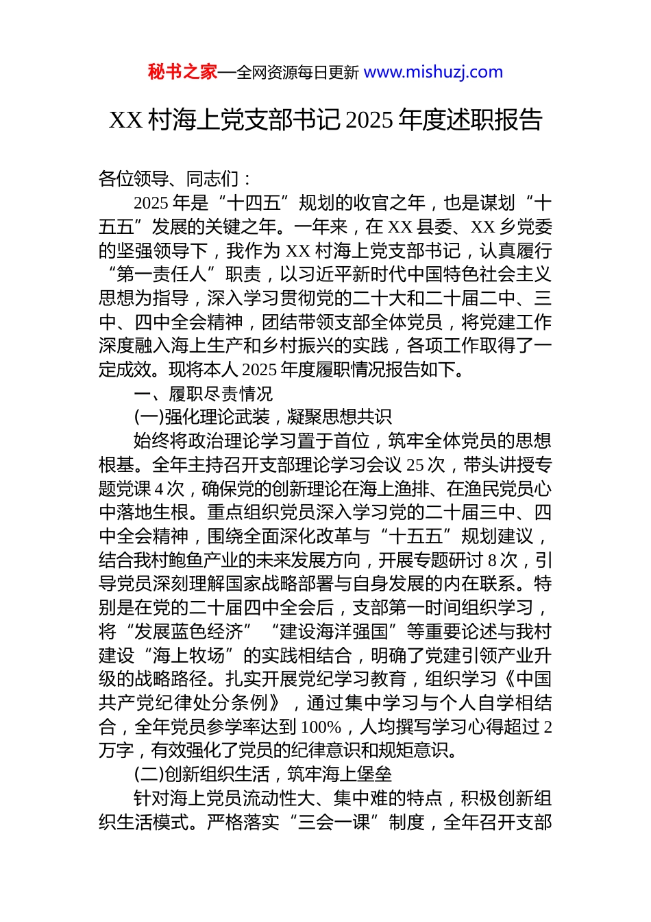 秘书之家—全网资源每日更新 www.mishuzj.comXX 村海上党支部书记 2025 年度述职报告各位领导、同志们:2025 年是“十四五”规划的收官之年,也是谋划“十五五”发展的关键之年。一年来,在 XX 县委、XX 乡党委的坚强领导下,我作为 XX 村海上党支部书记,认真履行“第一责任人”职责,以习近平新时代中国特色社会主义思想为指导,深入学习贯彻党的二十大和二十届二中、三中、四中全会精神,团结带领支部全体党员,将党建工作深度融入海上生产和乡村振兴的实践,各项工作取得了一定成效。现将本人 2025 年度履职情况报告如下。一、履职尽责情况(一)强化理论武装,凝聚思想共识始终将政治理论学习置于首位,筑牢全体党员的思想根基。全年主持召开支部理论学习会议 25 次,带头讲授专题党课 4 次,确保党的创新理论在海上渔排、在渔民党员心中落地生根。重点组织党员深入学习党的二十届三中、四中全会精神,围绕全面深化改革与“十五五”规划建议,结合我村鲍鱼产业的未来发展方向,开展专题研讨 8 次,引导党员深刻理解国家战略部署与自身发展的内在联系。特别是在党的二十届四中全会后,支部第一时间组织学习,将“发展蓝色经济”“建设海洋强国”等重要论述与我村建设“海上牧场”的实践相结合,明确了党建引领产业升级的战略路径。扎实开展党纪学习教育,组织学习《中国共产党纪律处分条例》,通过集中学习与个人自学相结合,全年党员参学率达到 100%,人均撰写学习心得超过 2万字,有效强化了党员的纪律意识和规矩意识。(二)创新组织生活,筑牢海上堡垒针对海上党员流动性大、集中难的特点,积极创新组织生活模式。严格落实“三会一课”制度,全年召开支部秘书之家—全网资源每日更新 www.mishuzj.com党员大会 12 次、支委会 24 次、党小组会 48 次。在此基础上,充分利用现代通讯技术,创建“云上党支部”,通过视频会议、微信群直播等方式,将组织生活从陆地延伸至海上作业平台,实现了海上与岸上党员学习的同频共振。精心设计“海上主题党日”,全年开展特色活动 12 次,内容涵盖“甲板上的党课”、海上安全生产应急演练、休渔期政策宣讲等,将党日活动与生产实际紧密结合,主题党日出勤率保持在 98%以上。严肃开展组织生活会和民主评议党员工作,会上党员同志开诚布公,累计查摆问题 16条,均已制定措施并整改到位。通过民主评议,评选出优秀党员 5 名,对 1 名基本合格党员进行了结对帮教,增强了党内政治生活的政治性、时代性和原则性。(三)聚焦队伍建设,激活先锋动能坚持标准,严格程序,着力建设一支高素质的海上党员队伍。全年共确定入党积极分子 6 名,发展预备党员 4名,其中 3 名是平均年龄在 35 岁以下、懂技术、善经营的青年养殖能手,为支部注入了新鲜血液。持续深化“四强”党支部创建,在海上渔排设立“党员责任区”8 个、“党员示范岗”5 个,引导党员在鲍鱼育种、病害防治、安全生产等关键环节亮身份、作表令,发挥模范带头作用。依托“海上党校”同心村教学点,每月定期开展培训,邀请县海洋与渔业局专家、乡土人才授课,内容涵盖党性教育、养殖新技术、电商营销知识等,全年培训党员及养殖户超过 300 人次。落实党内关怀帮扶机制,全年走访慰问困难党员、老党员 12 人次,发放慰问金 XX 万元,切实增强了党员的归属感和组织的凝聚力。(四)坚持党建引领,赋能产业发展始终坚持党建工作与中心工作同谋划、同部署、同推进,以高质量党建引领鲍鱼产业高质量发展。支部牵头成立了 3 个党员技术攻关小组,聚焦鲍鱼良种选育和深远海养殖模式探索。在支部的引导和党员的带头下,我村部分养秘书之家—全网资源每日更新 www.mishuzj.com殖户开始试点应用智能化水质监测系统,初步数据显示,采用该技术的养殖网箱,鲍鱼生长速度提升约 15%,成活率提高 10%,有效带动了产业的数字化转型。2025 年,全村鲍鱼产量达到 2450 吨,产值超过 XX 亿元,村民人均年收入突破 XX 万元,村集体经济收入达到 XX 万元,各项数据再创新高。支部积极发挥桥梁纽带作用,主动对接金融机构,协助养殖户申请“鲍鱼产业...