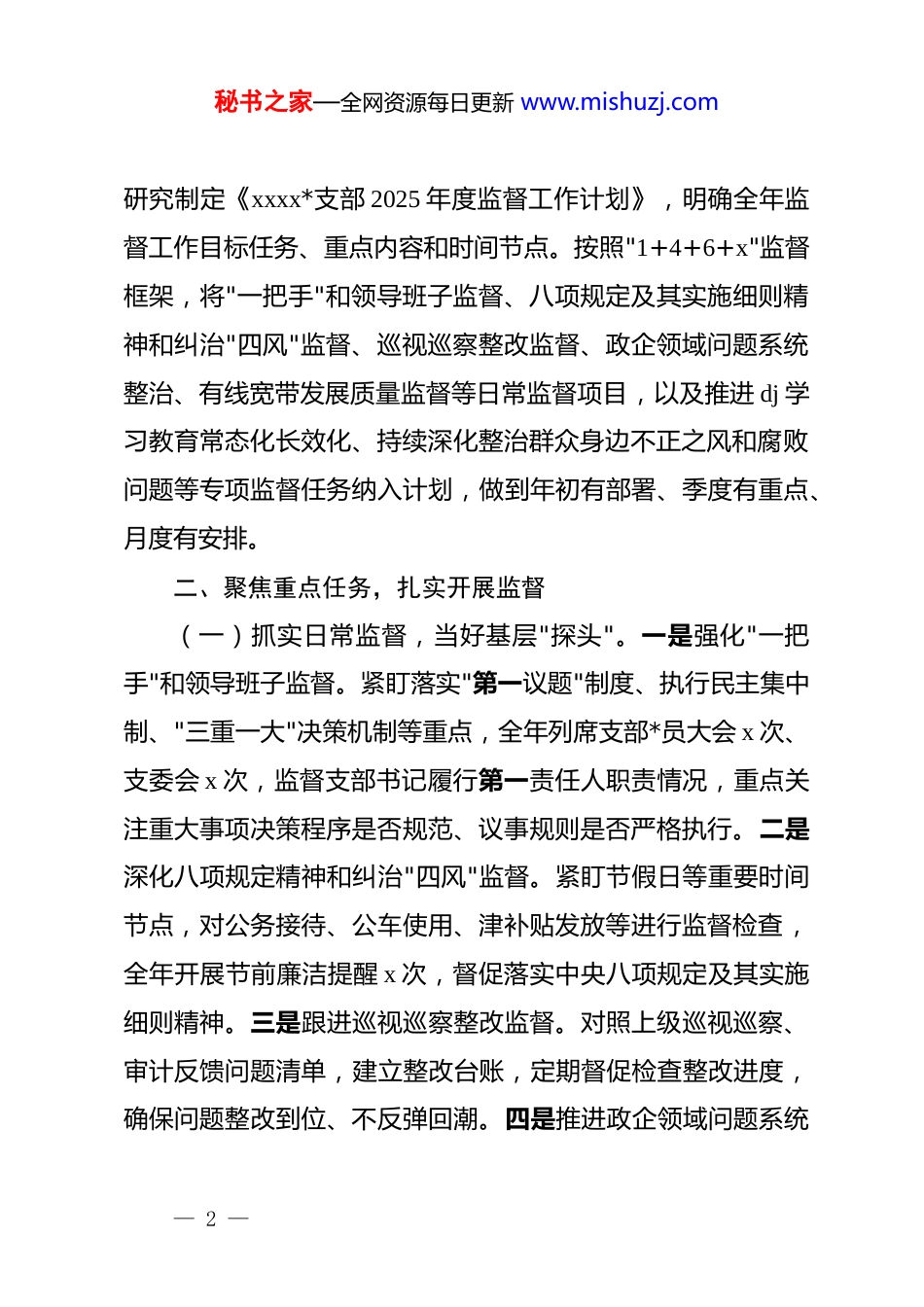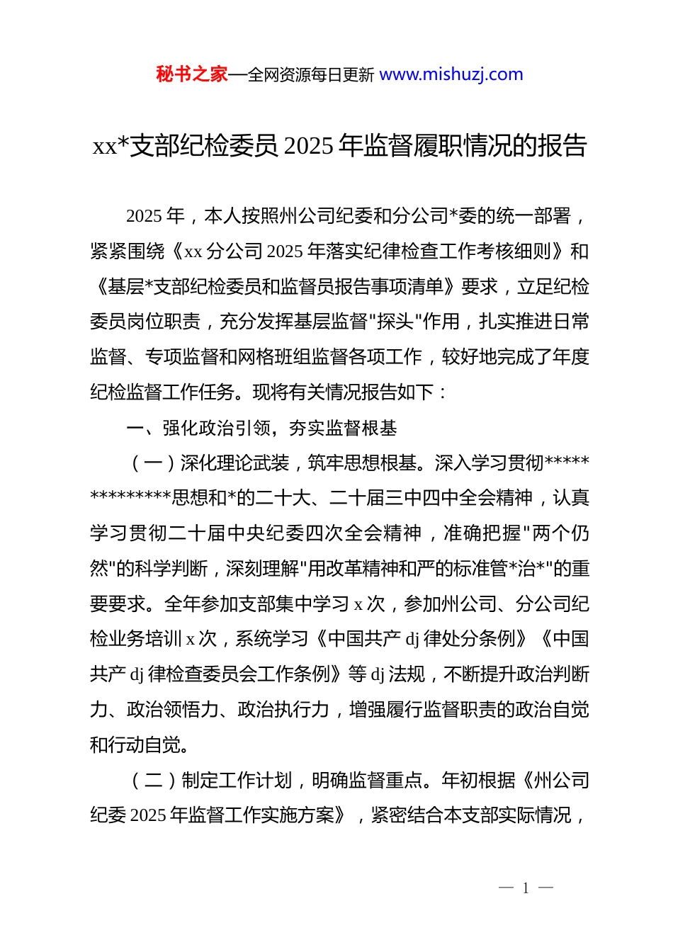 秘书之家—全网资源每日更新 www.mishuzj.comxx*支部纪检委员 2025 年监督履职情况的报告2025 年,本人按照州公司纪委和分公司*委的统一部署,紧紧围绕《xx 分公司 2025 年落实纪律检查工作考核细则》和《基层*支部纪检委员和监督员报告事项清单》要求,立足纪检委员岗位职责,充分发挥基层监督"探头"作用,扎实推进日常监督、专项监督和网格班组监督各项工作,较好地完成了年度纪检监督工作任务。现将有关情况报告如下:一、强化政治引领,夯实监督根基(一)深化理论武装,筑牢思想根基。深入学习贯彻**************思想和*的二十大、二十届三中四中全会精神,认真学习贯彻二十届中央纪委四次全会精神 ,准确把握"两个仍然"的科学判断,深刻理解"用改革精神和严的标准管*治*"的重要要求。全年参加支部集中学习 x 次,参加州公司、分公司纪检业务培训 x 次,系统学习《中国共产 dj 律处分条例》《中国共产 dj 律检查委员会工作条例》等 dj 法规,不断提升政治判断力、政治领悟力、政治执行力,增强履行监督职责的政治自觉和行动自觉。(二)制定工作计划,明确监督重点。年初根据《州公司纪委 2025 年监督工作实施方案》,紧密结合本支部实际情况,— 1 —秘书之家—全网资源每日更新 www.mishuzj.com研究制定《xxxx*支部 2025 年度监督工作计划》,明确全年监督工作目标任务、重点内容和时间节点。按照"1+4+6+x"监督框架,将"一把手"和领导班子监督、八项规定及其实施细则精神和纠治"四风"监督、巡视巡察整改监督、政企领域问题系统整治、有线宽带发展质量监督等日常监督项目,以及推进 dj 学习教育常态化长效化、持续深化整治群众身边不正之风和腐败问题等专项监督任务纳入计划,做到年初有部署、季度有重点、月度有安排。二、聚焦重点任务,扎实开展监督(一)抓实日常监督,当好基层"探头"。一是强化"一把手"和领导班子监督。紧盯落实"第一议题"制度、执行民主集中制、"三重一大"决策机制等重点,全年列席支部*员大会 x 次、支委会 x 次,监督支部书记履行第一责任人职责情况,重点关注重大事项决策程序是否规范、议事规则是否严格执行。二是深化八项规定精神和纠治"四风"监督。紧盯节假日等重要时间节点,对公务接待、公车使用、津补贴发放等进行监督检查,全年开展节前廉洁提醒 x 次,督促落实中央八项规定及其实施细则精神。三是跟进巡视巡察整改监督。对照上级巡视巡察、审计反馈问题清单,建立整改台账,定期督促检查整改进度,确保问题整改到位、不反弹回潮。四是推进政企领域问题系统— 2 —秘书之家—全网资源每日更新 www.mishuzj.com整治。聚焦政商交往、工程建设、物资采购等重点领域,加强过程监督,督促规范廉洁从业行为。五是加强有线宽带发展质量监督。围绕有线宽带业务发展关键环节,监督业务办理、服务质量等方面的合规性,维护客户和企业利益。(二)深化专项监督,推动重点工作落实。一是推进 dj 学习教育常态化长效化。督促支部认真学习贯彻《中国共产 dj 律处分条例》,组织开展学习研讨 x 次,引导*员干部学纪、知纪、明纪、守纪,增强纪律意识和规矩意识。二是持续深化整治群众身边不正之风和腐败问题。聚焦服务群众"最后一公里",监督检查窗口服务、业务办理、投诉处理等环节,发现问题及时提出整改建议。三是推进健全完善公司监督体系。配合分公司纪委完善监督机制,加强与业务部门的沟通协调,形成监督合力。四是落实"第一议题"制度监督。监督支部严格落实"第一议题"制度,确保*中央决策部署、上级*组织工作要求第一时间传达学习、第一时间贯彻落实。(三)强化网格班组监督,延伸监督触角。一是督促基层监督员履职尽责。指导网格监督员、班组监督员开展日常监督检查,运用"监督一点通"平台提交工单 x 件,推动问题及时发现、及时处置。二是推进网格重点事项(微权力)公示。督促落实微权力公示制度,将涉及员工切身利益的事项进行公开公— 3 —秘书之家—全网资源每日更新 www.mishuzj.com示,接受群众监督,让权力在阳光下运行。三是推进基层监督员职责"上墙"。完成监督员职责公示上墙工作,明确...