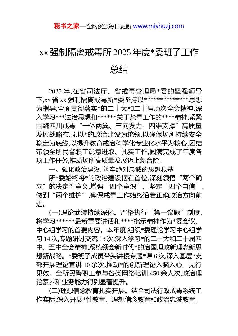 秘书之家—全网资源每日更新 www.mishuzj.comxx 强制隔离戒毒所 2025 年度*委班子工作总结2025 年,在省司法厅、省戒毒管理局*委的坚强领导下,xx 省 xx 强制隔离戒毒所*委坚持以**************思想为指导,全面贯彻落实*的二十大和二十届历次全会精神,深入学习***法治思想和******关于禁毒工作的****精神,紧紧围绕四川戒毒“一体两翼、三向发力、四维支撑”高质量发展战略布局,以*的政治建设为统领,以确保场所持续安全稳定为底线,以提升教育戒治科学化专业化水平为核心,团结带领全所民警职工锐意进取、扎实工作,圆满完成了年度各项工作任务,推动场所高质量发展迈上新台阶。一、强化政治建设,筑牢绝对忠诚的思想根基所*委始终将*的政治建设摆在首位,深刻领悟“两个确立”的决定性意义,增强“四个意识”、坚定“四个自信”、做到“两个维护”,确保戒毒工作始终沿着正确政治方向前进。(一)理论武装持续深化。严格执行“第一议题”制度,将学习******最新重要讲话和****批示精神作为*委会议、中心组学习的首要内容。本年度,组织*委理论学习中心组学习 14 次,专题研讨交流 13 次,深入学习*的二十大和二十届四中、五中全会精神,系统领会新时代*的治国理政新理念新思想新战略。*委班子成员带头讲授专题*课 6 次,深入基层*支部开展理论宣讲 10 余次,推动*的创新理论入脑入心、见行见效。全所民警职工参与各类网络培训 450 余人次,政治理论素养和业务能力得到显著提升。(二)理想信念教育扎实开展。结合司法行政戒毒系统工作实际,深入开展*性教育、理想信念教育和政治忠诚教育。秘书之家—全网资源每日更新 www.mishuzj.com组织开展了“请*放心、强戒有我”主题实践活动,通过参观红色教育基地、重温入*誓词、观看警示教育片等多种形式,引导全体民警职工筑牢信仰之基、补足精神之钙、把稳思想之舵。严肃*内政治生活,高质量召开 2024 年度民主生活会和专题组织生活会,班子成员带头查摆问题、剖析根源,共查摆出 6 个方面 18 项问题,已全部制定整改措施并销号清零。(三)意识形态阵地坚决筑牢。全面落实意识形态工作责任制,牢牢掌握意识形态工作领导权和主动权。制定并实施了《意识形态工作要点》,定期分析研判意识形态领域风险,加强对单位网站、微信公众号等宣传阵地的管理,严格执行信息发布“三审三校”制度,确保了意识形态领域的绝对安全。本年度,在各级媒体平台发布正面宣传信息 400 余条,其中省级以上媒体刊发 28 条,有效展示了 xx 戒毒工作的良好形象。二、聚焦主责主业,提升教育戒治的质量效能所*委坚持向科学戒治要质量、向规范管理要效益,全面落实司法部统一戒毒基本模式,不断推动教育戒治工作科学化、专业化、社会化发展。(一)场所安全防线更加稳固。始终将安全稳定作为压倒一切的政治任务,坚持底线思维,强化风险意识,压实安全责任。全年实现了“六无”安全目标。深入推进“智慧戒毒”建设,完成了智慧安防系统升级改造项目,实现了监控系统对重点区域的 100%覆盖和 24 小时实时监控,周界智能防护和电子围栏系统投入实战运行,场所人防、物防、技防、心防“四防一体”的安全防范体系更加完善。定期组织开展应急处突演练 12 次,排查整治各类安全隐患 50 余处,民警安全防范意识和应急处置能力显著增强。(二)教育戒治科学化水平显著提升。紧扣提升戒治质量核心目标,构建了系统化、规范化的教育戒治体系。严格落实“日课堂、周计划、月主题、季活动”的教育矫治模式,开设法治道德、文化知识、心理健康、形势政策等课程,全秘书之家—全网资源每日更新 www.mishuzj.com年累计授课达 2100 余课时。积极探索“中医+戒毒”特色疗法,与 xx 市中医院合作,将八段锦、耳穴压豆等中医适宜技术融入日常康复训练,戒毒人员体质健康水平普遍改善。据统计,康复训练课程参与率达到 98%以上,学员普遍反映身心状况得到积极调整。同时,全面推行戒毒人员诊断评估制度,对每名戒毒人员进行动态评估、精准施策,个案化教育矫治方案覆盖率达到 100%。(三)医疗康复与心理矫治精准发力。不断完善所内医疗设施,并与 xx 市中心医院建立了“医联体”合作关系,开通了危重症病人救...