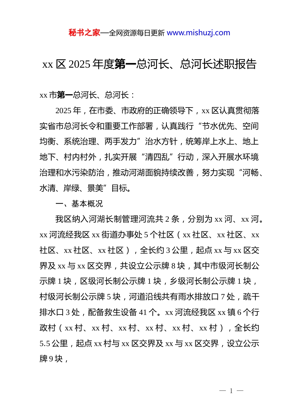 秘书之家—全网资源每日更新 www.mishuzj.comxx 区 2025 年度第一总河长、总河长述职报告xx 市第一总河长、总河长:2025 年,在市委、市政府的正确领导下,xx 区认真贯彻落实省市总河长令和重要工作部署,认真践行“节水优先、空间均衡、系统治理、两手发力”治水方针,统筹岸上水上、地上地下、村内村外,扎实开展“清四乱”行动,深入开展水环境治理和水污染防治,推动河湖面貌持续改善,努力实现“河畅、水清、岸绿、景美”目标。一、基本概况我区纳入河湖长制管理河流共 2 条,分别为 xx 河、xx 河。xx 河流经我区 xx 街道办事处 5 个社区(xx 社区、xx 社区、xx社区、xx 社区、xx 社区),全长约 3 公里,起点 xx 与 xx 区交界及 xx 与 xx 区交界,共设立公示牌 8 块,其中市级河长制公示牌 1 块,区级河长制公示牌 1 块,乡级河长制公示牌 1 块,村级河长制公示牌 5 块,河道沿线共有雨水排放口 7 处,疏干排水口 3 处,配备救生设备 41 个。xx 河流经我区 xx 镇 6 个行政村(xx 村、xx 村、xx 村、xx 村、xx 村、xx 村),全长约5.5 公里,起点 xx 村与 xx 区交界及 xx 与 xx 区交界,设立公示牌 9 块,— 1 —秘书之家—全网资源每日更新 www.mishuzj.com其中市级河长制公示牌 1 块,区级河长制公示牌 1 块,乡级河长制公示牌 1 块,村级河长制公示牌 6 块。河道沿线设立 2处河道断面水质监测站,共有雨水排放口 6 处,疏干排水口 2处,配备救生设备 26 个。二、主要工作情况(一)狠抓河湖长巡河。建立由*工委、管委会主要负责同志任河湖长的区、镇(街道)、村(社区)三级河湖长体系,健全完善网格化管理、巡查督查、考核评比、述职评议等制度,推动各级河长责任上肩。定期召开分析研判会议,及时有效处理疑难问题。截至目前,区级河长巡河 28 次,镇级河长巡河 92次,村级河长巡河 741 次,各级河长巡河率达到 100%,有效完成了巡河任务。(二)狠抓“清四乱”工作。为持续推进河湖“清四乱”工作,全面落实河长制责任,营造干净整洁的河道生态环境。重点排查河道是否存在“乱占、乱采、乱堆、乱建”等突出问题,依法整治非法侵占水域岸线、影响行洪安全、倾倒废弃物等破坏河道生态环境的行为。累计排查河道 416.5 公里,出动883 人次,发现并整治“清四乱”问题 2 处。通过人工清理与机械作业相结合的方式,平整河道岸线 25 余米,有效改善了河道生态环境。— 2 —秘书之家—全网资源每日更新 www.mishuzj.com(三)狠抓河道保洁管护。通过“挖机作业+日常巡护”模式推进全域河道治理,维护“河畅水清”的生态格局,制定了《xx 区河湖长效保洁工作的指导意见(试行)》、《xx 区纵深推进河道“清四乱”常态化规范化实施方案》等相关文件。形成“巡、护、管、治”常态化管理方式。同时,通过引导群众自觉维护河道及周边环境,共同打造水清、岸绿、景美的乡村新画卷。累计清理河道垃圾 13 吨。(四)狠抓汛前隐患排查。牢固树立“防大汛、抗大洪、抢大险”的思想,深入开展汛前河道安全隐患排查工作。重点对河段堤防、河道隐患点进行拉网式、全方位大排查,结合往年工作经验,确保堤防一线安全度汛。对排查中发现的问题建立隐患台账,进行分类处理,坚决做到汛前将隐患全部整改治理到位,做到隐患排查不留死角、整改不留盲区,全面提升防汛减灾能力,全力确保安全度汛。(五)狠抓宣传舆论引导。组织开展“守护河道生态共建宜居家园”主题宣传活动,以实际行动助力水环境改善。通过发放宣传手册、现场讲解等形式,向群众普及河道保洁、水污染防治、生态保护等相关知识,重点讲解乱倒垃圾、排放污水等行为对河道生态的危害及相关法律法规,倡导大家自觉养成垃圾分类、不向河道倾倒废弃物的良好习惯,主动参与到河道— 3 —秘书之家—全网资源每日更新 www.mishuzj.com保护中来。同时,结合日常巡查发现的问题,及时劝阻身边破坏河道环境的不文明行为,共同守护清澈河道。累计发放宣传手册 4500 余份,解答居民咨询 50 余人次,进一步增强了群众的...