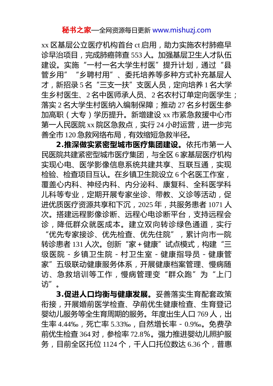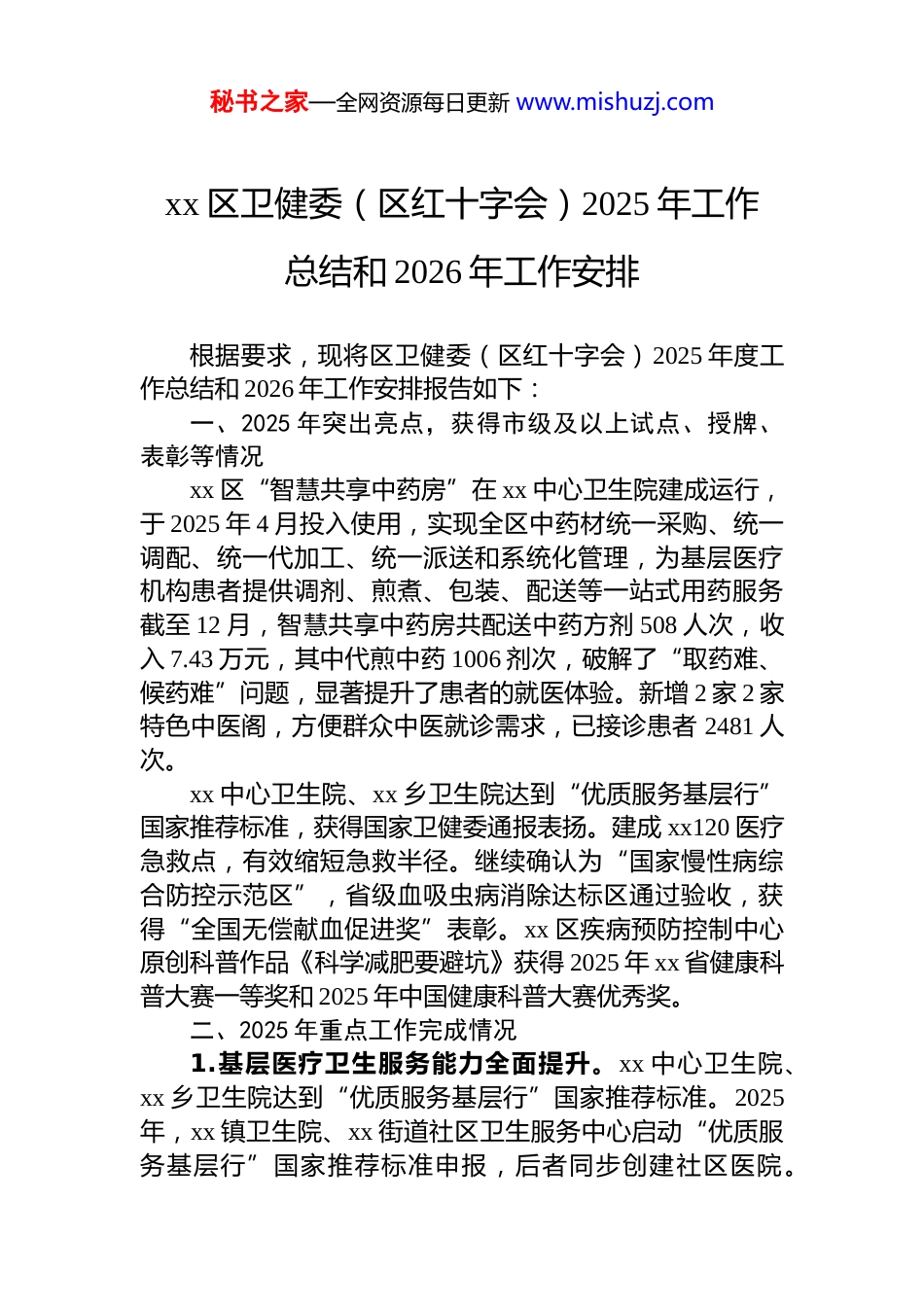 秘书之家—全网资源每日更新 www.mishuzj.comxx 区卫健委(区红十字会)2025 年工作总结和 2026 年工作安排根据要求,现将区卫健委(区红十字会)2025 年度工作总结和 2026 年工作安排报告如下:一、2025 年突出亮点,获得市级及以上试点、授牌、表彰等情况xx 区“智慧共享中药房”在 xx 中心卫生院建成运行,于 2025 年 4 月投入使用,实现全区中药材统一采购、统一调配、统一代加工、统一派送和系统化管理,为基层医疗机构患者提供调剂、煎煮、包装、配送等一站式用药服务截至 12 月,智慧共享中药房共配送中药方剂 508 人次,收入 7.43 万元,其中代煎中药 1006 剂次,破解了“取药难、候药难”问题,显著提升了患者的就医体验。新增 2 家 2 家特色中医阁,方便群众中医就诊需求,已接诊患者 2481 人次。xx 中心卫生院、xx 乡卫生院达到“优质服务基层行”国家推荐标准,获得国家卫健委通报表扬。建成 xx120 医疗急救点,有效缩短急救半径。继续确认为“国家慢性病综合防控示范区”,省级血吸虫病消除达标区通过验收,获得“全国无偿献血促进奖”表彰。xx 区疾病预防控制中心原创科普作品《科学减肥要避坑》获得 2025 年 xx 省健康科普大赛一等奖和 2025 年中国健康科普大赛优秀奖。二、2025 年重点工作完成情况1.基层医疗卫生服务能力全面提升。xx 中心卫生院、xx 乡卫生院达到“优质服务基层行”国家推荐标准。2025年,xx 镇卫生院、xx 街道社区卫生服务中心启动“优质服务基层行”国家推荐标准申报,后者同步创建社区医院。秘书之家—全网资源每日更新 www.mishuzj.comxx 区基层公立医疗机构首台 ct 启用,助力实施农村肺癌早诊早治项目,完成肺癌筛查 553 人。加强基层卫生人才队伍建设。实施“一村一名大学生村医”提升计划,通过“县管乡用”“乡聘村用”、委托培养等多种方式补充基层人才,新招录 5 名“三支一扶”支医人员,定向培养 1 名大学生乡村医生、2 名中医师承人员、2 名农村订单定向医学生;落实 2 名大学生村医纳入编制保障;推动 27 名乡村医生参加高职(大专)学历提升。新增建设 xx 市紧急救援中心市第一人民医院 xx 院区急救点,实行 24 小时运营,进一步完善全市 120 急救网络布局,有效缩短急救半径。2.推深做实紧密型城市医疗集团建设。依托市第一人民医院共建紧密型城市医疗集团,与全区 6 家基层医疗机构实现心电、医学影像信息系统共建共享、互联互通,实现检验、检查项目互认。在乡镇卫生院设立 6 个名医工作室,覆盖心内科、神经内科、内分泌科、康复科、全科医学科儿科等专业,定期开展专家坐诊、带教、义诊等活动,促进优质医疗资源共享和下沉,2025 年,共服务患者 1071 人次。搭建远程影像诊断、远程心电诊断平台,支持远程会诊,降低群众就医成本。建立双向转诊绿色通道,实行“优先专家接诊、优先检查、优先住院”,累计向市一院转诊患者 131 人次。创新“家+健康”试点模式,构建“三级医院-乡镇卫生院-村卫生室-健康指导员-健康管家”五级联动健康服务体系,开展健康档案管理、慢病随访、急救培训等工作,慢病管理变“群众跑”为“上门访”。3.促进人口均衡与健康发展。妥善落实生育配套政策衔接,开展婚前医学检查、孕前优生健康检查、生育登记婴幼儿服务等全生育周期的服务。年度出生人口 769 人,出生率 4.44‰,死亡率 5.33‰,自然增长率-0.9‰。免费孕前优生检查 364 对,参检率 72.8%。强力推进婴幼儿照护服务,目前全区托位 1124 个,千人口托位数达 6.36 个,普惠秘书之家—全网资源每日更新 www.mishuzj.com托位 874 个,普惠占比 78%。建立健全计划生育特殊家庭帮扶制度,2025 年为享受特别扶助对象家庭办理综合保险203 户,为全区 67 户计生专干家庭办理意外伤害保险,紧急慰藉 6 户独生子女死亡的家庭,困难慰问 60 户计生家庭,对全区 203 户特殊家庭进行一年 4 次走访慰问,累计资金22.4 万元;落实计划生育特殊家庭“三个全覆盖”,为关爱特殊老人开展情暖 xx“情暖重阳共赏秋光”活动;确认计生...