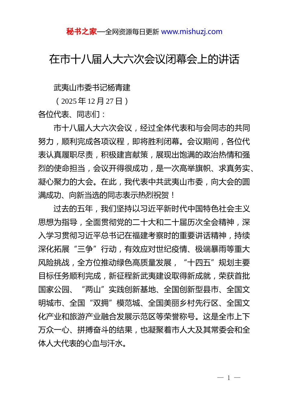 秘书之家—全网资源每日更新 www.mishuzj.com在市十八届人大六次会议闭幕会上的讲话武夷山市委书记杨青建(2025 年 12 月 27 日)各位代表、同志们:市十八届人大六次会议,经过全体代表和与会同志的共同努力,顺利完成各项议程,即将胜利闭幕。会议期间,各位代表认真履职尽责,积极建言献策,展现出饱满的政治热情和强烈的使命担当,会议开得很成功,是一次高举旗帜、求真务实、凝心聚力的大会。在此,我代表中共武夷山市委,向大会的圆满成功、向新当选的同志表示热烈祝贺!过去的五年,我们坚持以习近平新时代中国特色社会主义思想为指导,全面贯彻党的二十大和二十届历次全会精神,深入学习贯彻习近平总书记在福建考察时的重要讲话精神,持续深化拓展“三争”行动,有效应对世纪疫情、极端暴雨等重大风险挑战,全方位推动绿色高质量发展,“十四五”规划主要目标任务顺利完成,新征程新武夷建设取得新成就,荣获首批国家公园、“两山”实践创新基地、全国创新型县市、全国文明城市、全国“双拥”模范城、全国美丽乡村先行区、全国文化产业和旅游产业融合发展示范区等荣誉称号。这是全市上下万众一心、拼搏奋斗的结果,也凝聚着市人大及其常委会和全体人大代表的心血与汗水。— 1 —秘书之家—全网资源每日更新 www.mishuzj.com2026 年是“十五五”规划开局之年,做好明年工作意义重大、事关长远。市委十四届九次全会审议通过了“十五五”规划建议,这次市“两会”审议通过了“十五五”规划纲要,并对明年工作作了具体安排部署。新时代赋予新使命,新征程呼唤新担当。全市上下要进一步增强责任感和使命感,认真落实好市委全会和本次市人代会确定的各项目标任务,在找准定位中强担当,在细化举措中抓落实,在攻坚克难中开新局,在推进绿色高质量发展中提质增效、奋勇争先。一、实现提质增效、奋勇争先,必须筑牢思想之基。思想是行动的先导,理论是实践的指南。习近平总书记对武夷山发展寄予厚望,在福建工作期间到武夷山不下 10 次,为我们留下了宝贵的思想财富和精神财富。明年是习近平总书记到武夷山考察 5 周年,要学深悟透习近平新时代中国特色社会主义思想和党的二十届四中全会、中央经济工作会议精神,与学习领会习近平总书记对武夷山工作的重要讲话重要指示精神紧密结合起来,特别要深刻领会“建设以武夷山为中心的大武夷文化旅游圈”和“四个方面”重要指示的深邃思考和战略指引,切实从中学出坚定信仰、学出绝对忠诚、学出使命担当,把对习近平总书记的深厚爱戴之情转化为干事创业的强大动力,坚定不移沿着习近平总书记指引的方向前进,在中国式现代化建设中奋勇争先,努力实现“生态保护、绿色发展、民生改善”相统一。— 2 —秘书之家—全网资源每日更新 www.mishuzj.com二、实现提质增效、奋勇争先,必须激发创新之力。创新是引领发展的第一动力,要强化创新驱动,加紧培育壮大新动能。要以创新抓项目。坚持投资于物和投资于人紧密结合,强化一把手抓项目谋划、抓招商引资、抓项目建设机制,以实施“十五五”规划为契机,聚焦构建“1345”城镇发展格局和“11X”现代化绿色产业体系的战略部署,以及建设具有武夷特色的现代化人民城市,借智借力、精心谋划实施一批质量效益优、带动作用强的大、好、新项目,为新武夷建设蓄势赋能。要以创新强产业。推动科技创新与产业创新深度融合,统筹推进科创平台建设、关键技术攻关、企业主体培育、人才引育留用,加快茶、竹、水等县域重点产业链向智能化、绿色化、融合化转型升级,积极培育“双碳”、康养、数字经济、低空经济等新兴产业,以科技创新赋能产业变革,打造更具核心竞争力的现代化绿色产业体系。要以创新增活力。把改革的精神、改革的思维、改革的办法贯穿工作始终,持续深化生态保护“123”机制、行政综合执法改革、茶旅产业信用体系建设等重点领域和关键环节改革,纵深推进生态产品价值实现机制试点、森林“四库”联动机制试点建设,努力形成更多具有武夷山特色、可复制可推广的标志性改革成果。三、实现提质增效、奋勇争先,必须大兴实干之风。实干是我们党的优良作风,过去我们取得的辉煌成就...