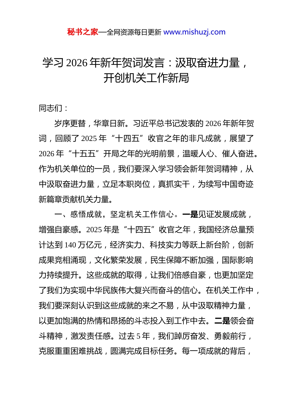秘书之家—全网资源每日更新 www.mishuzj.com学习 2026 年新年贺词发言:汲取奋进力量,开创机关工作新局 同志们:岁序更替,华章日新。习近平总书记发表的 2026 年新年贺词,回顾了 2025 年“十四五”收官之年的非凡成就,展望了2026 年“十五五”开局之年的光明前景,温暖人心、催人奋进。作为机关单位的一员,我们要深入学习领会新年贺词精神,从中汲取奋进力量,立足本职岗位,真抓实干,为续写中国奇迹新篇章贡献机关力量。一、感悟成就,坚定机关工作信心。一是见证发展成就,增强自豪感。2025 年是“十四五”收官之年,我国经济总量预计达到 140 万亿元,经济实力、科技实力等跃上新台阶,创新成果竞相涌现,文化繁荣发展,民生保障不断加强,国际影响力持续提升。这些成就的取得,让我们倍感自豪,也更加坚定了我们为实现中华民族伟大复兴而奋斗的信心。在机关工作中,我们要深刻认识到这些成就的来之不易,从中汲取精神力量,以更加饱满的热情和昂扬的斗志投入到工作中去。二是领会奋斗精神,激发责任感。过去 5 年,我们踔厉奋发、勇毅前行,克服重重困难挑战,圆满完成目标任务。每一项成就的背后,秘书之家—全网资源每日更新 www.mishuzj.com都凝聚着无数奋斗者的心血和汗水。作为机关干部,我们要学习这种奋斗精神,增强责任感和使命感,勇于担当、积极作为。要立足本职岗位,认真履行工作职责,努力为推动机关各项工作的顺利开展贡献自己的力量。二、聚焦重点,推动机关工作创新。一是依靠创新赋能,提升工作效能。新年贺词中强调了创新的重要性。在机关工作中,我们要积极响应号召,依靠创新为工作赋能。要加强对新技术、新方法的学习和应用,推动机关工作的数字化、智能化转型。例如,利用大数据、人工智能等技术手段,提高工作效率和决策的科学性。同时,要鼓励干部职工积极创新工作方式方法,勇于突破传统思维定式,不断探索解决问题的新途径、新办法。二是以文化滋养精神,营造良好氛围。文化是民族的精神命脉,也是机关工作的重要支撑。我们要以文化滋养机关干部的精神家园,营造积极向上、团结协作的良好氛围。要加强机关文化建设,开展丰富多彩的文化活动,弘扬中华优秀传统文化和社会主义核心价值观。通过文化的熏陶和感染,激发干部职工的工作热情和创造力,增强机关的凝聚力和战斗力。三、关注民生,强化机关工作服务。一是共创共享美好生活,增进民生福祉。新年贺词中体现了对民生的高度关注。在机关工作中,我们要始终坚持以人民为中心的发展思想,把增秘书之家—全网资源每日更新 www.mishuzj.com进民生福祉作为工作的出发点和落脚点。要加强与群众的沟通联系,了解群众的需求和诉求,积极为群众办实事、解难题。要加大对民生领域的投入和支持力度,推动教育、医疗、就业等各项社会事业的发展,让改革发展成果更多更公平惠及全体人民。二是加强干部自身建设,提升服务水平。机关干部是服务群众的主力军,其自身素质和服务水平直接关系到机关工作的成效。我们要加强机关干部的自身建设,提高干部的政治素质、业务能力和服务意识。要加强干部的教育培训,开展岗位练兵活动,不断提升干部的综合素质。同时,要建立健全服务群众的长效机制,规范服务流程,提高服务质量,为群众提供更加优质、高效、便捷的服务。四、展望未来,开启机关工作新征程。一是锚定目标任务,扎实推动发展。2026 年是“十五五”开局之年,我们要锚定目标任务,坚定信心、乘势而上。在机关工作中,我们要围绕“十五五”规划的总体目标和要求,结合机关实际,制定切实可行的工作计划和措施。要加强对工作的统筹协调和推进落实,确保各项工作任务按时完成。同时,要加强对工作的监督检查,及时发现和解决工作中存在的问题,推动机关工作不断取得新成效。二是携手奋进前行,共创美好未来。新的一年,我们要携手奋进前行,共同开创机关工作的美好未来。要加强机关干秘书之家—全网资源每日更新 www.mishuzj.com部之间的团结协作,形成工作合力。要相互支持、相互配合,共同攻克工作中的难关。同时,要加强与其他部门和单位的沟通协作,形成工作联动机制,共同推动经...