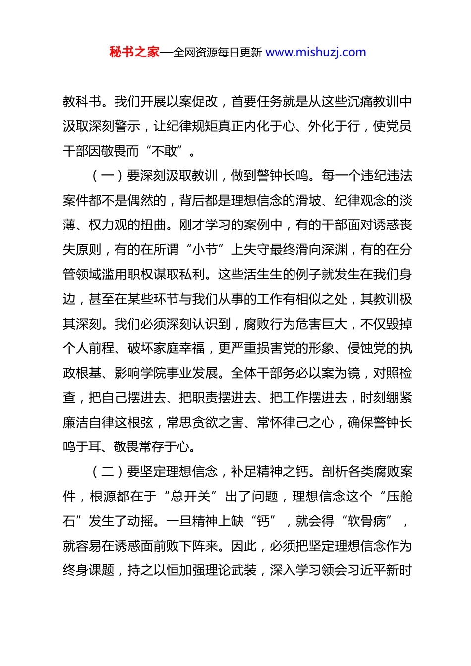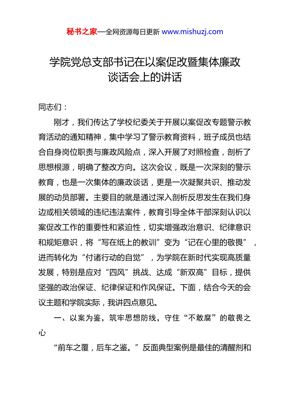 秘书之家—全网资源每日更新 www.mishuzj.com学院党总支部书记在以案促改暨集体廉政谈话会上的讲话 同志们:刚才,我们传达了学校纪委关于开展以案促改专题警示教育活动的通知精神,集中学习了警示教育资料,班子成员也结合自身岗位职责与廉政风险点,深入开展了对照检查,剖析了思想根源,明确了整改方向。这次会议,既是一次深刻的警示教育,也是一次集体的廉政谈话,更是一次凝聚共识、推动发展的动员部署。主要目的就是通过深入剖析反思发生在我们身边或相关领域的违纪违法案件,教育引导全体干部深刻认识以案促改工作的重要性和紧迫性,切实增强政治意识、纪律意识和规矩意识,将“写在纸上的教训”变为“记在心里的敬畏”,进而转化为“付诸行动的自觉”,为学院在新时代实现高质量发展,特别是应对“四风”挑战、达成“新双高”目标,提供坚强的政治保证、纪律保证和作风保证。下面,结合今天的会议主题和学院实际,我讲四点意见。一、以案为鉴,筑牢思想防线,守住“不敢腐”的敬畏之心“前车之覆,后车之鉴。”反面典型案例是最佳的清醒剂和秘书之家—全网资源每日更新 www.mishuzj.com教科书。我们开展以案促改,首要任务就是从这些沉痛教训中汲取深刻警示,让纪律规矩真正内化于心、外化于行,使党员干部因敬畏而“不敢”。(一)要深刻汲取教训,做到警钟长鸣。每一个违纪违法案件都不是偶然的,背后都是理想信念的滑坡、纪律观念的淡薄、权力观的扭曲。刚才学习的案例中,有的干部面对诱惑丧失原则,有的在所谓“小节”上失守最终滑向深渊,有的在分管领域滥用职权谋取私利。这些活生生的例子就发生在我们身边,甚至在某些环节与我们从事的工作有相似之处,其教训极其深刻。我们必须深刻认识到,腐败行为危害巨大,不仅毁掉个人前程、破坏家庭幸福,更严重损害党的形象、侵蚀党的执政根基、影响学院事业发展。全体干部务必以案为镜,对照检查,把自己摆进去、把职责摆进去、把工作摆进去,时刻绷紧廉洁自律这根弦,常思贪欲之害、常怀律己之心,确保警钟长鸣于耳、敬畏常存于心。(二)要坚定理想信念,补足精神之钙。剖析各类腐败案件,根源都在于“总开关”出了问题,理想信念这个“压舱石”发生了动摇。一旦精神上缺“钙”,就会得“软骨病”,就容易在诱惑面前败下阵来。因此,必须把坚定理想信念作为终身课题,持之以恒加强理论武装,深入学习领会习近平新时秘书之家—全网资源每日更新 www.mishuzj.com代中国特色社会主义思想的核心要义和精神实质,特别是关于全面从严治党、党风廉政建设和反腐败斗争的重要论述。要扎实推进党的创新理论进课堂、进教材、进头脑,不仅对学生,首先是我们干部自身要真学真懂真信真用。要自觉加强党性修养,不断锤炼政治品格,牢记党的宗旨,不忘初心使命,从思想深处解决好“我是谁、为了谁、依靠谁”的根本问题,筑牢拒腐防变的思想道德防线。(三)要严守纪律规矩,不越红线底线。党的纪律和规矩是带电的“高压线”,是不可触碰的“底线”。大量案例表明,党员领导干部违法,无不始于违纪。破法必先破纪。我们必须把纪律和规矩挺在前面,自觉用党章党规党纪约束自身言行。要严守政治纪律和政治规矩,决不允许自行其是、阳奉阴违。要严格执行中央八项规定及其实施细则精神,坚决抵制“四风”隐形变异问题,特别是在公务接待、项目经费使用、科研管理、招生招聘、合作办学等关键环节,更要严格按制度、按程序办事。要纯洁社交圈、规范工作圈、管住生活圈,注重培养健康的生活情趣,保持高尚的精神追求,做到人前人后一个样、八小时内外一个样、有无监督一个样,坚决守住清正廉洁的底线。二、以案促改,扎紧制度笼子,健全“不能腐”的防范机秘书之家—全网资源每日更新 www.mishuzj.com制“善除害者察其本,善理疾者绝其源。”以案促改,关键在“促”,目标在“改”。要通过深刻剖析案件,找出制度漏洞、监管盲点,进而完善体制机制,强化权力制约监督,从源头上铲除腐败滋生的土壤,形成靠制度管权、管事、管人的长效机制,让胆敢腐败者无机可乘。(一)要深入排查风险,找准病灶根源。看不到风险是最大的风险,查不出问题...