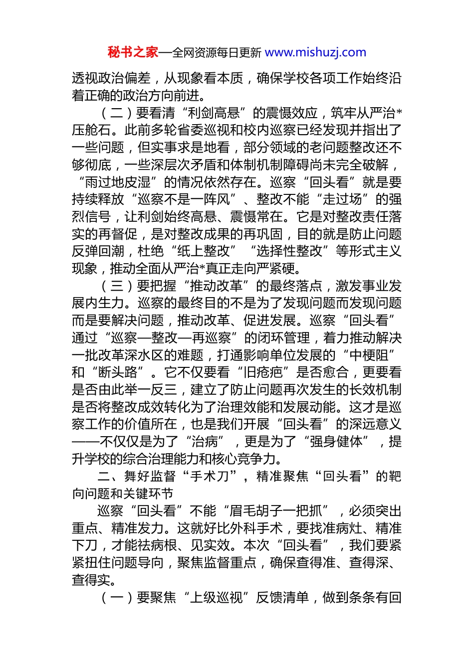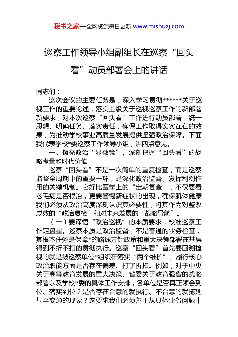 秘书之家—全网资源每日更新 www.mishuzj.com巡察工作领导小组副组长在巡察“回头看”动员部署会上的讲话同志们:这次会议的主要任务是,深入学习贯彻******关于巡视工作的重要论述,落实上级关于巡视巡察工作的新部署新要求,对本次巡察“回头看”工作进行动员部署,统一思想、明确任务、落实责任,确保工作取得实实在在的效果,为推动学校事业高质量发展提供坚强政治保障。下面我代表学校*委巡察工作领导小组,讲四点意见。一、擦亮政治“显微镜”,深刻把握“回头看”的战略考量和时代价值巡察“回头看”不是一次简单的重复检查,而是巡察监督全周期中的重要一环,是深化政治监督、发挥利剑作用的关键机制。它好比医学上的“定期复查”,不仅要看老毛病是否根治,更要警惕新症状的出现,确保肌体健康我们必须从政治高度深刻认识其必要性,将其作为对整改成效的“政治复检”和对未来发展的“战略导航”。(一)要深悟“政治巡视”的本质要求,校准巡察工作定盘星。巡察本质是政治监督,不是普通的业务检查,其根本任务是保障*的路线方针政策和重大决策部署在基层得到不折不扣的贯彻执行。巡察“回头看”首先要回溯检视的就是被巡察单位*组织在落实“两个维护”、履行核心政治职能方面是否存在偏差、打了折扣。例如,对于中央关于高等教育发展的重大决策、省委关于教育强省的战略部署以及学校*委的具体工作安排,各单位是否真正领会到位、落实到位?是否存在合意的就执行、不合意的就拖延甚至变通的现象?这要求我们必须善于从具体业务问题中秘书之家—全网资源每日更新 www.mishuzj.com透视政治偏差,从现象看本质,确保学校各项工作始终沿着正确的政治方向前进。(二)要看清“利剑高悬”的震慑效应,筑牢从严治*压舱石。此前多轮省委巡视和校内巡察已经发现并指出了一些问题,但实事求是地看,部分领域的老问题整改还不够彻底,一些深层次矛盾和体制机制障碍尚未完全破解,“雨过地皮湿”的情况依然存在。巡察“回头看”就是要持续释放“巡察不是一阵风”、整改不能“走过场”的强烈信号,让利剑始终高悬、震慑常在。它是对整改责任落实的再督促,是对整改成果的再巩固,目的就是防止问题反弹回潮,杜绝“纸上整改”“选择性整改”等形式主义现象,推动全面从严治*真正走向严紧硬。(三)要把握“推动改革”的最终落点,激发事业发展内生力。巡察的最终目的不是为了发现问题而发现问题而是要解决问题,推动改革、促进发展。巡察“回头看”通过“巡察—整改—再巡察”的闭环管理,着力推动解决一批改革深水区的难题,打通影响单位发展的“中梗阻”和“断头路”。它不仅要看“旧疮疤”是否愈合,更要看是否由此举一反三,建立了防止问题再次发生的长效机制是否将整改成效转化为了治理效能和发展动能。这才是巡察工作的价值所在,也是我们开展“回头看”的深远意义——不仅仅是为了“治病”,更是为了“强身健体”,提升学校的综合治理能力和核心竞争力。二、舞好监督“手术刀”,精准聚焦“回头看”的靶向问题和关键环节巡察“回头看”不能“眉毛胡子一把抓”,必须突出重点、精准发力。这就好比外科手术,要找准病灶、精准下刀,才能祛病根、见实效。本次“回头看”,我们要紧紧扭住问题导向,聚焦监督重点,确保查得准、查得深、查得实。(一)要聚焦“上级巡视”反馈清单,做到条条有回秘书之家—全网资源每日更新 www.mishuzj.com音。省委巡视是政治体检,其反馈意见代表的是上级*组织的权威要求,必须不折不扣落实到位。巡察“回头看”要将省委巡视反馈涉及相关单位问题的整改落实情况作为首要监督内容。要严格对照巡视反馈的问题清单、责任清单逐条逐项进行“对账销号”。不仅要看问题表面是否整改更要看整改的措施是否扎实、成效是否真实、举一反三是否到位。对于那些需要长期坚持的整改任务,要检查长效机制是否建立并有效运行,坚决防止“汇报了就算整改了”“文件发了就万事大吉”的倾向,确保巡视利剑的权威性和严肃性得到切实维护。(二)要聚焦“校内巡察”问题台账,做到件件有着落。校内巡察发现的问题是各单位自身存在的短板和不足的集中反映。巡察“回头看”...