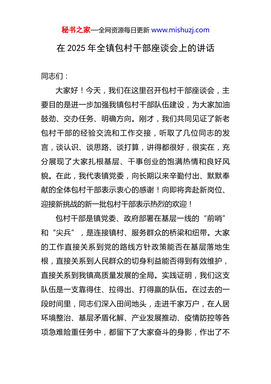 秘书之家—全网资源每日更新 www.mishuzj.com在 2025 年全镇包村干部座谈会上的讲话 同志们:大家好!今天,我们在这里召开包村干部座谈会,主要目的是进一步加强我镇包村干部队伍建设,为大家加油鼓劲、交办任务、明确方向。刚才,我们共同见证了新老包村干部的经验交流和工作交接,听取了几位同志的发言,谈认识、谈思路、谈打算,讲得都很好,很实在,充分展现了大家扎根基层、干事创业的饱满热情和良好风貌。在此,我代表镇党委,向长期以来辛勤付出、默默奉献的全体包村干部表示衷心的感谢!向即将奔赴新岗位、迎接新挑战的新一批包村干部表示热烈的欢迎!包村干部是镇党委、政府部署在基层一线的“前哨”和“尖兵”,是连接镇村、服务群众的桥梁和纽带。大家的工作直接关系到党的路线方针政策能否在基层落地生根,直接关系到人民群众的切身利益能否得到有效维护,直接关系到我镇高质量发展的全局。实践证明,我们这支队伍是一支靠得住、拉得出、打得赢的队伍。在过去的一段时间里,同志们深入田间地头,走进千家万户,在人居环境整治、基层矛盾化解、产业发展推动、疫情防控等各项急难险重任务中,都留下了大家奋斗的身影,作出了不秘书之家—全网资源每日更新 www.mishuzj.com可替代的贡献。今天,新老交替,力量加强,这既是工作的延续,更是责任的传承。希望大家以此次座谈会为新起点,牢记使命、不负重托,以更加昂扬的斗志、更加务实的作风,奋力开创我镇农村工作新局面。下面,结合当前形势和下一步工作,我讲三点意见,与同志们共勉。一、深化思想认识,在强化责任担当中淬炼“硬核”本领包村工作,核心在一个“包”字,关键在一个“干”字 。 这 个 “ 包 ” , 包 的 是 责 任 , 包 的 是 民 心 ; 这 个“干”,干的是实事,干的是未来。大家要深刻认识到,我们不是去村里“镀金”,更不是当“甩手掌柜”,而是要真正沉下去,把包联村当作自己的“责任田”,把村民当作自己的家人。首先,要拧紧思想上的“总开关”,争当政策落实的“宣传员”和“执行者”。大家身处基层治理最前沿,是上级决策部署贯彻落实的“最后一公里”。要带头学习、深刻领会区委和镇党委的各项决策部署,并结合所包联村的实际情况,用老百姓听得懂的语言、易于接受的方式,把政策讲清楚、说明白,引导广大党员群众心往一处想、劲往一处使。要严格执行各项制度规矩,特别是值班值秘书之家—全网资源每日更新 www.mishuzj.com守、日常考核等硬性要求,必须不折不扣落实到位,以铁的纪律确保责任链条环环相扣、落实到底。其次,要迈开深入群众的“铁脚板”,争当村情民意的“信息员”和“服务员”。基层情况千差万别,只有深入下去,才能摸清实情。要多开“板凳会议”,在农家小院里、大树底下,与村民面对面拉家常,听取最真实的声音。要勤于入户走访,重点关注困难户、老党员、信访户等特殊群体,了解他们的所思所想、所急所盼。要建立详实的工作台账,把村里的基本情况、资源禀赋、矛盾焦点、发展瓶颈等问题都摸清摸透。只有掌握了第一手资料,我们的工作才能有的放矢,才能真正把群众的“问题清单”变为我们的“履职清单”,用心用情用力解决好群众的急难愁盼问题。二、坚持传承创新,在推动工作延续中实现“双向”成长我们今天的会议,一个重要的议程就是工作交接。这种交接,绝不仅仅是文件材料的传递,更是经验、作风和精神的传承。新老干部要结好对子、传好“接力棒”,确保各项工作平稳过渡、无缝衔接、力度不减。一方面,要实现“青蓝相继”,在传帮带中快速成长。老同志是我们宝贵的财富,他们在长期基层工作中积秘书之家—全网资源每日更新 www.mishuzj.com累了丰富的群众工作方法和处理复杂问题的经验。要毫无保留地把好经验、好做法传授给新同志,做好情况交底、工作交接和风险提示,扶上马、送一程。新同志要虚心学习,主动请教,尽快熟悉村情、进入角色。我们要充分利用好“*学堂”、优秀党组织书记工作室等平台,通过集体学习、案例剖析、跟班实践等多种形式,系统性地为大家传经验、教业务、带作风,帮助新干部快速提升履职能力,推动老干部焕...