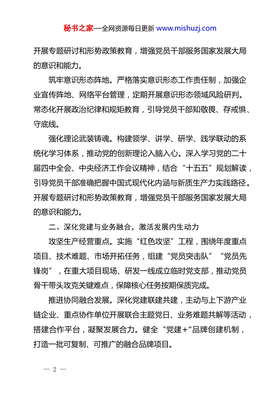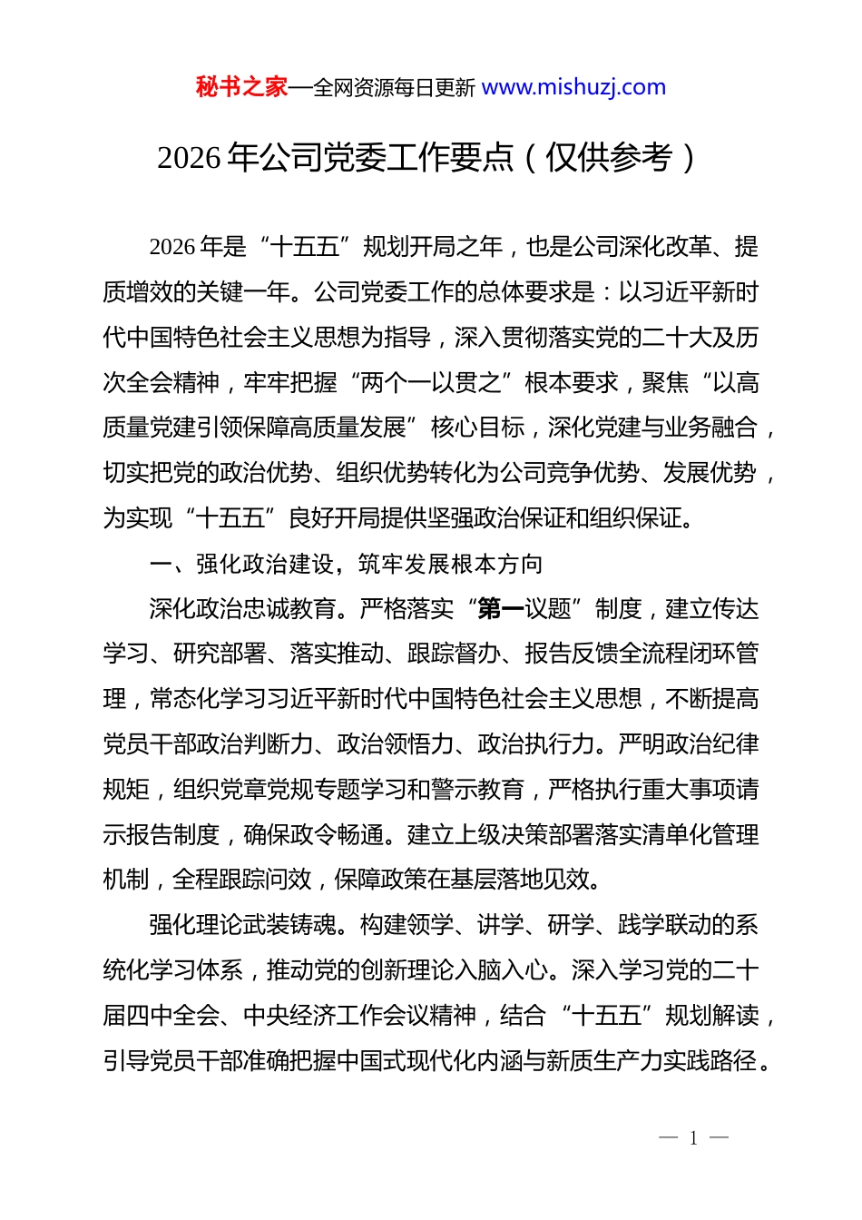 秘书之家—全网资源每日更新 www.mishuzj.com2026 年公司党委工作要点(仅供参考)2026 年是“十五五”规划开局之年,也是公司深化改革、提质增效的关键一年。公司党委工作的总体要求是:以习近平新时代中国特色社会主义思想为指导,深入贯彻落实党的二十大及历次全会精神,牢牢把握“两个一以贯之”根本要求,聚焦“以高质量党建引领保障高质量发展”核心目标,深化党建与业务融合,切实把党的政治优势、组织优势转化为公司竞争优势、发展优势,为实现“十五五”良好开局提供坚强政治保证和组织保证。一、强化政治建设,筑牢发展根本方向深化政治忠诚教育。严格落实“第一议题”制度,建立传达学习、研究部署、落实推动、跟踪督办、报告反馈全流程闭环管理,常态化学习习近平新时代中国特色社会主义思想,不断提高党员干部政治判断力、政治领悟力、政治执行力。严明政治纪律规矩,组织党章党规专题学习和警示教育,严格执行重大事项请示报告制度,确保政令畅通。建立上级决策部署落实清单化管理机制,全程跟踪问效,保障政策在基层落地见效。强化理论武装铸魂。构建领学、讲学、研学、践学联动的系统化学习体系,推动党的创新理论入脑入心。深入学习党的二十届四中全会、中央经济工作会议精神,结合“十五五”规划解读,引导党员干部准确把握中国式现代化内涵与新质生产力实践路径。— 1 —秘书之家—全网资源每日更新 www.mishuzj.com开展专题研讨和形势政策教育,增强党员干部服务国家发展大局的意识和能力。筑牢意识形态阵地。严格落实意识形态工作责任制,加强企业宣传阵地、网络平台管理,定期开展意识形态领域风险研判。常态化开展政治纪律和规矩教育,引导党员干部知敬畏、存戒惧、守底线。强化理论武装铸魂。构建领学、讲学、研学、践学联动的系统化学习体系,推动党的创新理论入脑入心。深入学习党的二十届四中全会、中央经济工作会议精神,结合“十五五”规划解读,引导党员干部准确把握中国式现代化内涵与新质生产力实践路径。开展专题研讨和形势政策教育,增强党员干部服务国家发展大局的意识和能力。二、深化党建与业务融合,激活发展内生动力攻坚生产经营重点。实施“红色攻坚”工程,围绕年度重点项目、技术难题、市场开拓任务,组建“党员突击队”“党员先锋岗”,在重大项目现场、研发一线成立临时党支部,推动党员骨干带头攻克关键难点,保障核心任务按期保质完成。推进协同融合发展。深化党建联建共建,主动与上下游产业链企业、重点协作单位开展联合主题党日、业务难题共解等活动,搭建合作平台,凝聚发展合力。健全“党建+”品牌创建机制,打造一批可复制、可推广的融合品牌项目。— 2 —秘书之家—全网资源每日更新 www.mishuzj.com完善融合保障机制。建立党建与业务同谋划、同部署、同推进、同考核的闭环机制,细化“四责协同”责任清单,将融合工作成效纳入各级党组织和领导干部考核,确保责任层层压实。筑牢意识形态阵地。严格落实意识形态工作责任制,加强企业宣传阵地、网络平台管理,定期开展意识形态领域风险研判。常态化开展政治纪律和规矩教育,引导党员干部知敬畏、存戒惧、守底线。三、建强组织基础,夯实发展战斗堡垒夯实组织基础建设。推进党支部标准化规范化建设,严格执行“三会一课”、主题党日等制度,创新组织生活形式,提高党员参与度。稳妥完成党组织换届工作,选优配强支部班子,确保工作平稳过渡。打造特色党建品牌,推动党建与业务深度融合,形成可复制的经验做法。建强党务工作队伍。选拔党性强、能力优、作风正的干部担任党组织书记,将党务岗位作为培养复合型人才的重要平台。每年开展不少于 2 次党务工作者专业化培训,建立党务干部与业务干部双向交流机制,提升队伍整体素质。健全制度体系保障。完善党建工作责任制,明确责任分工,建立科学的考核评价机制,推动党建任务落地落实。健全议事决策机制,严格执行民主集中制,规范支部委员会议事规则。建立督查考评机制,实行党建工作清单化管理,定期开展自查、督查— 3 —秘书之家—全网资源每日更新 www.mishuzj.com和考核。优化协同联动机制,加强与上级党组织...