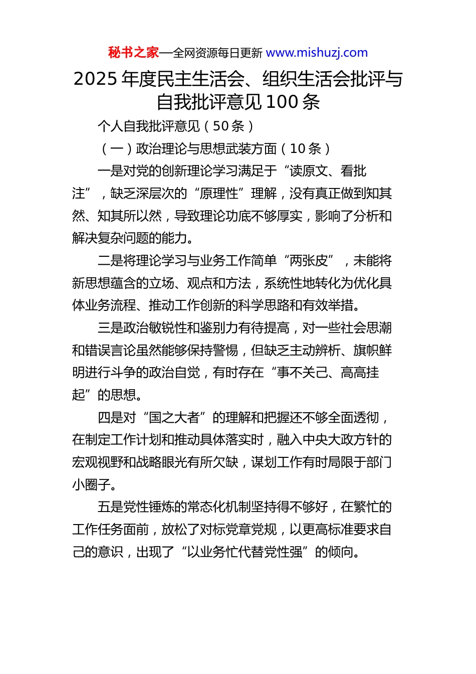 秘书之家—全网资源每日更新 www.mishuzj.com2025 年度民主生活会、组织生活会批评与自我批评意见 100 条个人自我批评意见(50 条)(一)政治理论与思想武装方面(10 条)一是对党的创新理论学习满足于“读原文、看批注”,缺乏深层次的“原理性”理解,没有真正做到知其然、知其所以然,导致理论功底不够厚实,影响了分析和解决复杂问题的能力。二是将理论学习与业务工作简单“两张皮”,未能将新思想蕴含的立场、观点和方法,系统性地转化为优化具体业务流程、推动工作创新的科学思路和有效举措。三是政治敏锐性和鉴别力有待提高,对一些社会思潮和错误言论虽然能够保持警惕,但缺乏主动辨析、旗帜鲜明进行斗争的政治自觉,有时存在“事不关己、高高挂起”的思想。四是对“国之大者”的理解和把握还不够全面透彻,在制定工作计划和推动具体落实时,融入中央大政方针的宏观视野和战略眼光有所欠缺,谋划工作有时局限于部门小圈子。五是党性锤炼的常态化机制坚持得不够好,在繁忙的工作任务面前,放松了对标党章党规,以更高标准要求自己的意识,出现了“以业务忙代替党性强”的倾向。秘书之家—全网资源每日更新 www.mishuzj.com六是理论学习的系统性不强,碎片化阅读和即时性了解多,缺乏对马克思主义经典著作、党史党建理论的深度研读和思考,导致理论根基不够稳固。七是未能定期开展严肃的自我“政治体检”,对自身思想上的苗头性、倾向性问题发现不及时、纠正不彻底,存在一定的“思想惰性”。八是学习成果的转化运用不够到位,在撰写调研报告、提出改革建议时,理论的支撑和指导作用未能充分体现,停留于现象描述,缺乏深刻的理论穿透力。九是面对新形势下意识形态领域的复杂斗争,主动发声和引导的能力不足,未能有效利用自身专业优势和岗位平台,为党的声音占领舆论阵地贡献更大力量。十是执行政治纪律和政治规矩,虽然在大是大非上始终坚定,但在一些细节和小事上,如信息发布、言谈举止等方面,还存在放松警惕、不够严谨的问题。(二)担当作为与攻坚克难方面(12 条)一是工作缺乏前瞻性思维和系统谋划,多是“跟着任务走、围着问题转”,没有形成一套行之有效的长远发展蓝图,致使工作被动,难以实现高质量跨越发展。二是在推进重点难点工作时,存在求稳怕乱思想,习惯于沿用老经验、老办法,缺乏打破常规、敢于冒风险、先行先试的改革锐气和创新精神。三是攻坚克难的韧劲不足,对于涉及多方利益协调的“硬骨头”问题,容易产生畏难情绪,有时在第一轮推进秘书之家—全网资源每日更新 www.mishuzj.com受阻后,未能及时调整策略、持续加压,导致工作推进力度减弱。四是满足于面上工作和一般性要求,对标一流、追求卓越的意识不强,工作的完成度多是“合格线”以上,离“优秀线”的标准尚有差距。五是对于分管领域内干部队伍中存在的慵懒散、慢作为等现象,批评教育失之于宽、失之于软,缺乏必要的政治压力传导和严格的监督问责。六是专业能力提升与时代要求不匹配,对新知识、新领域的学习投入不足,专业本领“新陈代谢”慢,影响了在复杂工作环境中驾驭全局的能力。七是责任划分不够清晰彻底,在与部门协作配合时,存在“等等看”“靠一靠”的思想,缺乏主动跨前一步、主动承担责任的担当精神。八是落实中央和上级决策部署,有时存在“一刀切”的机械执行,没有充分结合本地本部门实际情况,导致政策落地效果与预期有所偏差。九是对于工作中的失误和不足,有时未能第一时间深入剖析根源,而是倾向于解释客观原因,影响了真抓实改的速度和彻底性。十是管理方式较为粗放,对下属工作授权多、指导少、过程监督跟进不足,未能及时发现并纠正偏差,影响了团队的整体效能。秘书之家—全网资源每日更新 www.mishuzj.com十一是缺乏对标先进、自我革新的勇气,不善于跳出本部门、本行业看问题,导致视野受限,提出的创新举措不够接地气、缺乏引领性。十二是风险意识和底线思维还需强化,在推进创新业务时,对潜在的法律风险、廉政风险和舆情风险评估不够充分,导致应对准备不足。(三)宗旨意识与服务群众方面(10 条)一是深入基层调研的频率和深度不够,存在“为...