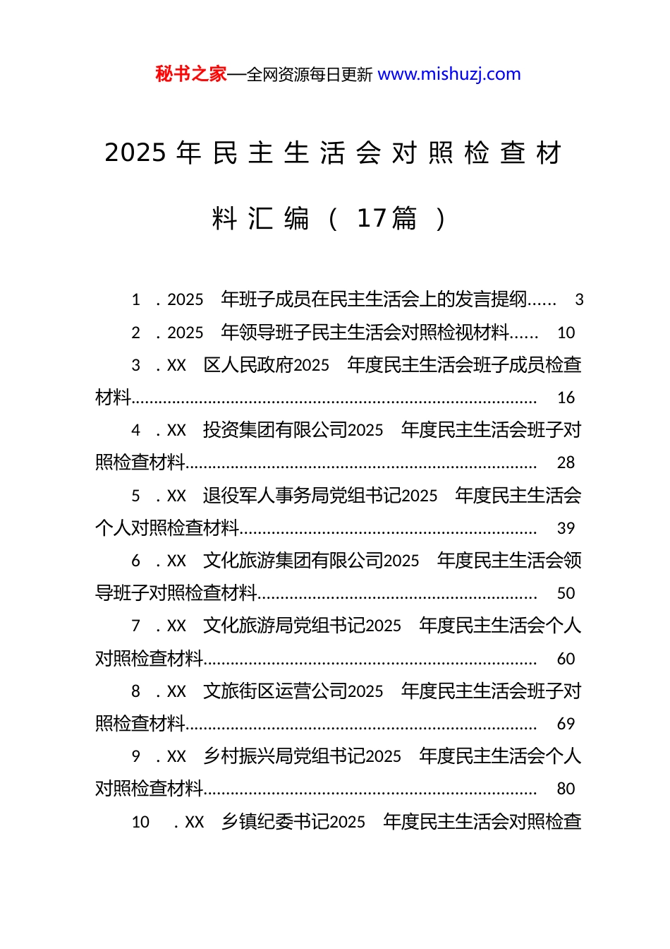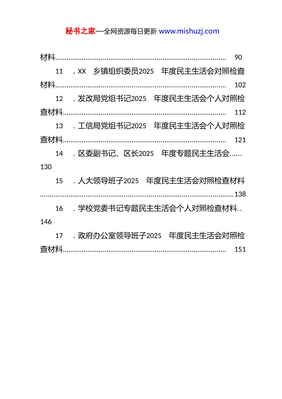 秘书之家—全网资源每日更新 www.mishuzj.com2025 年 民 主 生 活 会 对 照 检 查 材料 汇 编 ( 17 篇 )1 .2025年班子成员在民主生活会上的发言提纲......32 .2025年领导班子民主生活会对照检视材料......103 .XX区人民政府2025年度民主生活会班子成员检查材料.........................................................................................164 .XX投资集团有限公司2025年度民主生活会班子对照检查材料.............................................................................285 .XX退役军人事务局党组书记2025年度民主生活会个人对照检查材料.................................................................396 .XX文化旅游集团有限公司2025年度民主生活会领导班子对照检查材料.............................................................507 .XX文化旅游局党组书记2025年度民主生活会个人对照检查材料.........................................................................608 .XX文旅街区运营公司2025年度民主生活会班子对照检查材料.............................................................................699 .XX乡村振兴局党组书记2025年度民主生活会个人对照检查材料.........................................................................8010.XX乡镇纪委书记2025年度民主生活会对照检查秘书之家—全网资源每日更新 www.mishuzj.com材料.........................................................................................9011.XX乡镇组织委员2025年度民主生活会对照检查材料.........................................................................................10212.发改局党组书记2025年度民主生活会个人对照检查材料.....................................................................................11213.工信局党组书记2025年度民主生活会个人对照检查材料.....................................................................................12114.区委副书记、区长2025年度专题民主生活会......13015.人大领导班子2025年度民主生活会对照检查材料.....................................................................................................13816.学校党委书记专题民主生活会个人对照检查材料..14617.政府办公室领导班子2025年度民主生活会对照检查材料.....................................................................................151秘书之家—全网资源每日更新 www.mishuzj.com2025 年 班 子 成 员 在 民 主 生 活 会上 的 发 言 提 纲按照统一安排,紧扣这次民主生活会主题,坚持把自己摆进去、把职责摆进去、把工作摆进去,重点从5 个方面进行对照检查,查摆存在的突出问题,深刻剖析原因,明确努力方向。现将有关情况报告如下。一、存在的主要问题(一)在带头强化政治忠诚、提高政治能力方面存在的主要问题:一是学习“深化”不够。学深才能悟透,但有时候自己理论学习满足于“学过了”,没有坚持“学到底”;学习要求不够严格,虽然读了原文、听了专题辅导,但是在反反复复学上做得还不够,在学习成效和实践效果上未能达到高水准和高质量,在研读、领悟党的创新理论时,满足于掌握基本观点、基本内容,没能做到融会贯通、举一反三,在认识和把握发展形势上站位还不够高,观察时势、谋划发展、防范化解风险主动性还存在不足。在学习贯彻新思想上,比较而言,更习惯于重点思考如何用新思想推动工作、指导实践,而相对忽略了用新思想作为根本标尺经常性地自我检视、反思自省,导致在精神、作风提升上还有差距,还需要不断秘书之家—全网资源每日更新 www.mishuzj.com“内化于心”。二是工作“转化”不够。经历了深入贯彻中央八项规定精神学习教育学习,理论武装得到进一步增强,理论学习有了新的收获,但反思起来,在学以致用上还有较大差距。对于如何将党的创新理论融入到贯彻...