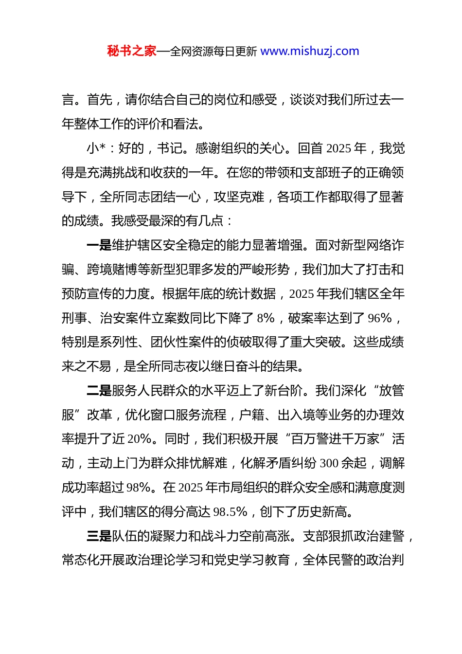 秘书之家—全网资源每日更新 www.mishuzj.com2025 年度组织生活会前谈心谈话记录 谈话时间:2026 年 1 月*日谈话地点:**派出所党员活动室谈话人:**(党支部书记)谈话对象:小*(党员民警)记录人:**(实际操作过程中选择一个点谈就可以了)按照上级党委关于召开 2025 年度基层党组织组织生活会的统一部署和要求,为确保组织生活会开出高质量、好效果,今天我和你进行一次会前的谈心谈话。主要是想听听你对支部班子和你个人在过去一年工作中的一些看法和建议,我们相互交流思想,沟通情况,坦诚相待,为开好组织生活会打下坚实的思想基础。一、回顾总结,肯定成绩,坚定发展信心(一)交流对过去一年整体工作的看法**书记:小*,你好。根据安排,我们今天谈谈心。再过不久,我们支部就要召开年度组织生活会了。这次谈话的目的,就是想听听你的真实想法,既谈工作,也谈思想;既谈成绩,也谈不足;既谈个人,也谈支部。希望你不要有顾虑,畅所欲秘书之家—全网资源每日更新 www.mishuzj.com言。首先,请你结合自己的岗位和感受,谈谈对我们所过去一年整体工作的评价和看法。小*:好的,书记。感谢组织的关心。回首 2025 年,我觉得是充满挑战和收获的一年。在您的带领和支部班子的正确领导下,全所同志团结一心,攻坚克难,各项工作都取得了显著的成绩。我感受最深的有几点:一是维护辖区安全稳定的能力显著增强。面对新型网络诈骗、跨境赌博等新型犯罪多发的严峻形势,我们加大了打击和预防宣传的力度。根据年底的统计数据,2025 年我们辖区全年刑事、治安案件立案数同比下降了 8%,破案率达到了 96%,特别是系列性、团伙性案件的侦破取得了重大突破。这些成绩来之不易,是全所同志夜以继日奋斗的结果。二是服务人民群众的水平迈上了新台阶。我们深化“放管服”改革,优化窗口服务流程,户籍、出入境等业务的办理效率提升了近 20%。同时,我们积极开展“百万警进千万家”活动,主动上门为群众排忧解难,化解矛盾纠纷 300 余起,调解成功率超过 98%。在 2025 年市局组织的群众安全感和满意度测评中,我们辖区的得分高达 98.5%,创下了历史新高。三是队伍的凝聚力和战斗力空前高涨。支部狠抓政治建警,常态化开展政治理论学习和党史学习教育,全体民警的政治判秘书之家—全网资源每日更新 www.mishuzj.com断力、政治领悟力、政治执行力得到了有效提升。大家心往一处想,劲往一处使,无论是日常巡逻防控,还是重大安保任务,都能做到召之即来、来之能战、战之必胜。(二)肯定成绩并指出努力方向**书记:你总结得很好,很全面,这些成绩的取得,离不开包括你在内的每一位同志的辛勤付出。数据是最好的证明,群众的肯定是最高的褒奖。这些成绩是我们继续前进的底气和信心所在。但同时我们也要清醒地看到,成绩属于过去,未来的挑战依然严峻。对标新时代公安工作的新要求和人民群众的新期待,我们的工作还有不少需要改进和提升的地方。这也是我们这次谈心谈话和即将召开的组织生活会需要重点解决的问题。二、对照检查,查摆问题,深刻剖析根源(一)引导个人进行自我剖析**书记:小*,你作为我们所的青年骨干,业务能力强,工作热情高,这是大家有目共睹的。但“金无足赤,人无完人”,按照“吾日三省吾身”的要求,请你结合思想、工作、作风和廉洁自律等方面,认真查摆一下自己存在哪些不足之处,并深刻剖析一下产生问题的原因。小*:谢谢书记的肯定,这更是对我的鞭策。经过认真反思,秘书之家—全网资源每日更新 www.mishuzj.com我感到自己主要存在以下几个方面的问题:一是在理论学习的深度和广度上还有差距。平时忙于接处警、办案和值班备勤,客观上挤占了学习时间。主观上对理论学习的重要性认识还不够深刻,存在“以干代学”的现象。学习习近平新时代中国特色社会主义思想和党的最新理论成果时,往往满足于通读一遍、学过一遍,但在“学懂、弄通、做实”上下的功夫不够,特别是运用党的创新理论指导实践、破解工作难题的能力还有待提高。比如,在处理一些涉及新领域、新业态的复杂警情时,偶尔会感到知识储备不足,应对起来有些吃力。二是在工作方法的...