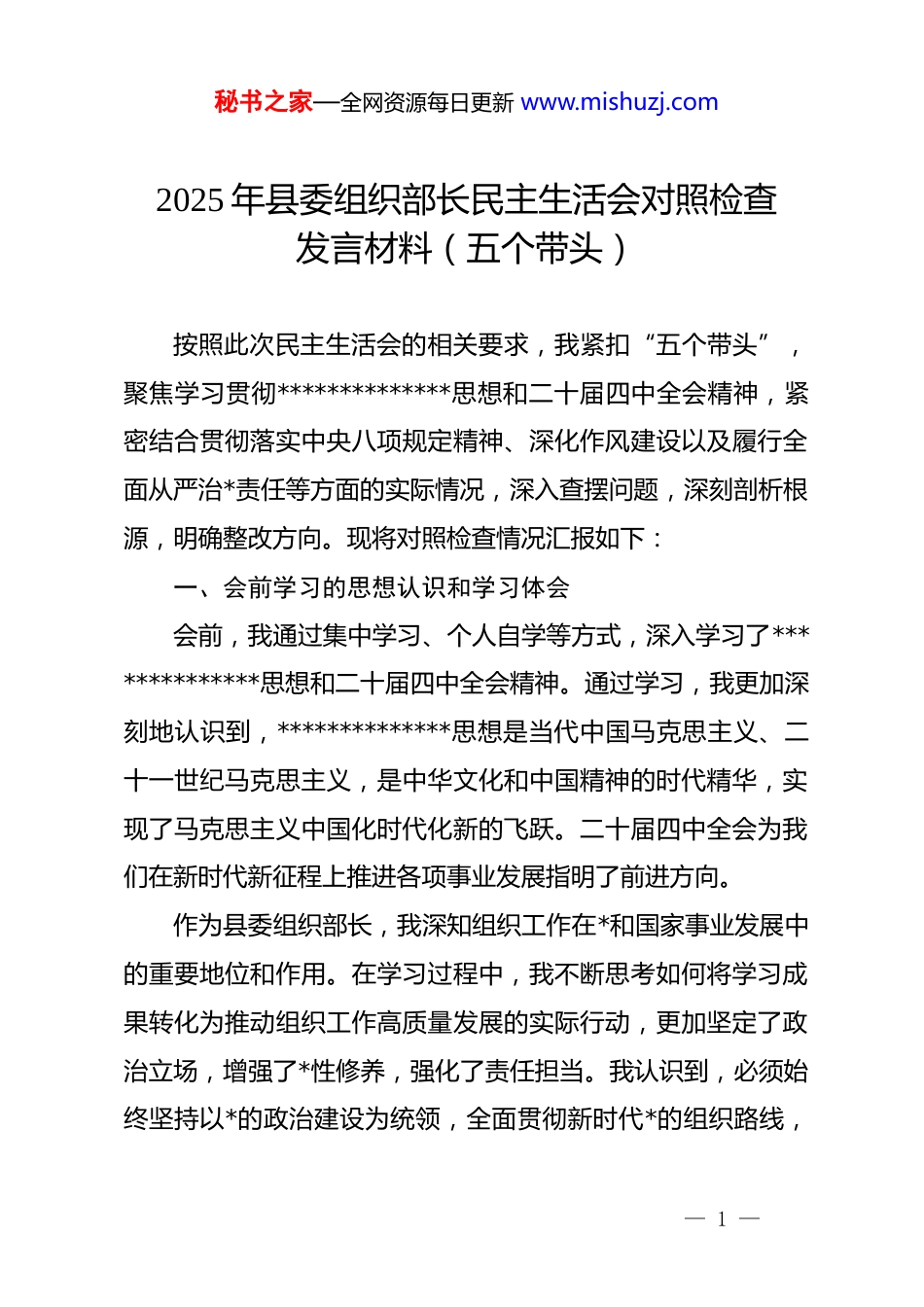秘书之家—全网资源每日更新 www.mishuzj.com2025 年县委组织部长民主生活会对照检查发言材料(五个带头)按照此次民主生活会的相关要求,我紧扣“五个带头”,聚焦学习贯彻**************思想和二十届四中全会精神,紧密结合贯彻落实中央八项规定精神、深化作风建设以及履行全面从严治*责任等方面的实际情况,深入查摆问题,深刻剖析根源,明确整改方向。现将对照检查情况汇报如下:一、会前学习的思想认识和学习体会会前,我通过集中学习、个人自学等方式,深入学习了**************思想和二十届四中全会精神。通过学习,我更加深刻地认识到,**************思想是当代中国马克思主义、二十一世纪马克思主义,是中华文化和中国精神的时代精华,实现了马克思主义中国化时代化新的飞跃。二十届四中全会为我们在新时代新征程上推进各项事业发展指明了前进方向。作为县委组织部长,我深知组织工作在*和国家事业发展中的重要地位和作用。在学习过程中,我不断思考如何将学习成果转化为推动组织工作高质量发展的实际行动,更加坚定了政治立场,增强了*性修养,强化了责任担当。我认识到,必须始终坚持以*的政治建设为统领,全面贯彻新时代*的组织路线,— 1 —秘书之家—全网资源每日更新 www.mishuzj.com为县委各项决策部署的贯彻落实提供坚强的组织保障。二、存在问题(一)带头强化政治忠诚、提高政治能力方面一是政治理论学习的深度和系统性不足:虽然积极参加各类政治理论学习活动,但在学习过程中,存在一知半解、浅尝辄止的情况。对**************思想的一些重要观点和论断,缺乏深入的研究和思考,没有真正做到学深悟透、融会贯通。例如,在学习*的创新理论时,往往只是满足于了解表面内容,没有深入探究其背后的理论逻辑和实践要求。二是政治敏锐性和鉴别力有待提高:在面对一些复杂的政治现象和社会问题时,有时不能及时、准确地识别其中的政治风险和隐患。对一些错误思潮和言论,缺乏坚决的斗争精神,没有旗帜鲜明地进行批判和抵制。比如,在网络上看到一些不实信息和不当言论时,没有第一时间站出来进行反驳和纠正。三是政治能力与新时代组织工作要求存在差距:在实际工作中,运用政治思维和政治方法解决问题的能力还不够强。在处理一些涉及组织工作的重大问题和复杂矛盾时,有时不能从政治高度进行分析和判断,导致工作效果不够理想。例如,在干部选拔任用工作中,对干部的政治素质考察还不够深入、全面,存在一定的局限性。— 2 —秘书之家—全网资源每日更新 www.mishuzj.com(二)带头固本培元、增强*性方面一是*性修养的自觉性不够:在日常工作和生活中,有时放松了对自己的要求,没有时刻以*员的高标准严格约束自己的言行。在面对一些个人利益和集体利益的冲突时,有时会出现思想动摇的情况,没有始终做到大公无私、先公后私。比如,在工作任务繁重时,偶尔会产生懈怠情绪,缺乏持之以恒的工作热情和干劲。二是*内政治生活的质量不高:虽然能够按时参加*内组织生活,但在组织生活中,有时存在形式主义的问题。批评与自我批评不够深入、坦诚,往往是避重就轻、隔靴搔痒,没有真正触及思想灵魂。例如,在民主生活会和组织生活会上,对其他同志的批评意见往往是一些无关痛痒的问题,没有指出其存在的实质性问题。三是理想信念的坚定性有所弱化:随着工作环境和生活条件的变化,有时会出现理想信念动摇的情况。对*的事业的信心和决心不够坚定,对实现中华民族伟大复兴的中国梦缺乏足够的信心和动力。比如,在面对一些困难和挫折时,容易产生消极情绪,对工作和生活失去信心。(三)带头敬畏人民、敬畏组织、敬畏法纪方面一是宗旨意识不够牢固:在工作中,有时没有真正把人民— 3 —秘书之家—全网资源每日更新 www.mishuzj.com群众的利益放在首位,没有做到想群众之所想、急群众之所急、解群众之所难。对群众的诉求和意见不够重视,缺乏主动倾听和解决问题的积极性。例如,在开展一些组织工作时,没有充分考虑群众的实际需求和感受,导致工作效果不佳。二是对组织的敬畏之心有所淡化:在工作中,有时存在个人主义和本位主义的思想,对组织的决定和安排不够坚...