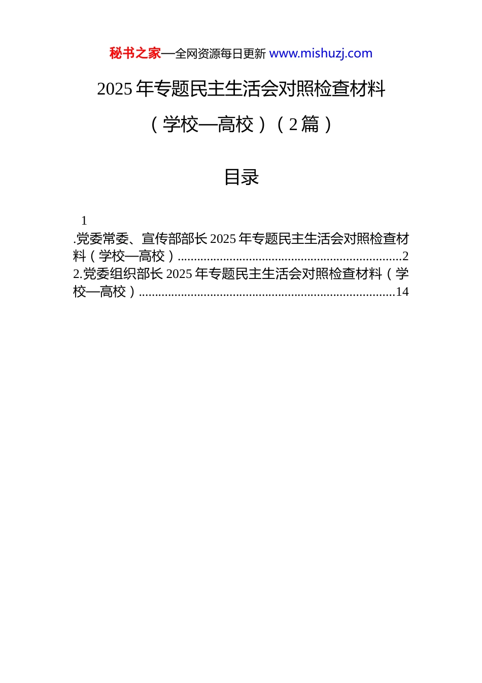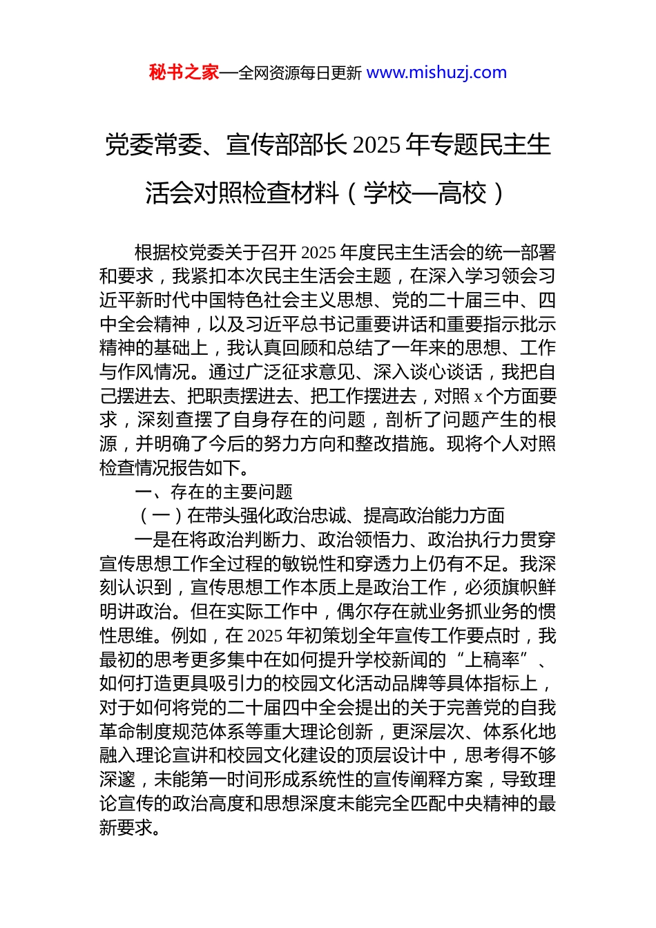 秘书之家—全网资源每日更新 www.mishuzj.com2025 年专题民主生活会对照检查材料(学校—高校)(2 篇)目录1.党委常委、宣传部部长 2025 年专题民主生活会对照检查材料(学校—高校).....................................................................22.党委组织部长 2025 年专题民主生活会对照检查材料(学校—高校)...............................................................................14秘书之家—全网资源每日更新 www.mishuzj.com党委常委、宣传部部长 2025 年专题民主生活会对照检查材料(学校—高校)根据校党委关于召开 2025 年度民主生活会的统一部署和要求,我紧扣本次民主生活会主题,在深入学习领会习近平新时代中国特色社会主义思想、党的二十届三中、四中全会精神,以及习近平总书记重要讲话和重要指示批示精神的基础上,我认真回顾和总结了一年来的思想、工作与作风情况。通过广泛征求意见、深入谈心谈话,我把自己摆进去、把职责摆进去、把工作摆进去,对照 x 个方面要求,深刻查摆了自身存在的问题,剖析了问题产生的根源,并明确了今后的努力方向和整改措施。现将个人对照检查情况报告如下。一、存在的主要问题(一)在带头强化政治忠诚、提高政治能力方面一是在将政治判断力、政治领悟力、政治执行力贯穿宣传思想工作全过程的敏锐性和穿透力上仍有不足。我深刻认识到,宣传思想工作本质上是政治工作,必须旗帜鲜明讲政治。但在实际工作中,偶尔存在就业务抓业务的惯性思维。例如,在 2025 年初策划全年宣传工作要点时,我最初的思考更多集中在如何提升学校新闻的“上稿率”、如何打造更具吸引力的校园文化活动品牌等具体指标上,对于如何将党的二十届四中全会提出的关于完善党的自我革命制度规范体系等重大理论创新,更深层次、体系化地融入理论宣讲和校园文化建设的顶层设计中,思考得不够深邃,未能第一时间形成系统性的宣传阐释方案,导致理论宣传的政治高度和思想深度未能完全匹配中央精神的最新要求。秘书之家—全网资源每日更新 www.mishuzj.com二是前瞻性应对意识形态领域风险挑战的战略预见性有待加强。面对当前意识形态领域复杂多变的形势,尤其是在网络空间,各种思潮交锋激荡,对高校师生的影响日益加深。我在工作中虽然高度重视意识形态阵地管理,建立了定期风险研判机制,但在某些方面仍存在“被动应对”多于“主动塑造”的倾向。例如,针对生成式人工智能技术对学术伦理、思想观念带来的潜在冲击,我的应对举措更多停留在制定规范、加强审查等“防守”层面,对于如何抢占先机,利用新技术主动设置议题、创新思想政治教育方式、传播主流价值观念的战略布局和实践探索稍显迟缓,未能完全做到下好先手棋、打好主动仗。三是在推动中央和自治区党委决策部署在宣传思想领域落地见效的韧劲和狠劲上尚有差距。对于上级部署的重大任务,我能够做到迅速响应、及时部署,但在持续跟踪问效、确保各项举措“一竿子插到底”方面,有时会因为日常事务繁杂而有所松懈。比如,在落实整治形式主义为基层减负长效机制中,虽然我牵头制定了精简会议文件、改进调研作风的具体措施,但在后续执行过程中,对于个别学院为了“留痕”而制作的宣传展板过多、新媒体平台内容“穿新鞋走老路”等隐形形式主义问题,没能及时进行深入的“回头看”和靶向纠治,体现了抓落实的钉钉子精神尚需进一步强化。(二)在带头固本培元、增强党性方面一是在理论学习的系统性和 转化运用上存在“温差”。作为宣传部部长,我深知理论武装的极端重要性,能够坚持参加党委理论学习中心组学习和个人自学。但静心反思,有时学习存在任务驱动的现象,满足于完成“规定动作”,对习近平新-时代中国特色社会主义思想,特别是其中的世界观和方法论,未能完全做到融会贯通、举一反三。例如,在学习习近平文化思想的过程中,我对其中的“七个着力”要求能够熟练掌握并用于指导工作部署,秘书之家—全网资源每日更新 www.mishuzj.com但对于这些要求背后深厚的历史逻辑、理论逻辑和实践逻辑,钻研得不够透彻,导致在指导学校“文映溪山”文化品牌建设时,提出的...