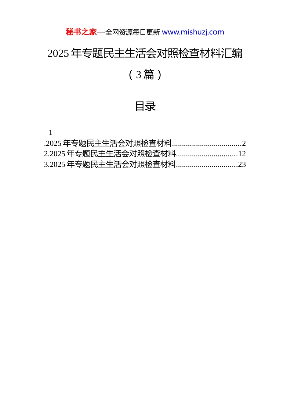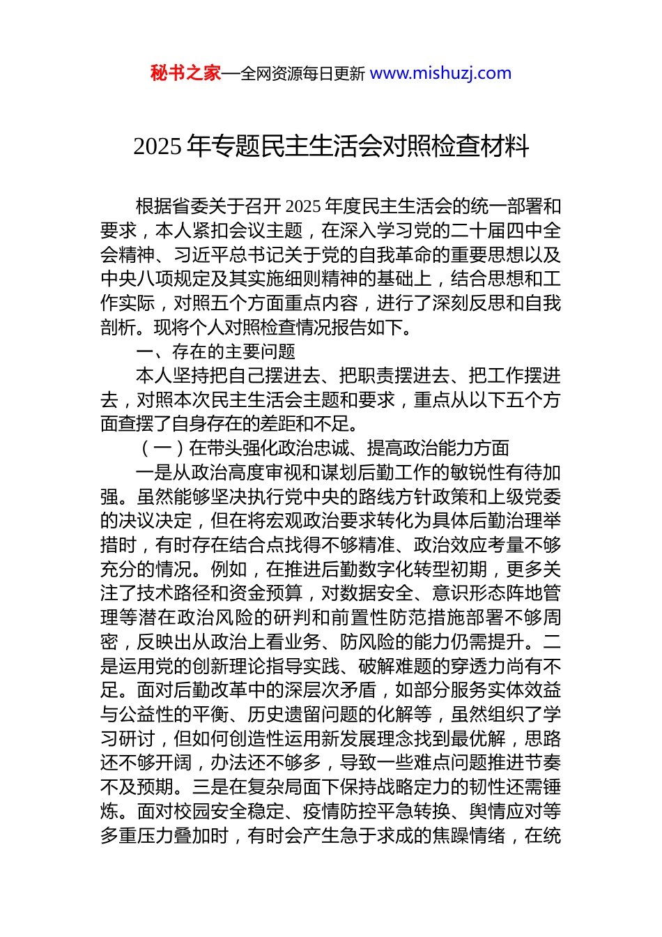 秘书之家—全网资源每日更新 www.mishuzj.com2025 年专题民主生活会对照检查材料汇编(3 篇)目录1.2025 年专题民主生活会对照检查材料...................................22.2025 年专题民主生活会对照检查材料...............................123.2025 年专题民主生活会对照检查材料...............................23秘书之家—全网资源每日更新 www.mishuzj.com2025 年专题民主生活会对照检查材料根据省委关于召开 2025 年度民主生活会的统一部署和要求,本人紧扣会议主题,在深入学习党的二十届四中全会精神、习近平总书记关于党的自我革命的重要思想以及中央八项规定及其实施细则精神的基础上,结合思想和工作实际,对照五个方面重点内容,进行了深刻反思和自我剖析。现将个人对照检查情况报告如下。一、存在的主要问题本人坚持把自己摆进去、把职责摆进去、把工作摆进去,对照本次民主生活会主题和要求,重点从以下五个方面查摆了自身存在的差距和不足。(一)在带头强化政治忠诚、提高政治能力方面一是从政治高度审视和谋划后勤工作的敏锐性有待加强。虽然能够坚决执行党中央的路线方针政策和上级党委的决议决定,但在将宏观政治要求转化为具体后勤治理举措时,有时存在结合点找得不够精准、政治效应考量不够充分的情况。例如,在推进后勤数字化转型初期,更多关注了技术路径和资金预算,对数据安全、意识形态阵地管理等潜在政治风险的研判和前置性防范措施部署不够周密,反映出从政治上看业务、防风险的能力仍需提升。二是运用党的创新理论指导实践、破解难题的穿透力尚有不足。面对后勤改革中的深层次矛盾,如部分服务实体效益与公益性的平衡、历史遗留问题的化解等,虽然组织了学习研讨,但如何创造性运用新发展理念找到最优解,思路还不够开阔,办法还不够多,导致一些难点问题推进节奏不及预期。三是在复杂局面下保持战略定力的韧性还需锤炼。面对校园安全稳定、疫情防控平急转换、舆情应对等多重压力叠加时,有时会产生急于求成的焦躁情绪,在统秘书之家—全网资源每日更新 www.mishuzj.com筹力量、久久为功的落实上,未能始终如一地保持沉着冷静,对工作的长期性、艰巨性认识需要进一步深化。(二)在带头固本培元、增强党性方面一是理论学习的系统性和转化效能有待提升。能够坚持参加集体学习和个人自学,但对习近平新时代中国特色社会主义思想,特别是其中关于教育、科技、人才、治理现代化等重要论述的体系化把握、贯通式理解还不够深入,存在“用到才学、急用才学”的现象。将学习成果转化为推动后勤“三全育人”、绿色低碳校园建设的具体行动和制度成果,转化链条还不够顺畅,理论武装“最后一公里”有待打通。二是党性修养的主动性和日常锤炼有所松懈。对照党章党规党纪进行自我检视、自我净化、自我提高的自觉性、经常性不够,有时将事务性工作忙碌作为党性锻炼减少的借口。在参加双重组织生活时,以领导干部身份进行工作指导多,以普通党员身份开展深刻思想交流、接受批评监督相对不足。三是理想信念内化于心、外化于行的标杆作用发挥不够充分。虽然自身能够坚守共产党人精神追求,但在以身作则感染和带动整个后勤队伍筑牢信仰之基、补足精神之钙方面,方式方法较为传统,针对后勤职工队伍特点的思想政治工作创新不足,运用后勤服务场景、先进典型事迹开展沉浸式、体验式党性教育探索不多。(三)在带头敬畏人民、敬畏组织、敬畏法纪方面一是深入基层一线解决师生急难愁盼问题的主动性、精准性有差距。落实“四下基层”制度有时存在“被安排”多于“主动去”的情况,调研走访虽然覆盖了食堂、公寓、物业等重点部位,但“走马观花”式了解情况仍有发生,对于师生反映的如高峰期就餐拥挤、部分老旧宿舍设施维修响应慢等“顽疾”,虽然推动解决,但未能从机制层面根治,师生满意度仍有提升空间。二是在严格执行民主集中制上,发扬民主和善于集中的结合度可以更好。秘书之家—全网资源每日更新 www.mishuzj.com在领导班子议事决策时,虽然能够遵守规则,但在一些专业性较强的议题上,有时会因自身对细节把握不深而倾向于听取分管领导意见,事前广...