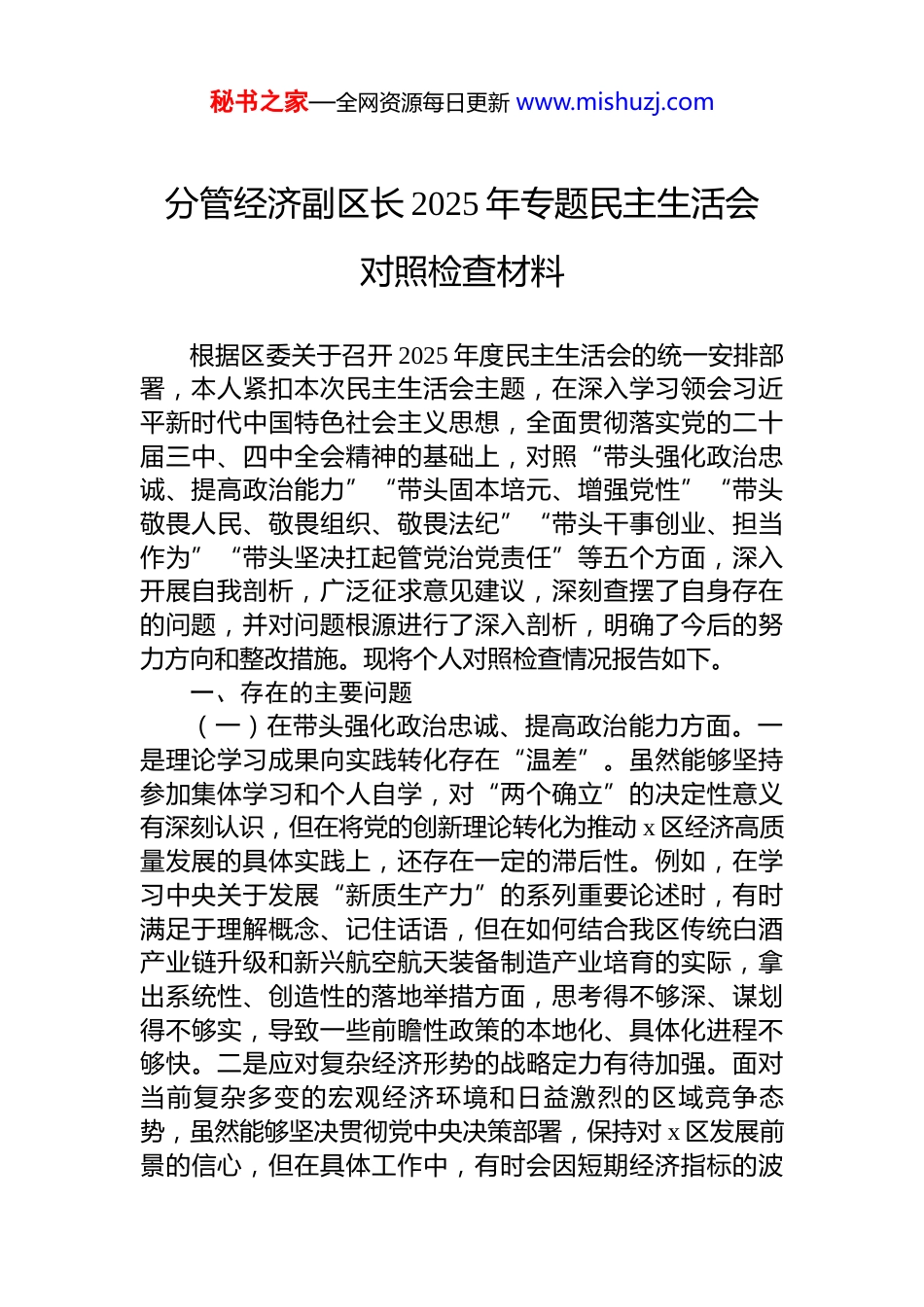 秘书之家—全网资源每日更新 www.mishuzj.com2025 年专题民主生活会对照检查材料汇编(6 篇)目录1.分管经济副区长 2025 年专题民主生活会对照检查材料.......22.分管城建副区长 2025 年专题民主生活会对照检查材料...123.分管文化旅游副区长 2025 年专题民主生活会对照检查材料...............................................................................................234.分管人大教科文卫工作市人大常委会副主任 2025 年专题民主生活会对照检查材料.......................................................355.局机关党员干部 2025 年专题民主生活会对照检查材料...466.2025 年专题民主生活会对照检查材料...............................52秘书之家—全网资源每日更新 www.mishuzj.com分管经济副区长 2025 年专题民主生活会对照检查材料根据区委关于召开 2025 年度民主生活会的统一安排部署,本人紧扣本次民主生活会主题,在深入学习领会习近平新时代中国特色社会主义思想,全面贯彻落实党的二十届三中、四中全会精神的基础上,对照“带头强化政治忠诚、提高政治能力”“带头固本培元、增强党性”“带头敬畏人民、敬畏组织、敬畏法纪”“带头干事创业、担当作为”“带头坚决扛起管党治党责任”等五个方面,深入开展自我剖析,广泛征求意见建议,深刻查摆了自身存在的问题,并对问题根源进行了深入剖析,明确了今后的努力方向和整改措施。现将个人对照检查情况报告如下。一、存在的主要问题(一)在带头强化政治忠诚、提高政治能力方面。一是理论学习成果向实践转化存在“温差”。虽然能够坚持参加集体学习和个人自学,对“两个确立”的决定性意义有深刻认识,但在将党的创新理论转化为推动 x 区经济高质量发展的具体实践上,还存在一定的滞后性。例如,在学习中央关于发展“新质生产力”的系列重要论述时,有时满足于理解概念、记住话语,但在如何结合我区传统白酒产业链升级和新兴航空航天装备制造产业培育的实际,拿出系统性、创造性的落地举措方面,思考得不够深、谋划得不够实,导致一些前瞻性政策的本地化、具体化进程不够快。二是应对复杂经济形势的战略定力有待加强。面对当前复杂多变的宏观经济环境和日益激烈的区域竞争态势,虽然能够坚决贯彻党中央决策部署,保持对 x 区发展前景的信心,但在具体工作中,有时会因短期经济指标的波秘书之家—全网资源每日更新 www.mishuzj.com动而产生焦虑情绪。在推动 2025 年一季度部分重点工业项目建设过程中,面对供应链不畅、资金紧张等突发困难,一度将主要精力放在了应急处置和“头痛医头、脚痛医脚”上,对于如何从根本上增强我区产业链韧性和抗风险能力,进行前瞻性、系统性的战略布局思考不足,未能完全做到“任凭风浪起,稳坐钓鱼船”。三是政治判断力、政治领悟力、政治执行力的贯通运用不够圆融。在执行上级决策部署时,能够做到不折不扣、令行禁止,但在深刻领悟上级战略意图、并结合分管领域工作进行创造性落实方面,有时还存在机械化、简单化的问题。比如,在落实能耗“双控”向碳排放“双控”转变的政策过程中,初期简单地将指标压力分解到重点企业,方法较为单一,未能第一时间从优化能源结构、推动绿色技术创新、发展循环经济等更高维度,去系统谋划符合 x 区长远利益的执行路径,反映出在将政治要求转化为专业化经济治理能力的水平上还有提升空间。(二)在带头固本培元、增强党性方面。一是党性锤炼的主动性和经常性有所减弱。随着工作事务日益繁忙,尤其是在招商引资和项目建设的攻坚期,有时会不自觉地将经济工作摆在首位,认为抓好经济发展就是最大的党性体现。因此,投入到党史、党章党规党纪的系统性、常态化学习时间被挤占,参加所在党支部的组织生活有时也存在“事务性”参与多、思想性交流少的现象,通过严格的党内政治生活来净化思想、锤炼党性的自觉性有所松懈,对世界观、人生观、价值观这个“总开关”的日常校准不够及时。二是在传承和发扬艰苦奋斗精神上存在不足。虽然能够严格遵守廉洁自律各项规定,但在思想深处,随着工作条件的改善,艰苦朴素、勤俭节...